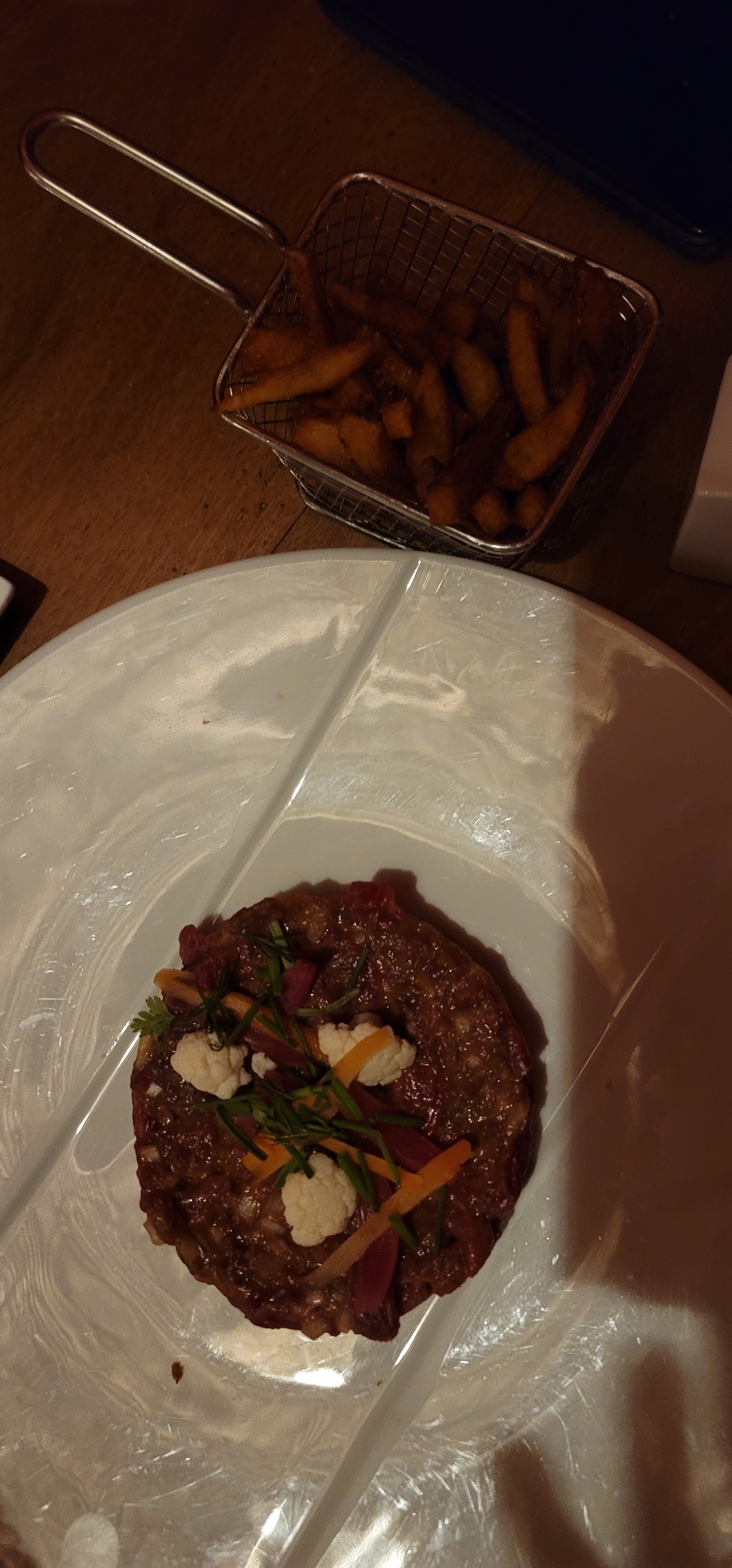 Nous sommes venus ici le 20 décembre il y a quelques semaines et avons eu une expérience agréable. On pouvait réserver une table en ligne, ce qui était utile, et nous avons été accueillis par un personnel sympathique. La nourriture était bonne dans l'ensemble, mais pas fantastique. Une seule option végétarienne pour le plat principal et c'était juste une assiette de légumes avec des pommes de terre - c'était bon, mais c'était très basique pour le prix. L'autre plat principal était le poulet, ce qui était encore une fois bon, mais c'était essentiellement cela dans l'assiette, pas de pommes de terre ni de chips, juste quelques champignons pour l'accompagner. Un amuse-bouche gratuit a été servi, ce qui était un beau geste, mais ce n'était pas végétarien et nous avions déjà mentionné lors de la commande que ma partenaire était végétarienne, elle a donc dû me regarder l'apprécier sans rien pour elle. Nous avons eu le tiramisu et les desserts sablés qui étaient tous deux fantastiques ! L'atmosphère était chaleureuse et confortable à l'intérieur et le service était excellent toute la soirée. La nourriture est légèrement décevante, mais nous recommandons quand même cet endroit.