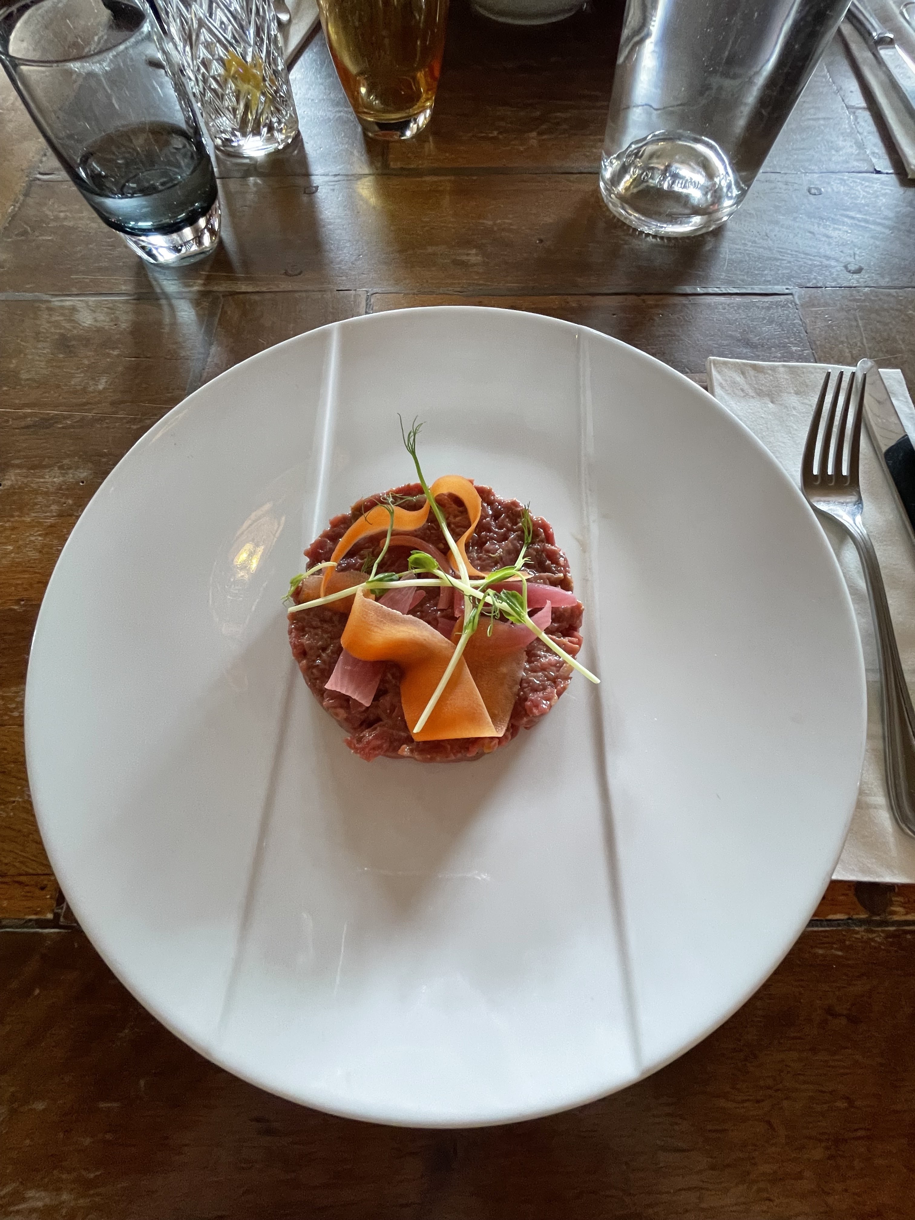 J'ai pris le tartare de bœuf avec des frites et le reste avait le plat du jour. C'était du saumon au gratin dauphinois. Pour le dessert, nous avons pris du « Chocolat », une combinaison de brownie, de ganache et de sauce au chocolat. La nourriture était très bonne et je reviendrais certainement. Même s’il n’y avait pas beaucoup d’autres tables, il a fallu un certain temps avant que notre nourriture arrive. Ils étaient très sympathiques.