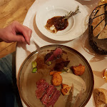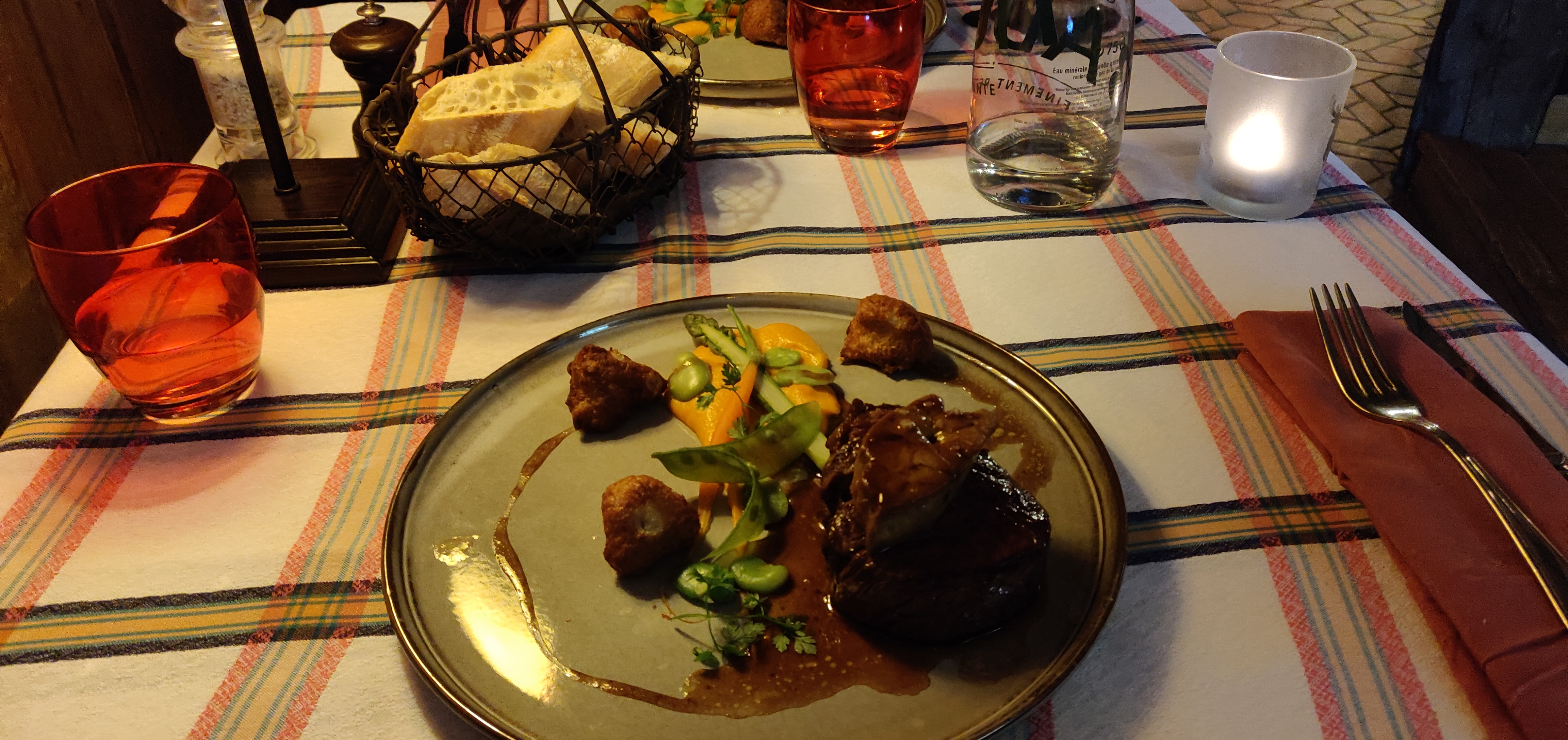 Parfait, très bon restaurant que je qualifierais de gastronomique, la première photo est une aile de pigeon frite avec du foie gras, la deuxième est un magrets de canard avec ses légumes (carottes, brocolis, panais, patates douce) ainsi qu'une sauce succulente. Il s'agissait des suggestions du jour et enfin un mont blanc à la myrtille (base meringuée, cœur myrtille, crème de marron)