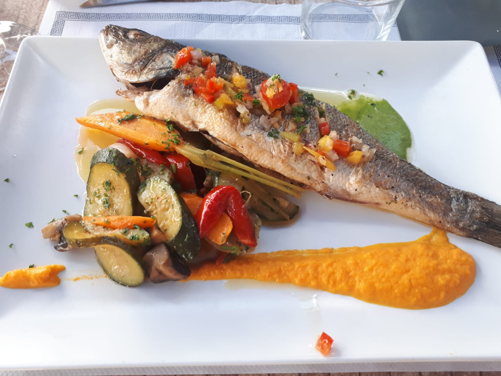 Un bar grille très bon accompagné de légumes qui même après cuisson garde leurs croquants et leurs couleurs le tout assaisonnés juste ce qu'il faut le tout frais et fait maison et le personnel souriant et très disponible. Un restaurant ou vous êtes bien reçu et où on retourne volontiers