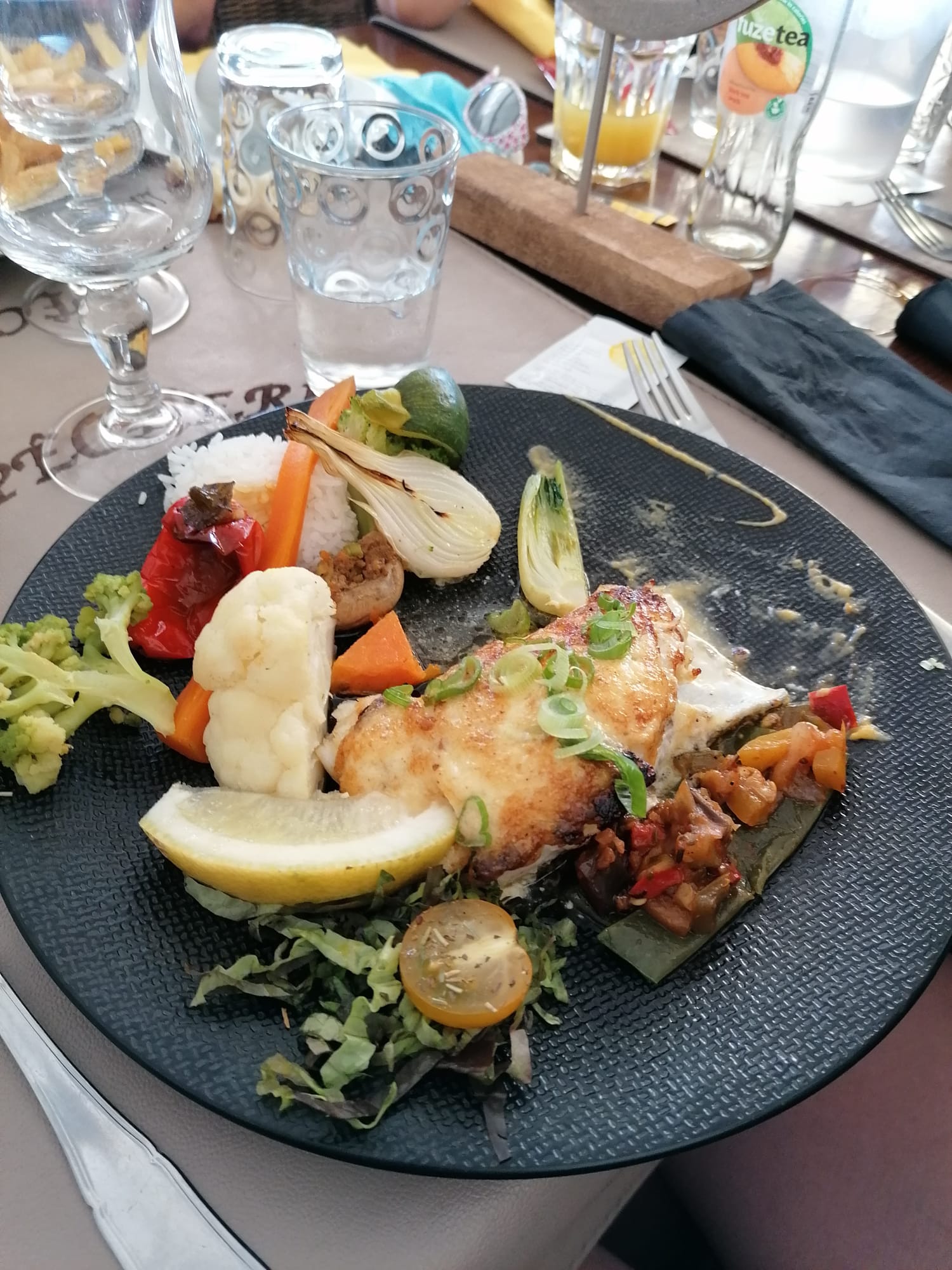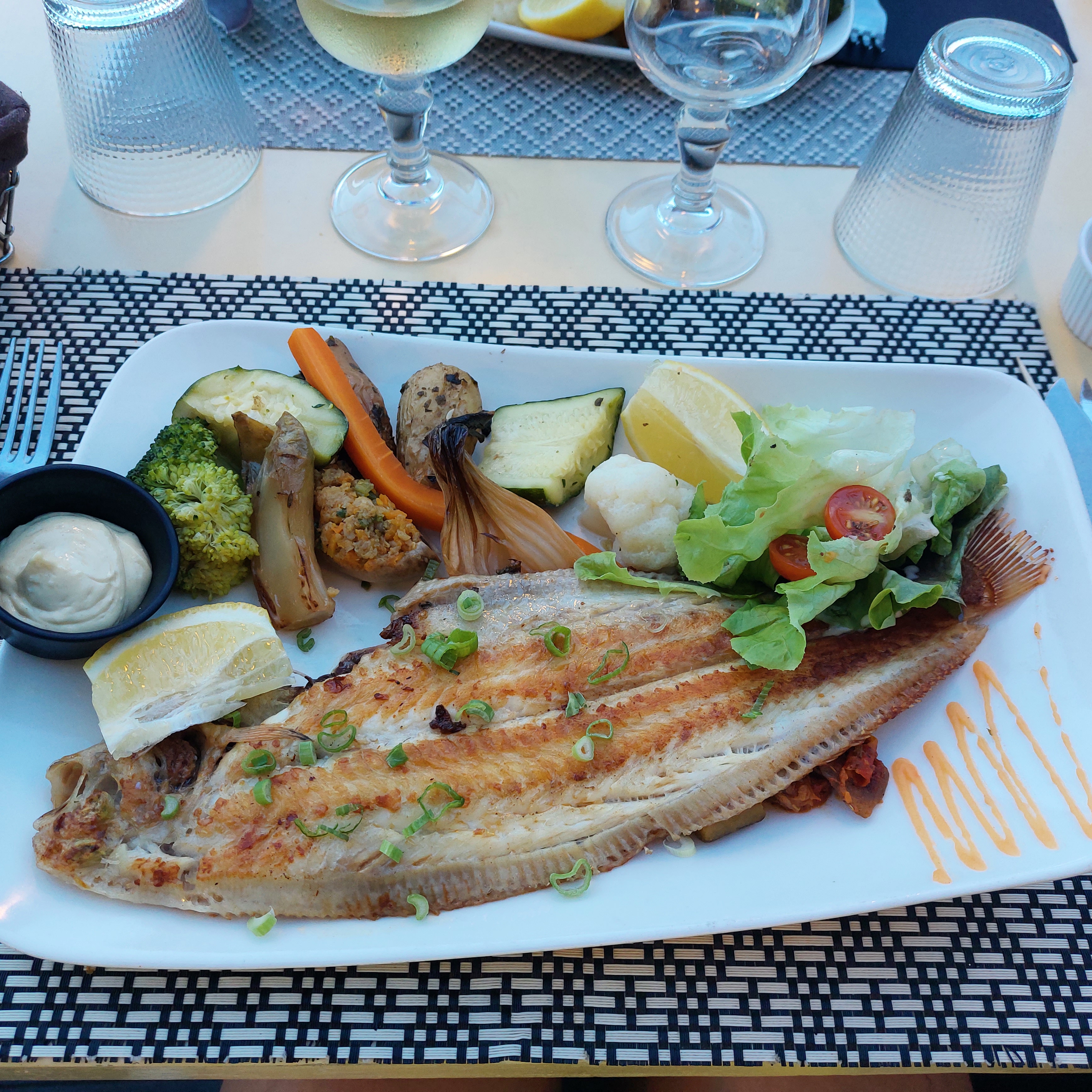 Une hérésie… soles cuitent à la plancha ! Donc pas de goût, caoutchouteuses, on pensait se régaler, de ce fait nous n’avons même pas tenté les desserts. A 28€ la sole, le cuisinier devrait faire un minimum d’effort, car même les petits légumes sont juste cuits à l’eau et c’est tout !!! Donc bof bof bof