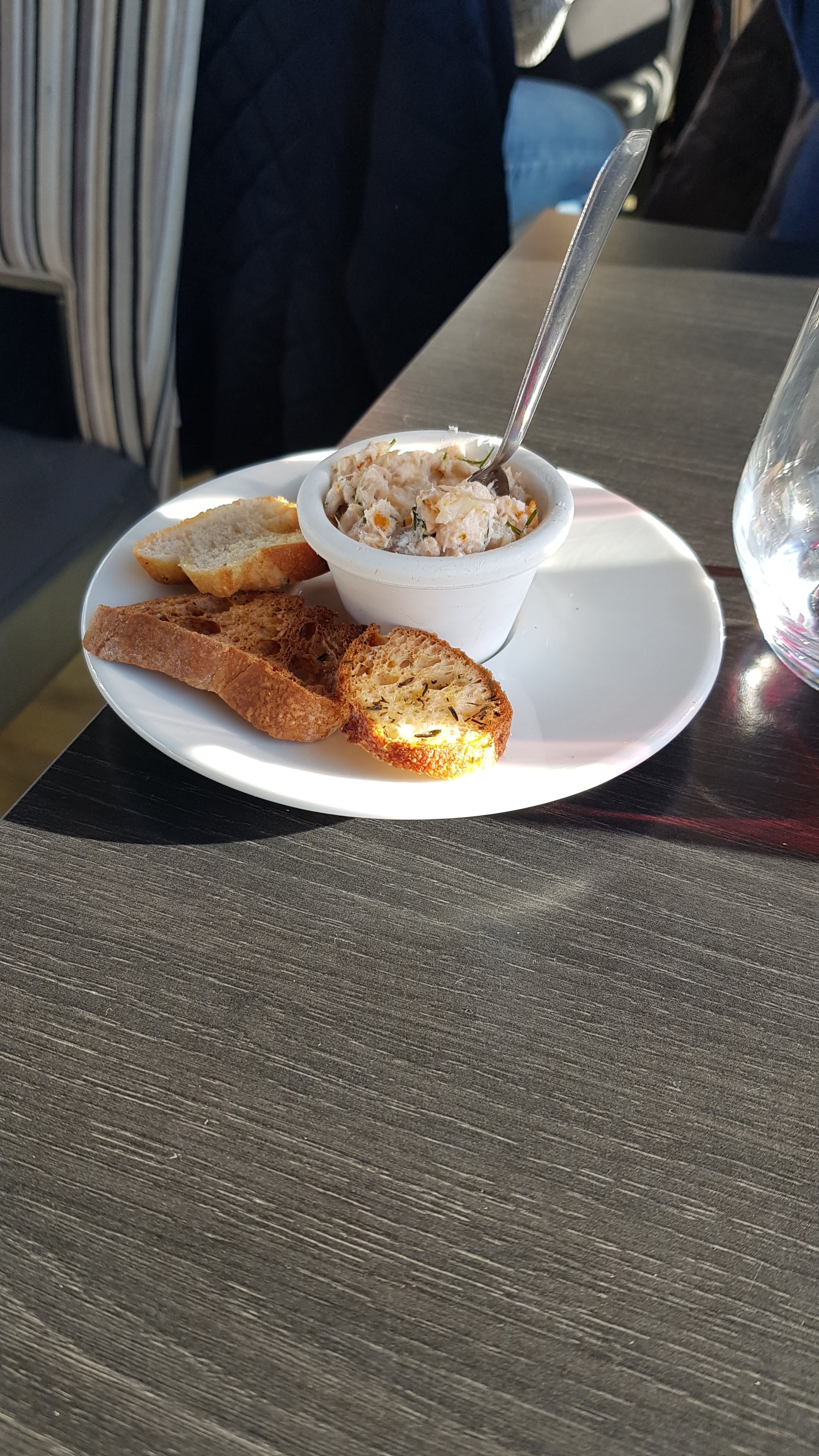 Les crostini complémentaires auraient dû être notre signe… Rassis, la tartinade sans saveur. Nous aurions dû simplement payer le vin et nous aurions dû partir. Nous aurions pu, nous aurions dû, mais nous sommes restés. Cela s’est avéré être une expérience regrettable. Nous sommes allés chercher des entrées et des plats principaux. Le gravlax sur du pain grillé n'était rien d'autre que du saumon nature sur une tranche de casino, avec de la laitue à part. La soupe de poisson était savoureuse, ce qui a permis à la moitié de notre entreprise de se remettre légèrement des crostini. Puis le plat principal : une sorte de tartare de morue, qui s'est révélé assez indéfinissable. Nous avons également commandé les 8 portions de crevettes. Je ne sais pas vraiment quelle était l’idée derrière tout cela ; trop cuit et servi sur glace. Sans saveur et glacé. Nous n'avons même pas fini le repas. Au moment du paiement, on nous a demandé si tout allait bien. Notre « mwah » a été ignoré. Quel gâchis…