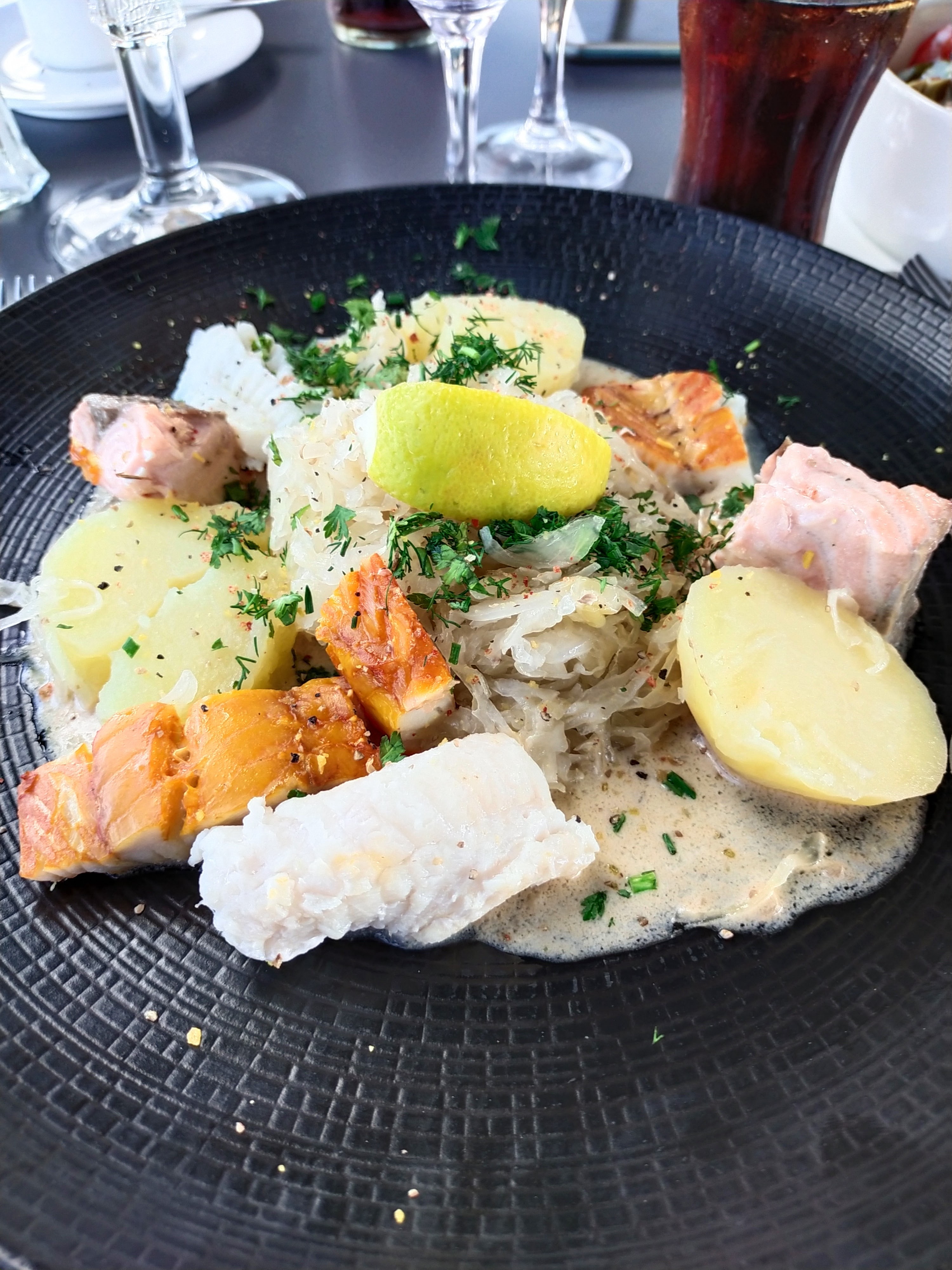 vous mangerez sur une péniche dont le lieu est soigné. mon choix s'est porté sur une choucroute de la mer qui était délicieuse. personnel sympathique