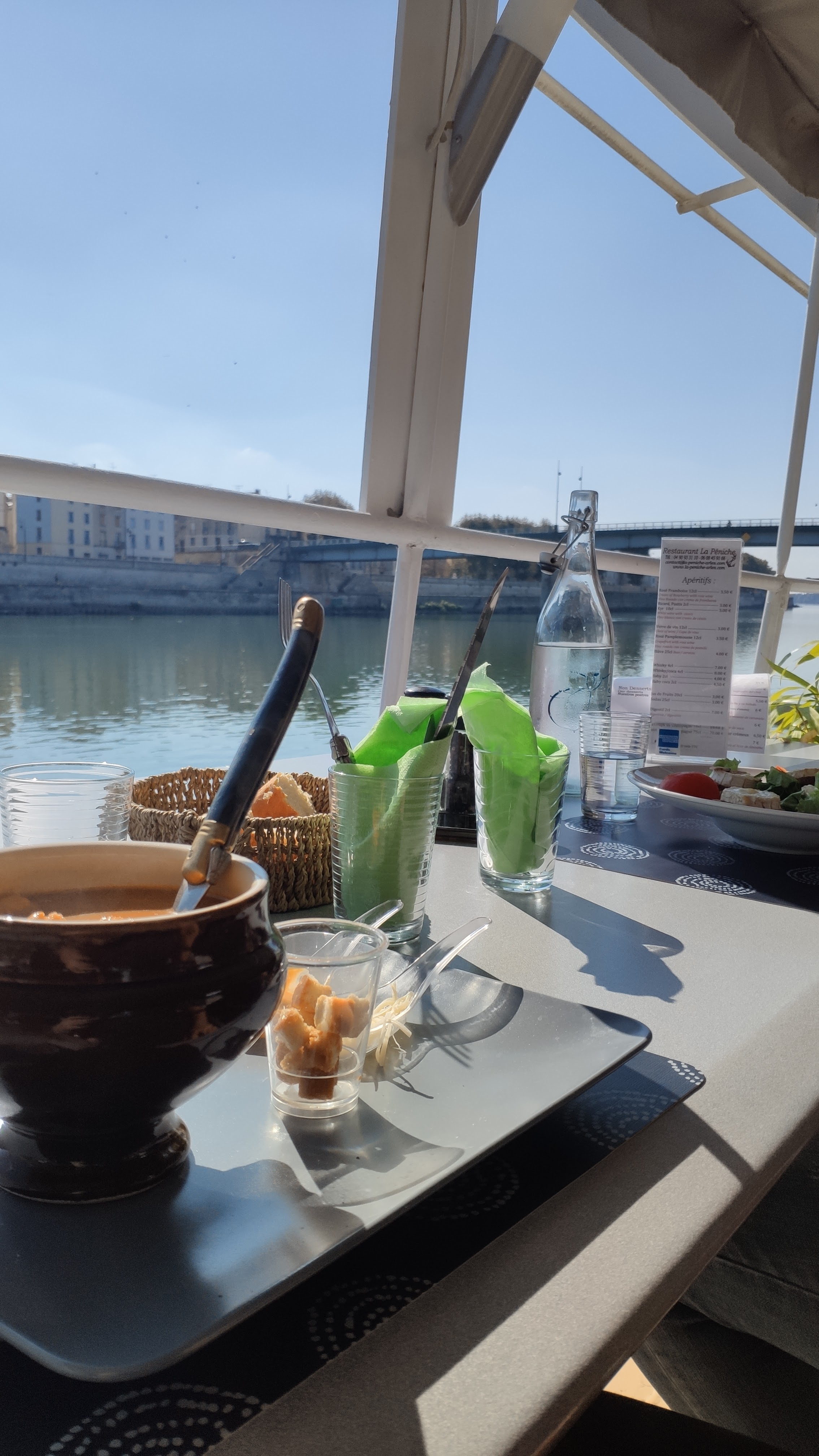 Une petite péniche très sympathique, un moment hors du temps avec une magnifique vue sur la ville d’Arles . La carte est simple les plats sont frais cuisine maison . Je recommande.