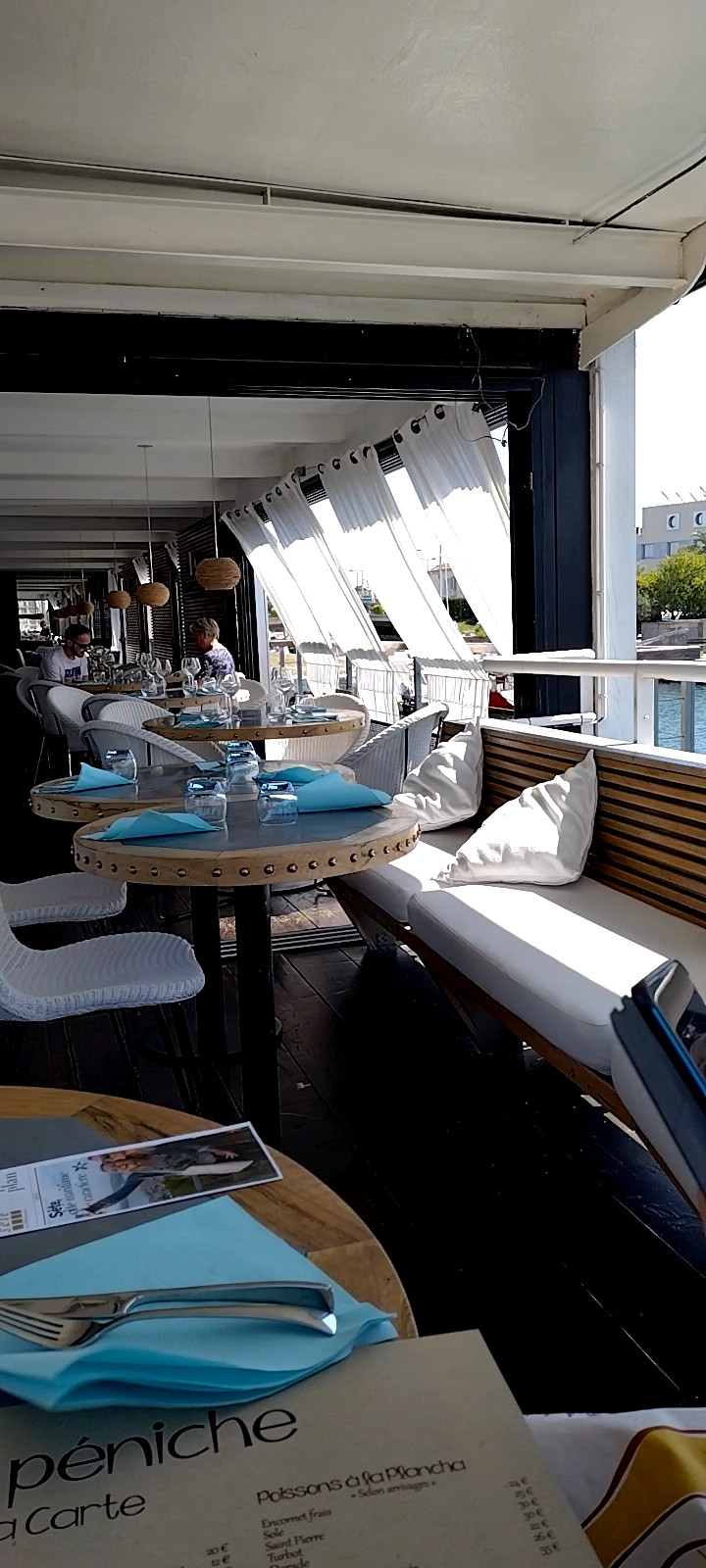 Accueil un peu surfait et ambiance m'as-tu-vu qui ne mettent pas vraiment à l'aise malgré l'environnement pittoresque et romantique. Le décor assez magique, la belle vaisselle et les bougies (faussent) sur les table ainsi que les tentures blanches sur les bords de cette péniche-restaurant contribuent à renforcer cette atmosphère romantique sur l'eau... mais le réveil est assez décevant quand arrivent les plats, corrects mais sans réelle originalité ni saveur inédite excepté le sel dans la piperade et le thon à la plancha. Jolis desserts agrémentés de trop de chantilly en bombe...