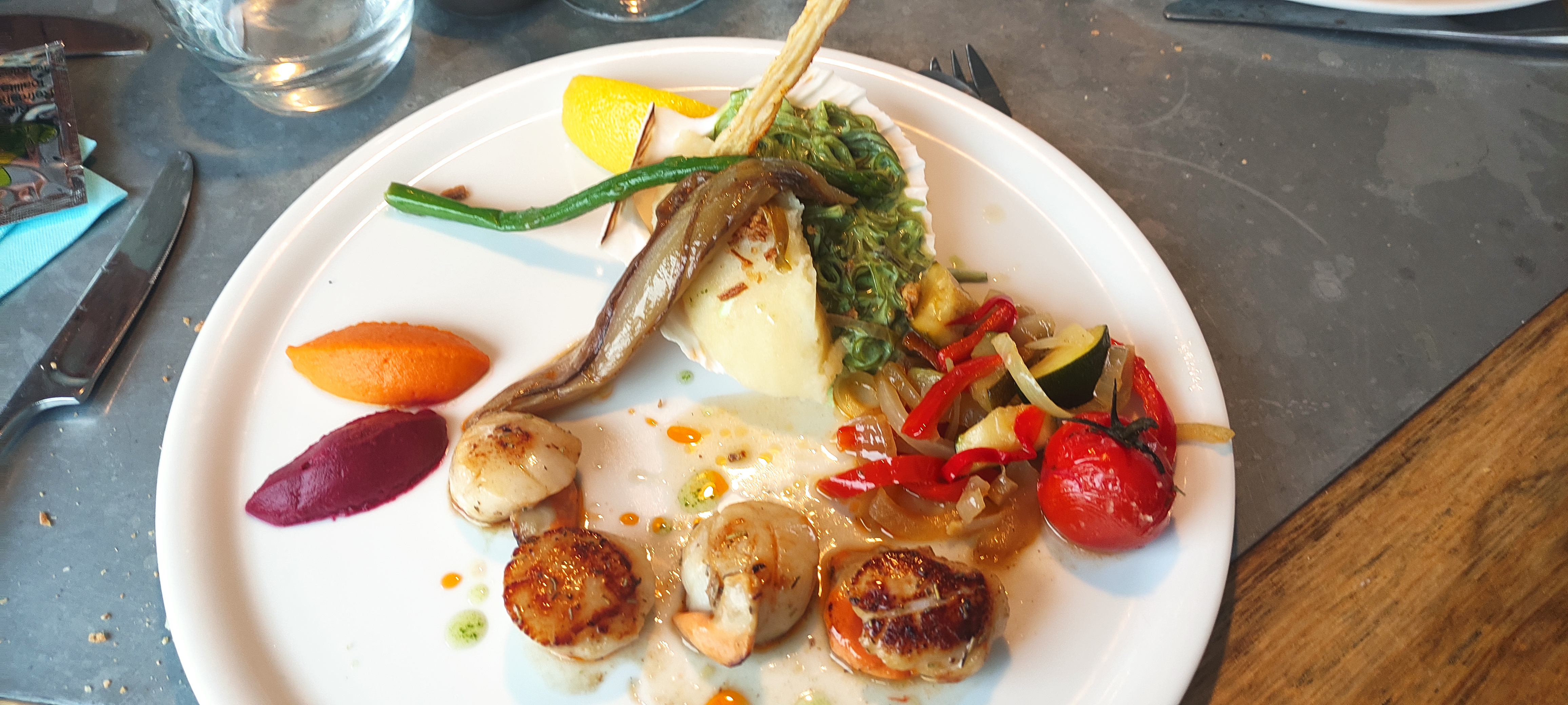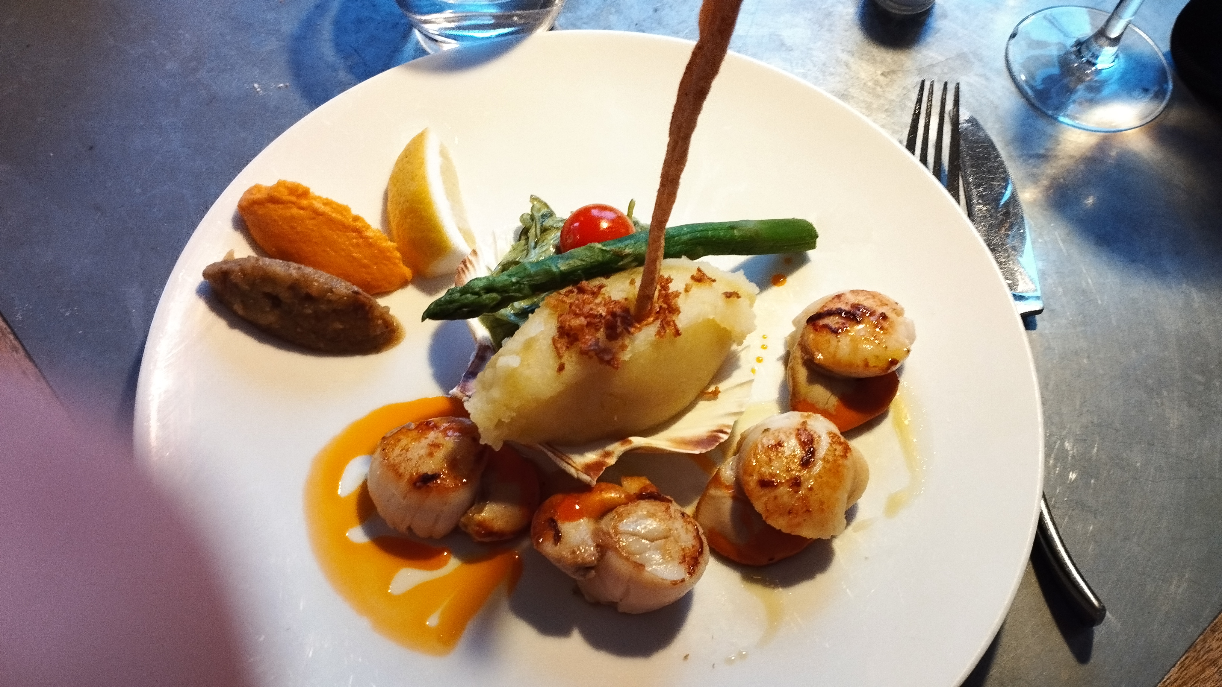Un cadre très sympathique. Serveuse très aimable. Des bons plats pleins de saveurs et bien présentés. Une noix de Saint Jacques de plus dans l'assiette n'aurait pas été de refus en revanche!