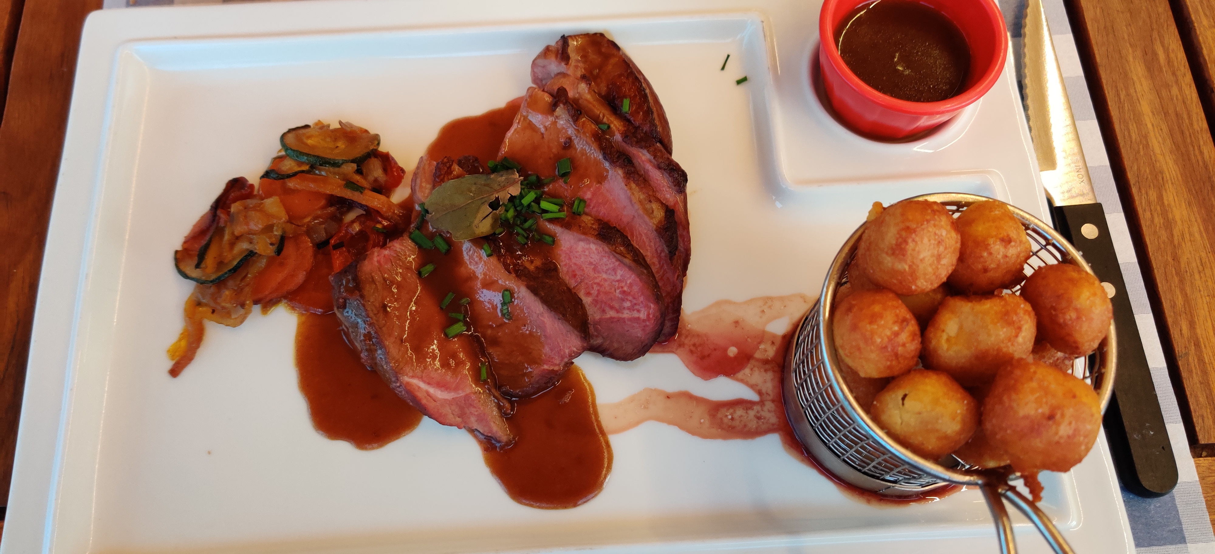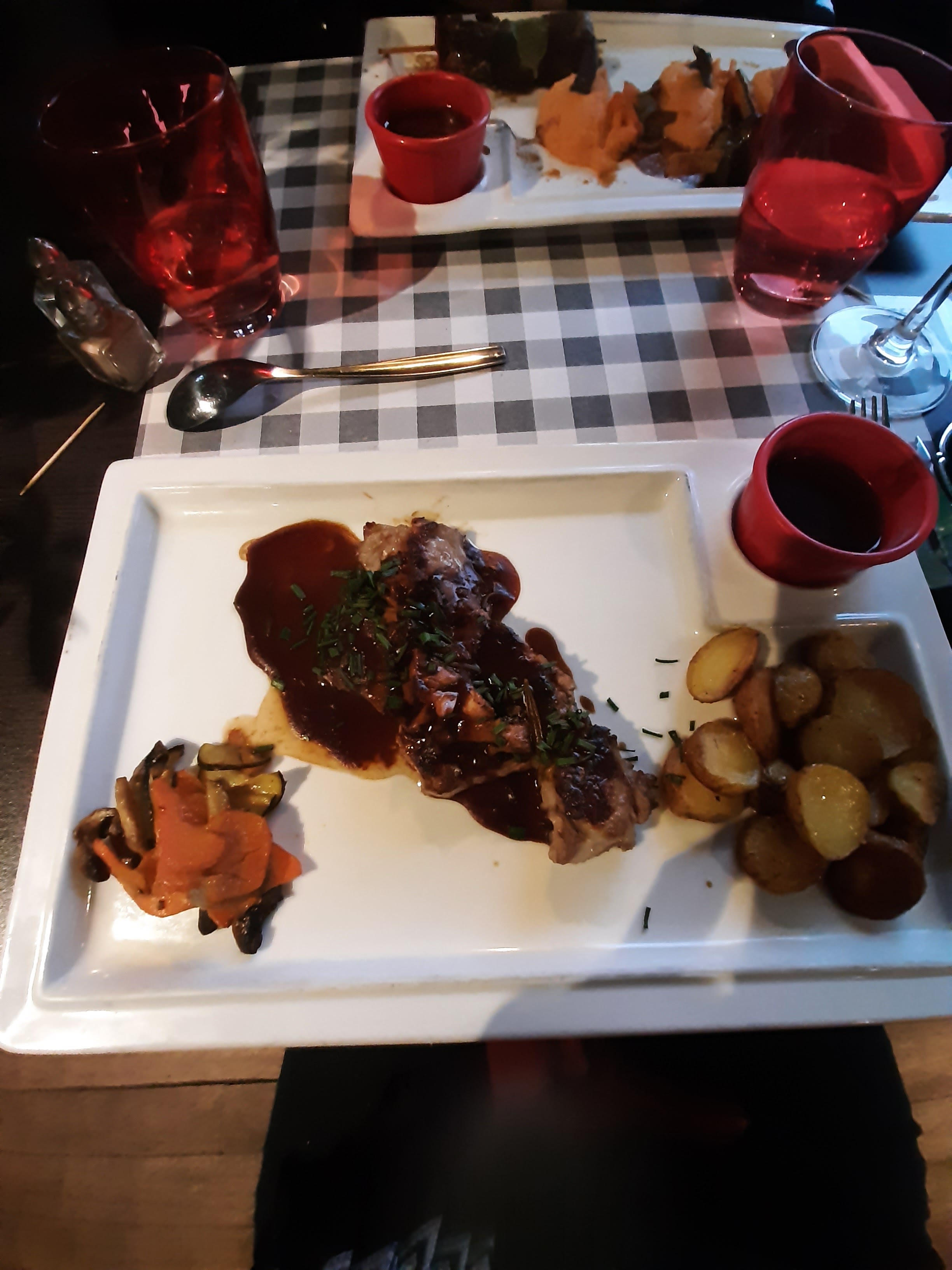Superbe expérience. Personnel serviable et efficace. Bon rapport qualité prix. La côte de veau légèrement petite et la cuisson de la brochette d'agneau un tout petit peu surcuite mais c'est le seul micro bémol du repas. Moelleux au chocolat maison et ça se voit. C'est assez rare de nos jours 👌. C'était très bon. A refaire sans hésiter lorsqu'il fera beau pour profiter de la terrasse.