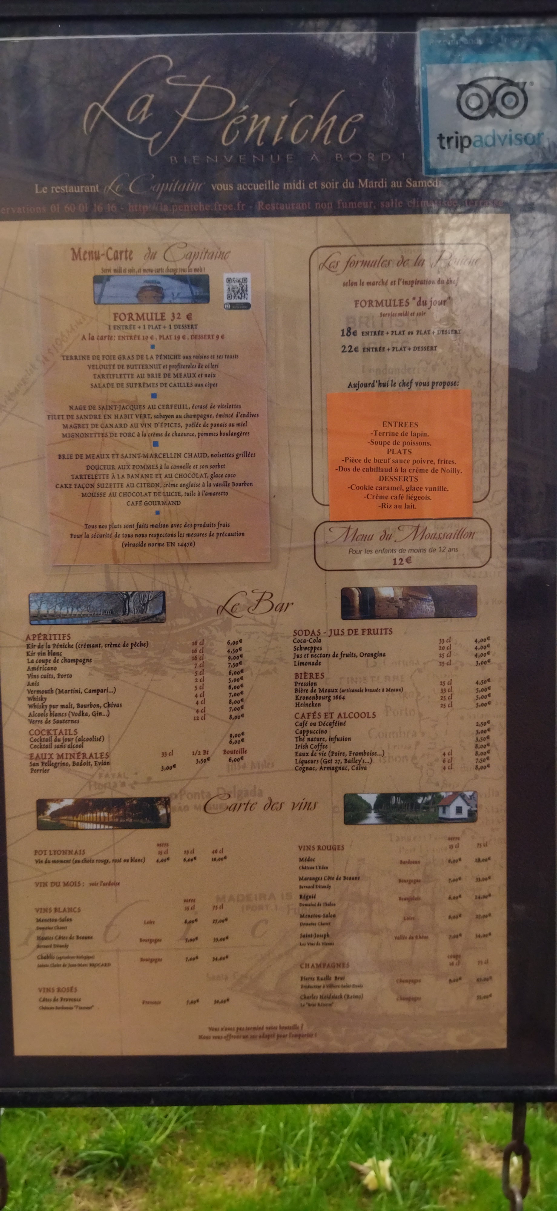 Cadre très agréable, spacieux, sur une péniche face à la vieille ville de Meaux, idéal pour un dîner romantique. Cuisine préparée à base de produits frais et plutôt locaux. Présentation des assiettes soignée. Des recettes intéressantes, assez personnelles (exemple lors de notre venue : steak d'espadon avec sauce au poivron accompagné de nouilles asiatiques avec sésame). Beaucoup de points positifs donc, si l'on excepte un service beaucoup trop long. Quelques propositions végétariennes seraient les bienvenues.
