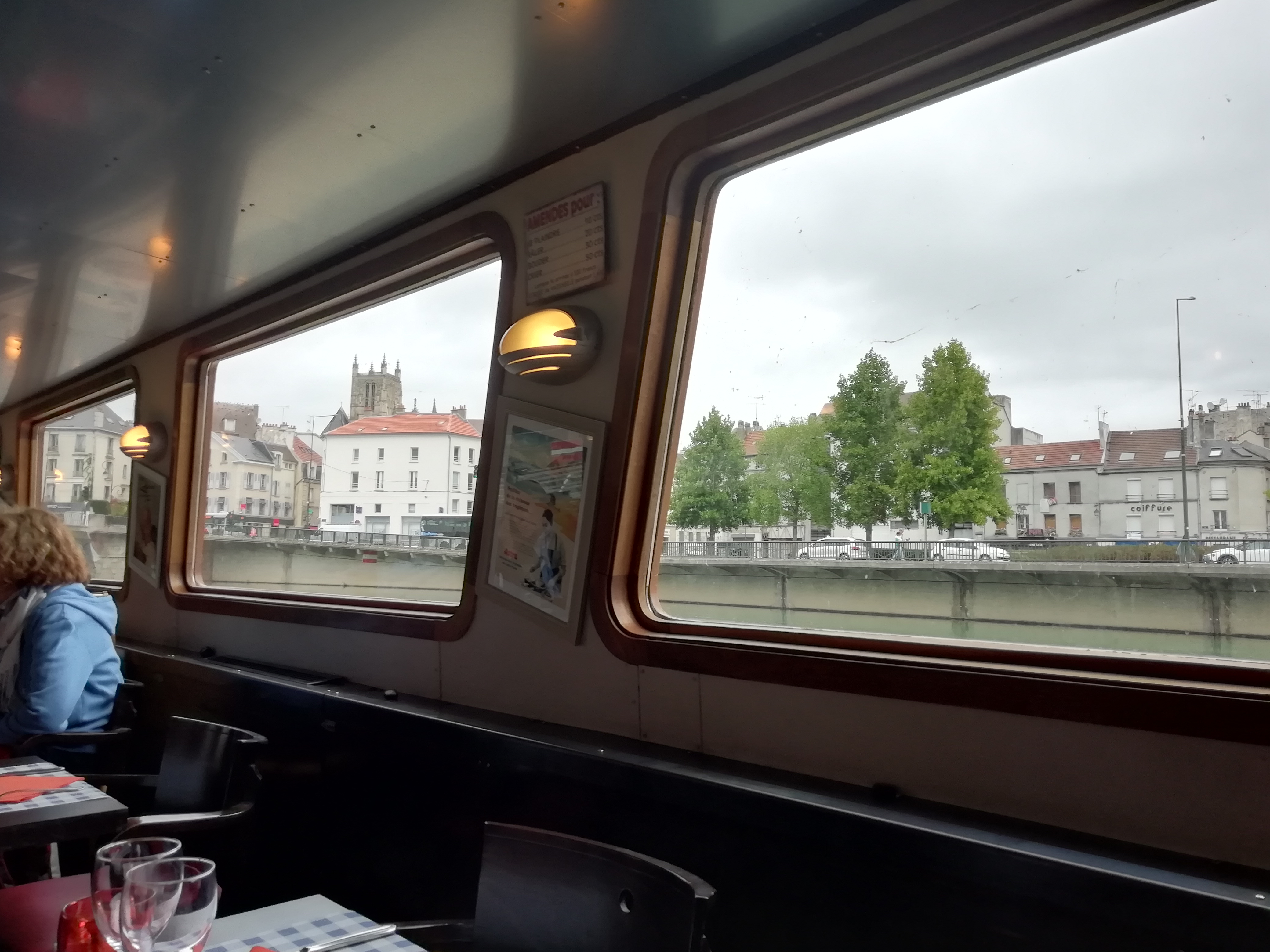Tres déçue soirée pour un anniversaire de mariage aucune petite attention on a été placé a l arrache alors que j avais réservé sur le site car impossible de les avoir au téléphone il faisait froid sur le bateau et en plus une mauvaise odeur de moisi très désagréable y règne service très long et serveurs qui ne vous adresse même pas un regard prix élevés à la carte et franchement pas terrible il y a eu plusieurs erreurs de commise et même pas un petit geste commercial Je n y retournerais pas et je ne recommande pas du tout à fuir