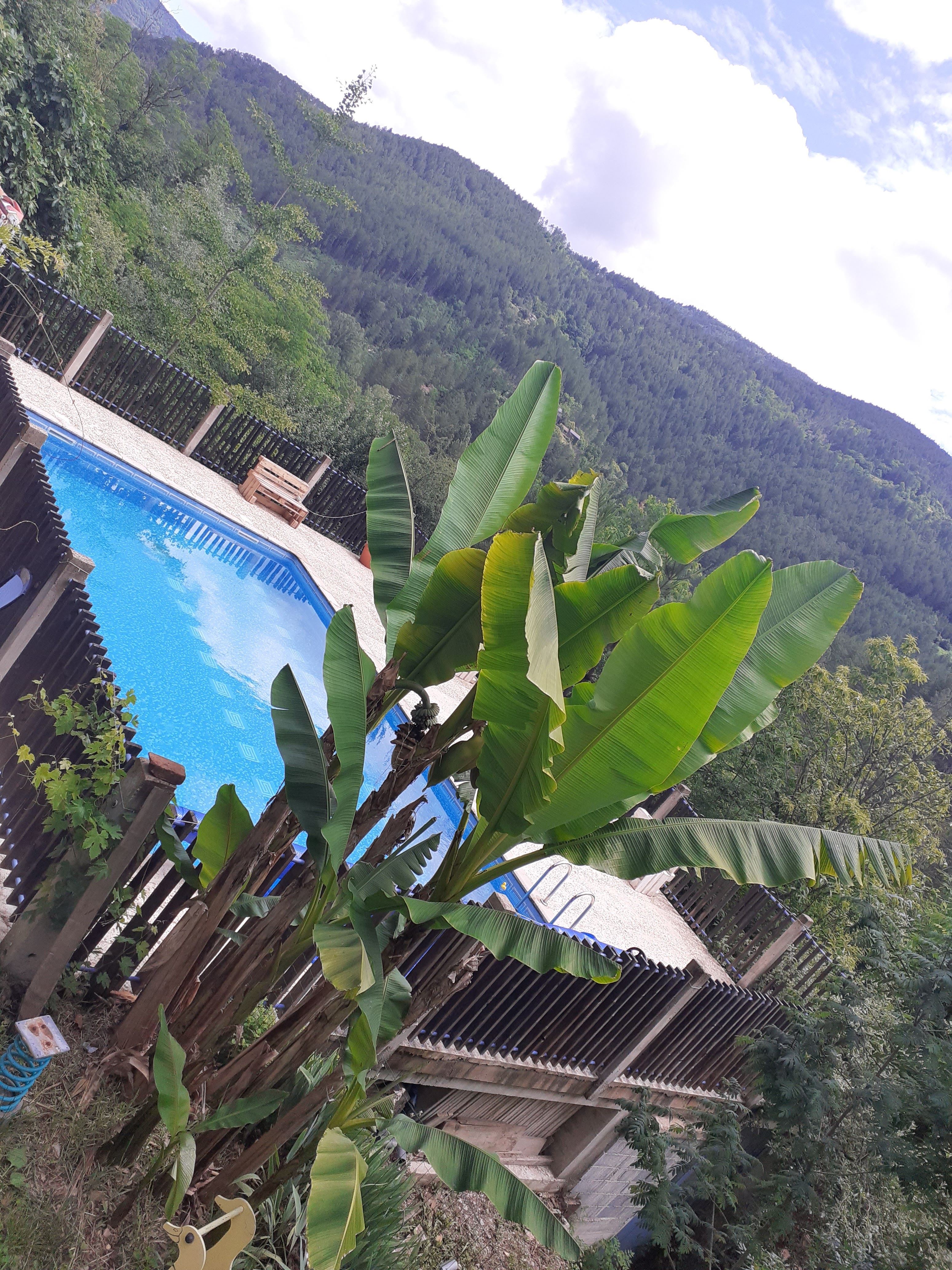 Nous nous croyons dans les îles, bananiers avec de très belles fleurs et des bananes ! Ambiance tropicale. Martine et ses enfants sont sympas et la cuisine est très bonne.