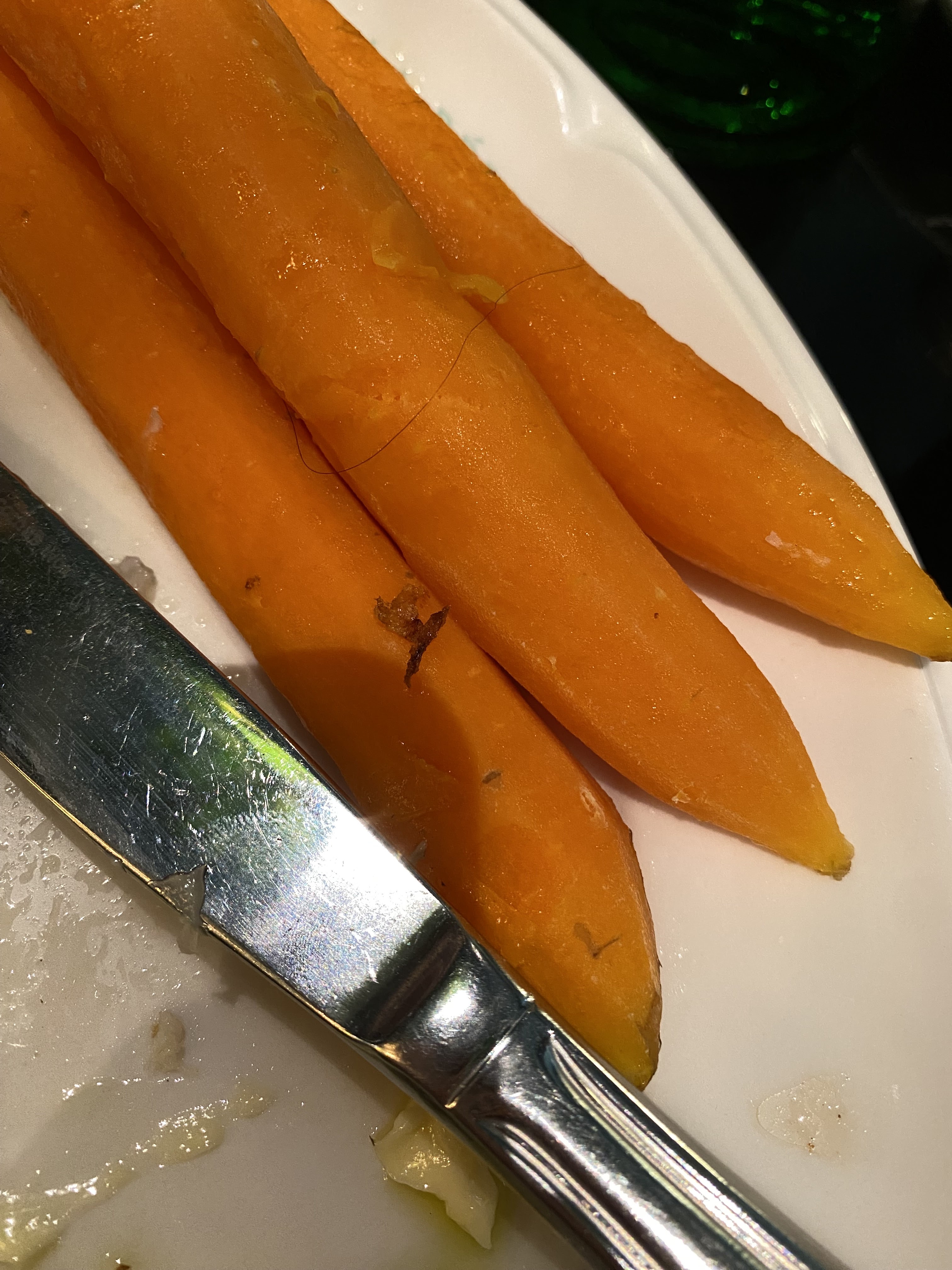 Voilà la photo des légumes dits « glacés » qui accompagnent le turbo - même chose pour la sole meunière à 48€. Des carottes vapeur mal épluchées, avec les embouts verts. Et un cheveu dessus pour couronner le tout. Établissement à fuir, dommage la déco est sympa.