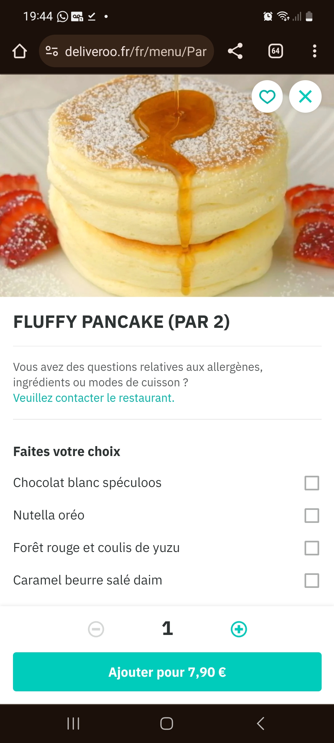Je viens de commander sur deliveroo.fr, je suis quand meme déçue, les 2 FLUFFY pancakes ne sont pas du tout epais comme sur l'annonce, esthétiquement ils on un aspect un peu frippés, en ouvrant la boite il y'a une forte odeur d'œuf, j'ai fait 1 petit cro mais impossible d'en manger plus car le fluffy pancake a un gout d'omelette, il n'y a même pas un peu d'arôme vanille ou un gout sucré. Je suis extrêmement decue de ma première commande surtout au prix que ça compte 7,90€. Le plat d'alloyau + frite, était bonne la viande n'a pas n'est pas la même quantite que sur l'annonce en reel est bien plus petite. Le new york roll est bien présenté, pas trop sucré et bon. Sur l'annonce il est mentionnée que l'intérieur est à la mascarpone vanille, on sent bien la vanille mais ça a plus un gout de crème fraîche/ crème liquide que de la mascarpone(je suis pâtissière donc travail avec ces produits), mais je me dis qu'il y'a peut-être du avoir un manque de produit, ça arrive. Pour 36€ je m'attendais à mieux ! En espérant que mon avis aidera le restaurateur, bonne continuation.