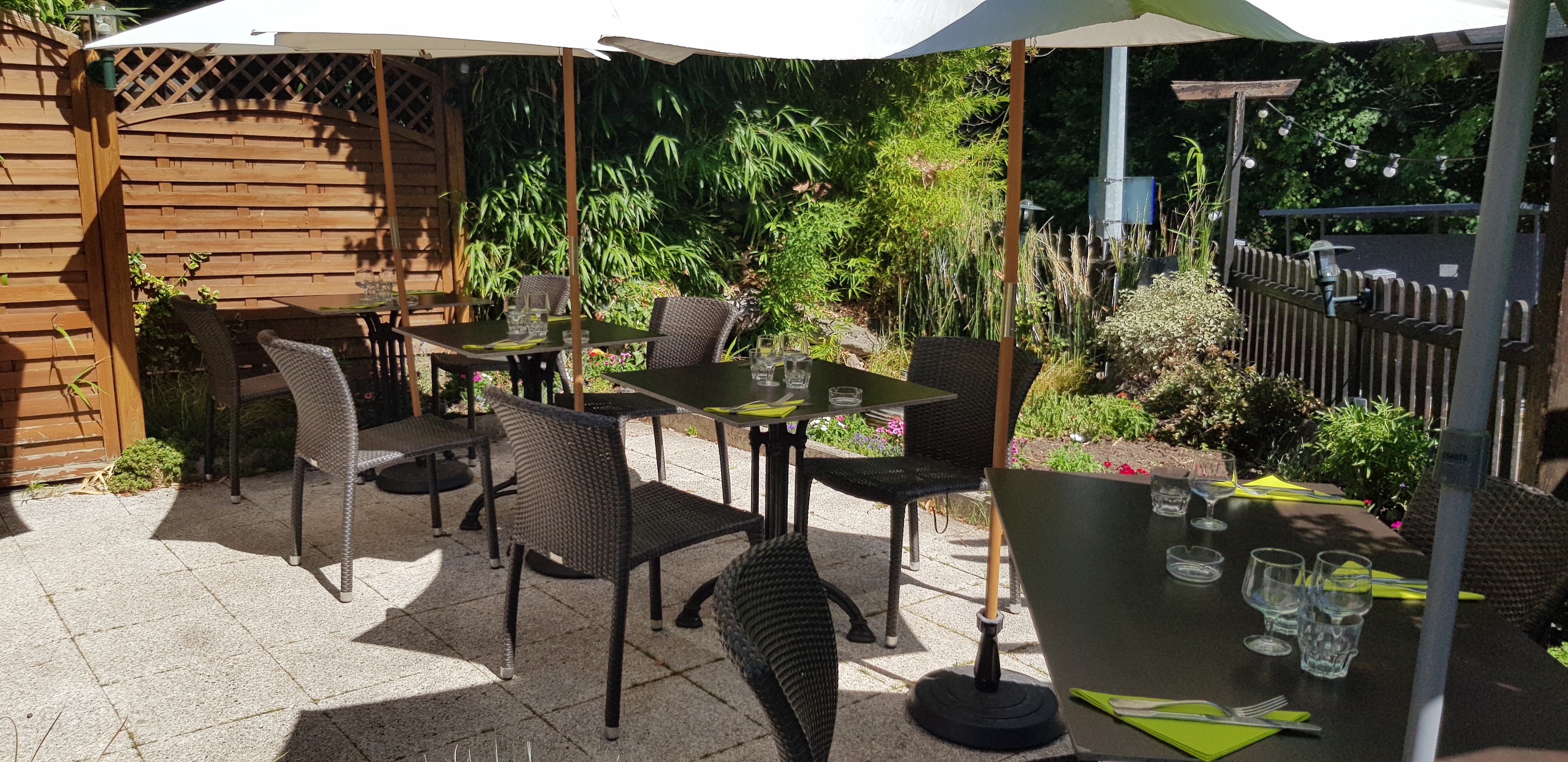 Joli lieu, etang des ursines juste derrière, tables espacées et prise en compte des gestes barrière, mets savoureux : couteaux de mer, truite ou bar, plats vegan à la demande, bons choix de vins au verre, à la carafe ou bouteille, bref j'ai adoré