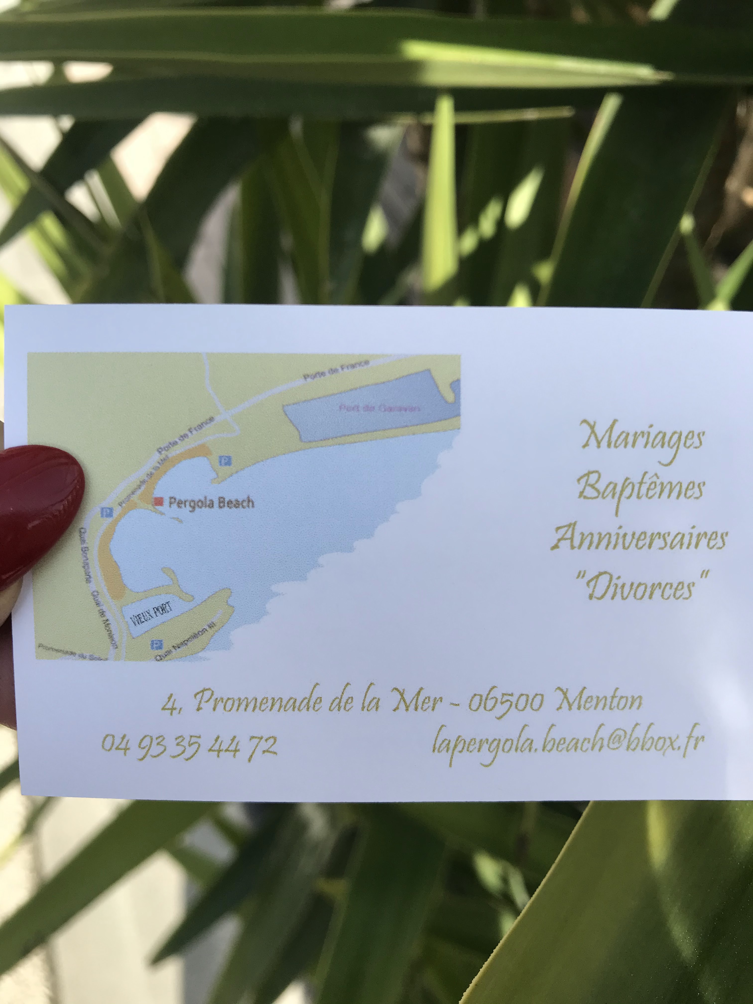 Voici toutes les informations sur le Restaurant La Pergola qui ce trouve au 4 Prom. de la Mer, 06500 Menton (06). Sur cette fiche vous trouverez les photos, l'adresse, les horaires d'ouverture, le numero de téléphone et les avis clients.Vous pouvez églement rédiger un avis si vous le souhaitez en bas de page.