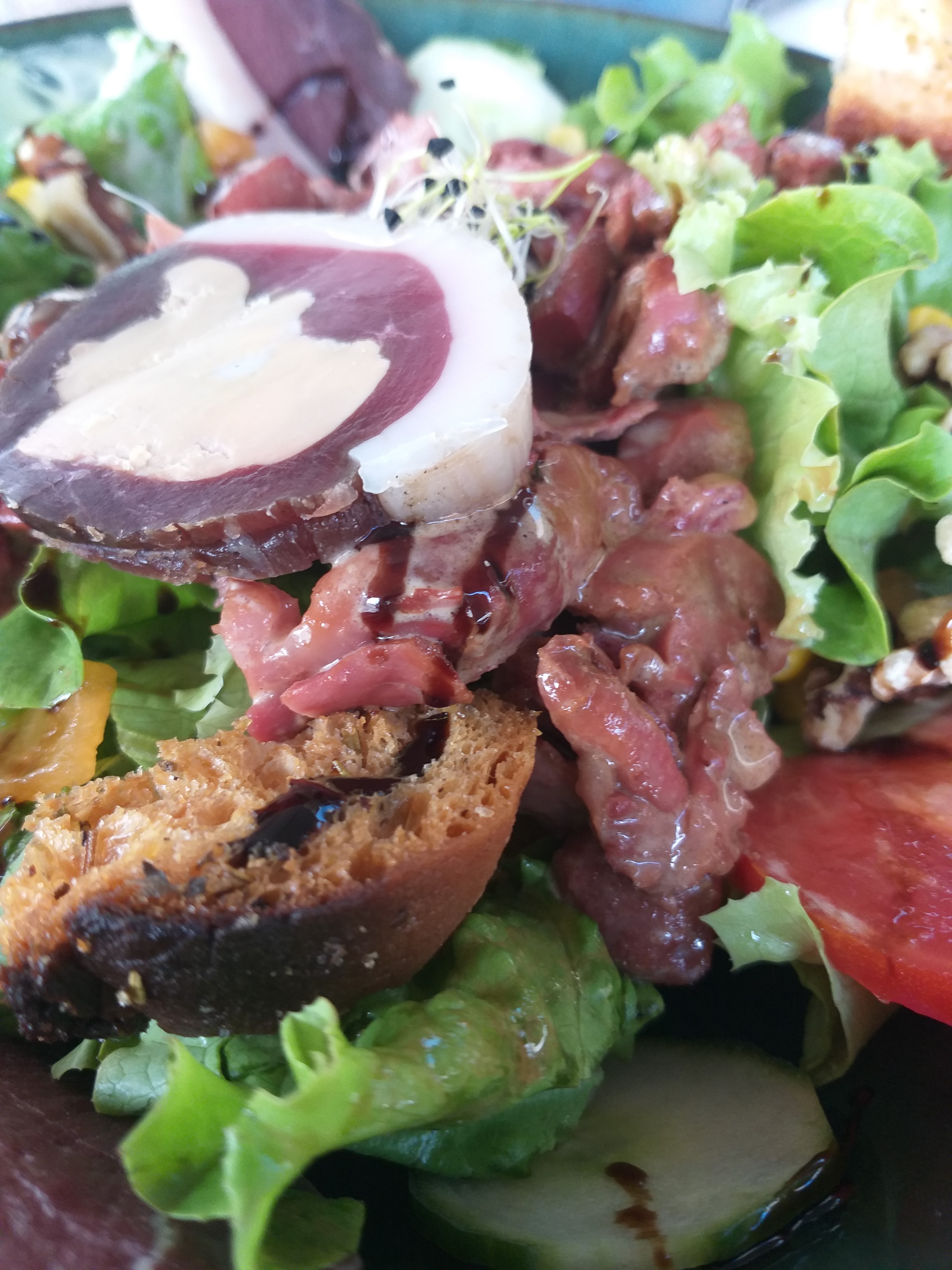 Moyen, très moyen.. j'ai hésité à mettre 2 étoiles, mais j'en mets 3 à cause du cadre (magnifique). Sinon, une salade perigourdine avec davantage de fruits(!?) que de foie gras, réduit à un tout petit rectangle, c'est dommage. Des figues, pourquoi pas, mais autant d'agrumes divers, pas vraiment aimé, surtout que ce n'est pas donné quand même. Joliment présenté, mais ça ne fait pas tout. Pas de crêpes ce jour là (?), bon, donc pas de dessert si on n'aime pas le muffin au chocolat ou le fromage blanc. J'ai vu bien mieux en rapport qualité prix en Dordogne.