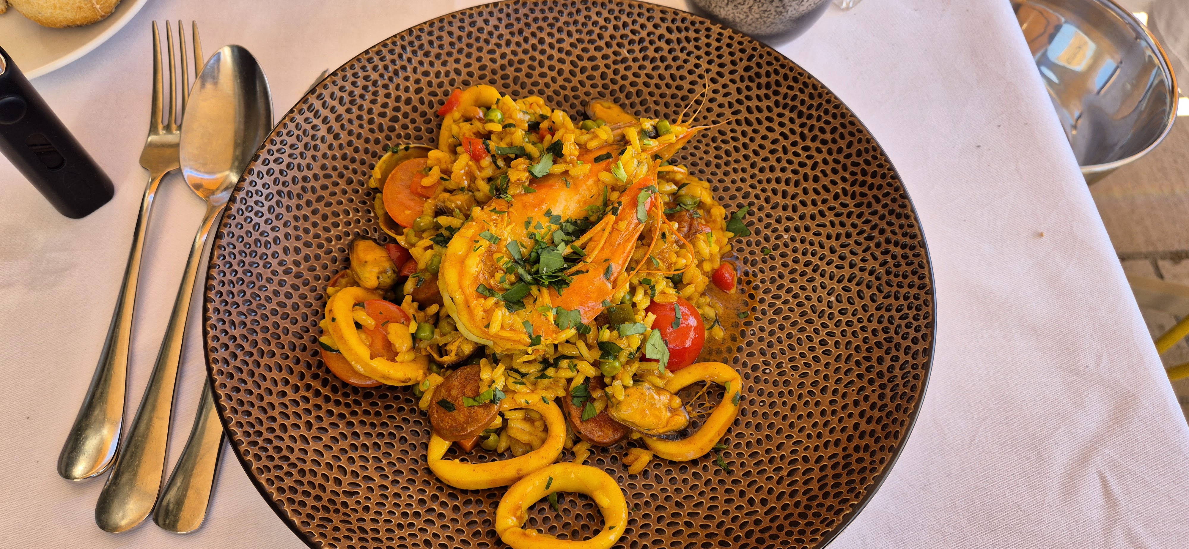 Cadre magnifique. Le plateau de fruits de mer est vraiment bon mais la paella était un peu décevante. Essayez certainement la vongole!