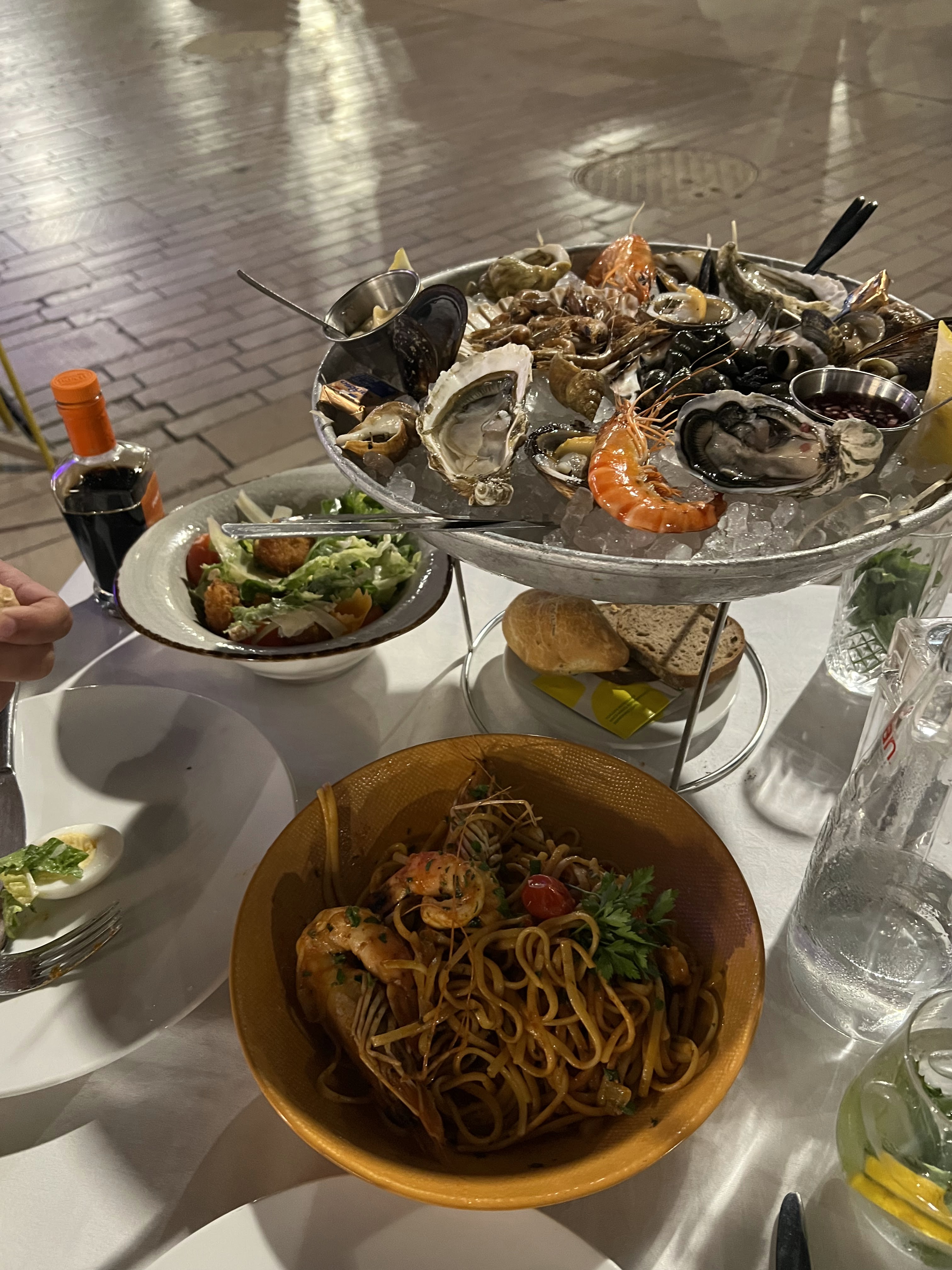 L'hôte principal était gentil mais à part ça, c'était comme si personne ne s'en souciait vraiment. Nous avons pris le plateau de fruits de mer et à part les huîtres nous n'avons pas apprécié. Il y avait beaucoup de vent et nos verres de vin sont tombés à cause de cela, il s'est répandu sur nous et le serveur préférait se retourner et partir au lieu de nous aider avec la nourriture en ruine. Je n'y retournerais pas, désolé.