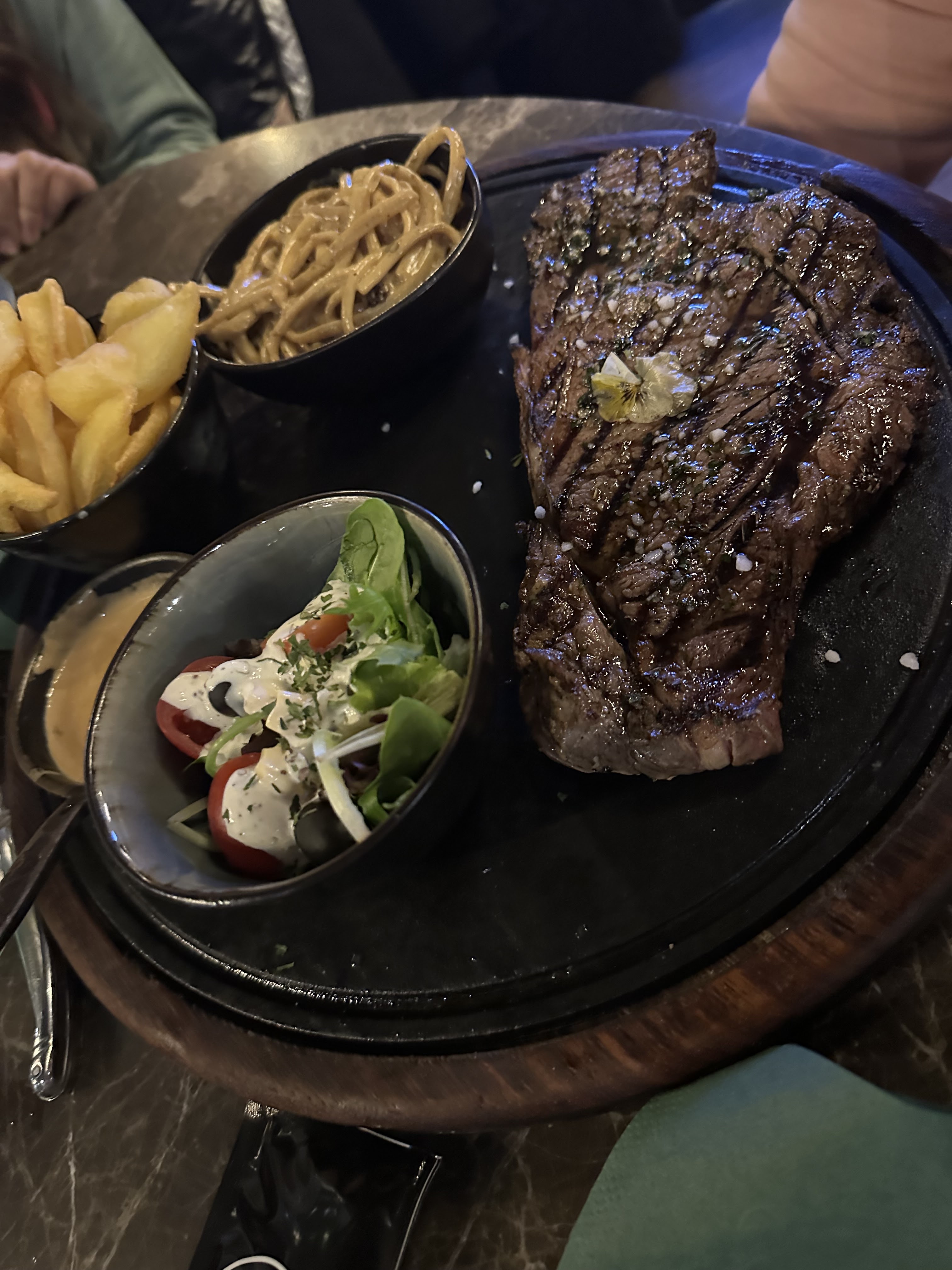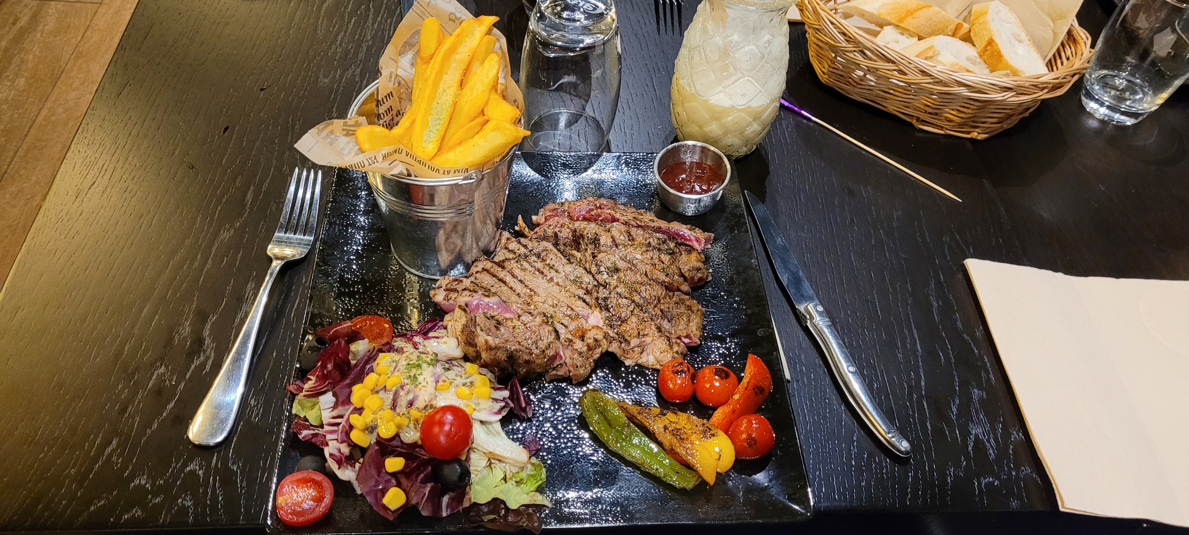 Le personnel de salle au top ! La viande '' côte 500 grammes'' et l'entrecôte sont à fuir,élastique ,peut être décongelées et sans goût, pour cela y'avait trop d'ail par dessus . Partie consommable :20% voir photo.Le restant beaucoup de gras. A mon mécontentement,voici la réponse du patron '' j'en parlerai au boucher ''. il est responsable de ce qui est servi aux clients.Non ? Entrée et dessert moyen pour le rapport prix/qualité. Le bruit de la salle rend malade,car les tables sont trop rapprochées.