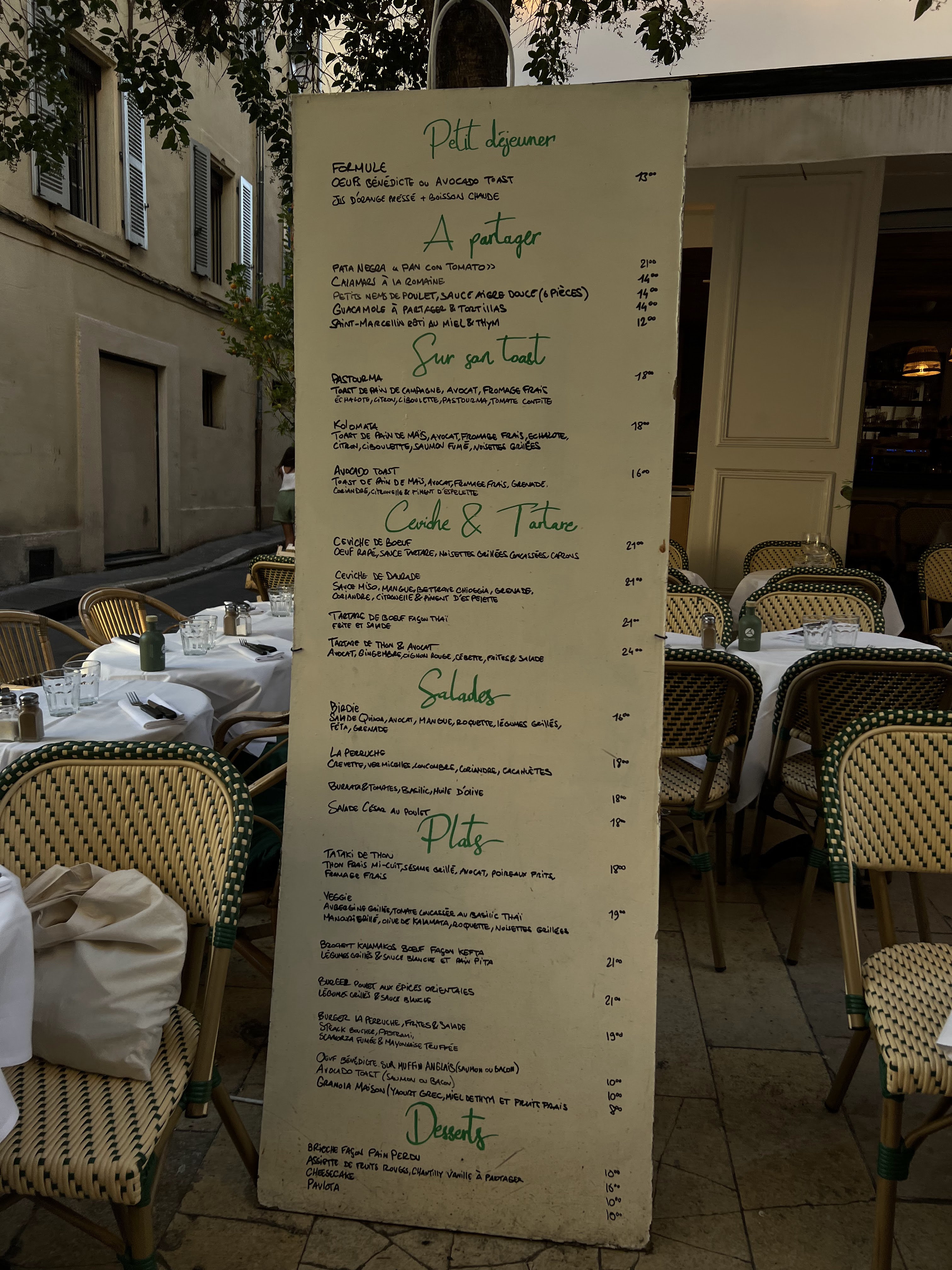 Prix excessifs pour pas grand chose. 18€ un avocado toast pour une (petite) tartine avec du fromage type philadelphia, de l’avocat écrasé et des morceaux d’avocats par dessus, le tout accompagné d’une salade verte même pas assaisonnée. Assiette ridicule pour le prix. Au moins 4 plats présents à la carte manquaient, ce qui n’est pas un problème en soi, sauf quand on ne prévient pas les clients que l’œuf poché prévu sur leur toast ne sera pas présent. Nous avons dû notifié au serveur qu’il manquait l’œuf pour qu’il nous propose un supplément pour pallier. C’est pour moi un attrape touriste qui ne doit son « succès » que grâce à la décoration du lieu qui est elle plutôt jolie. Je ne vous le conseille absolument pas, il y a pleins d’autres restaurant bien moins chers sur Aix et où vous mangerez bien mieux.