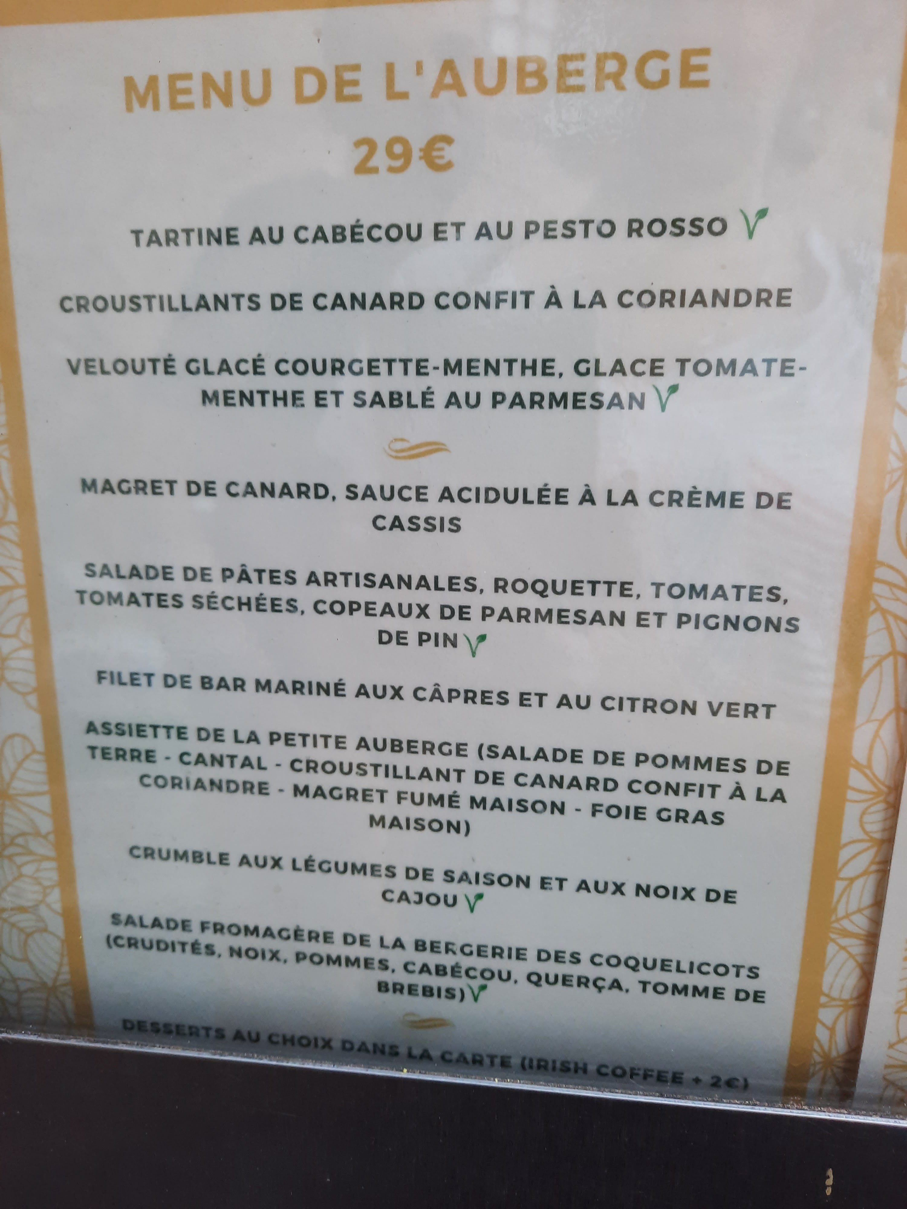 Serveuses souriantes et agréables,repas bon,tous les plats :entrée de l'auberge, assiette de l'auberge se ressemblent fort . Les mets sont frais et bons. prix du repas : menu à 29e cher .je veux bien être touriste, mais je ne veux pas prendre tous les risques pour mon budget. Service particulièrement long ,trop long,mais je me répète produits frais et bons .