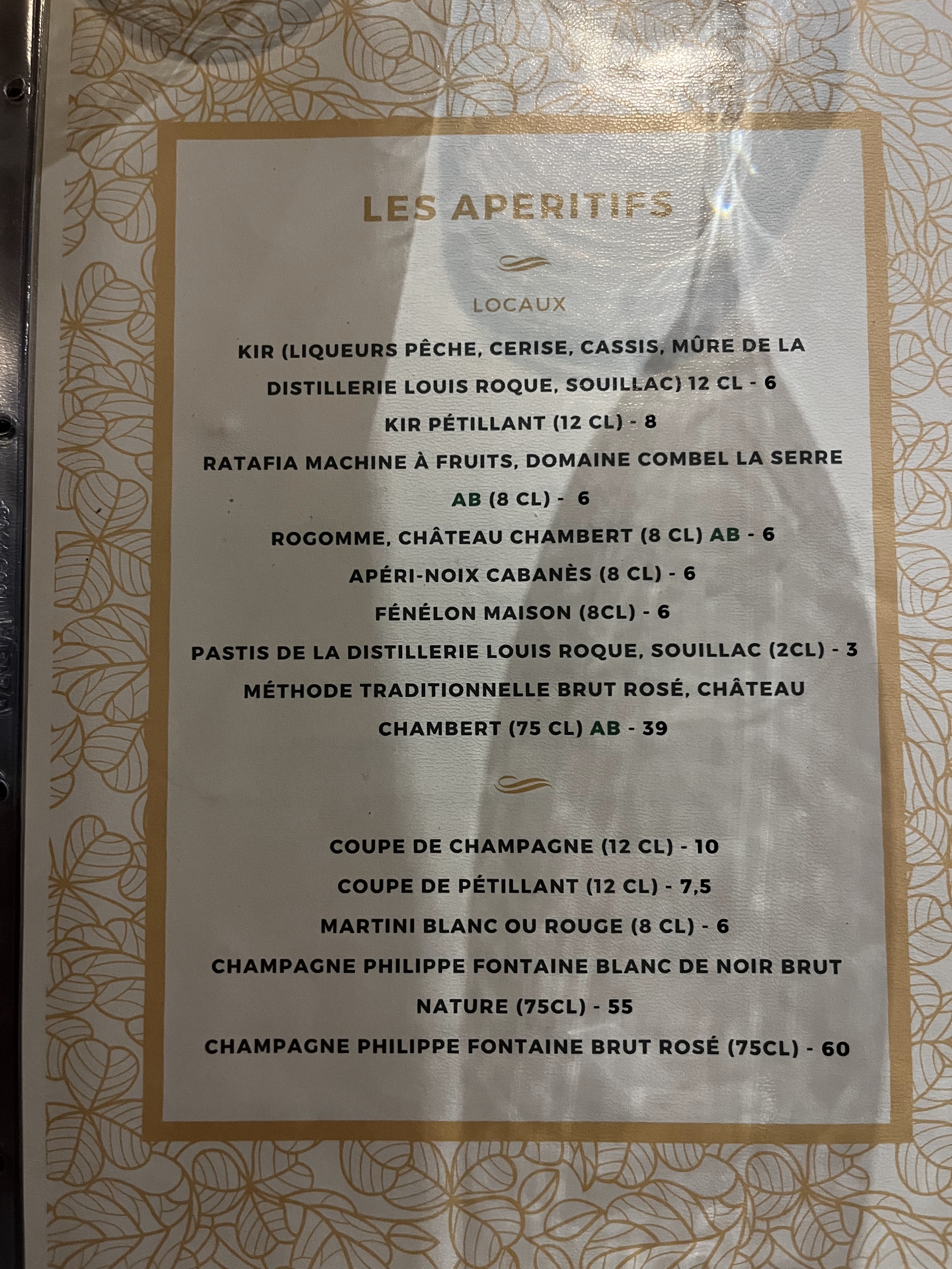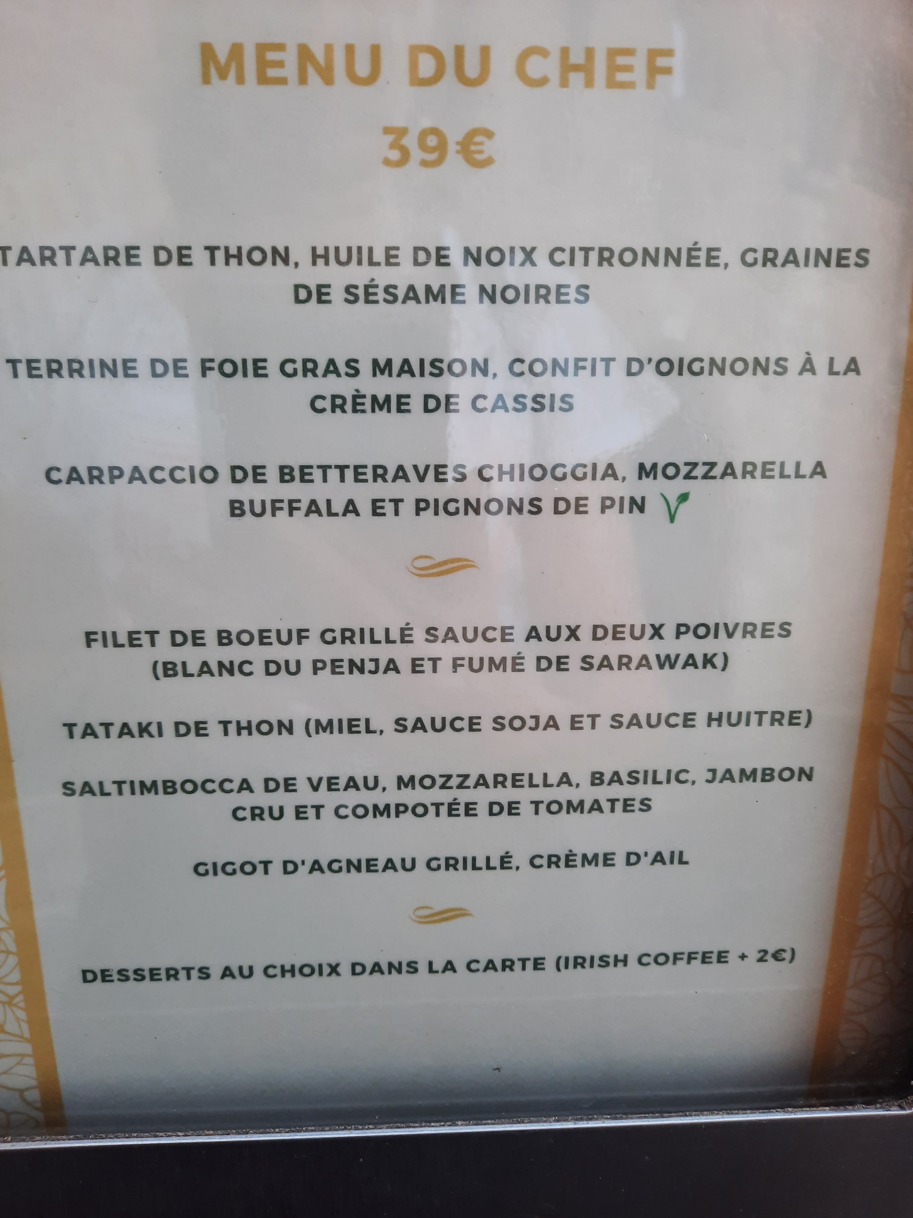 J’ai pris le menu du chef à 40€ (entrée, plat et dessert) accompagné d’un vin de Cahors en supplément. La terrine de foie gras était excellente, la pièce de bœuf aux 2 poivres particulièrement tendre et l’assiette de 3 fromages très goûteux. J’ai mangé à l’extérieur à l’abri du soleil. Je recommande cette adresse.