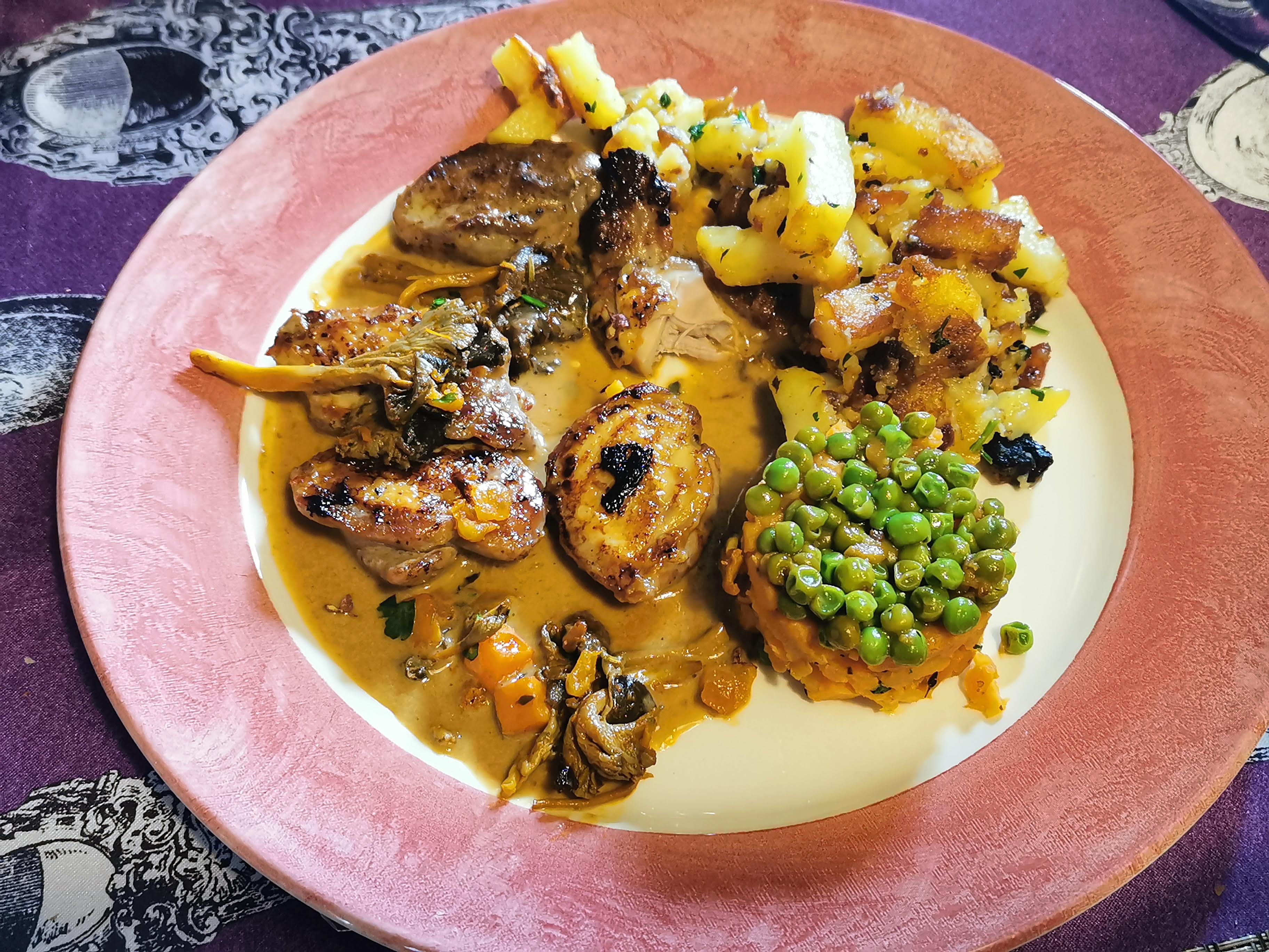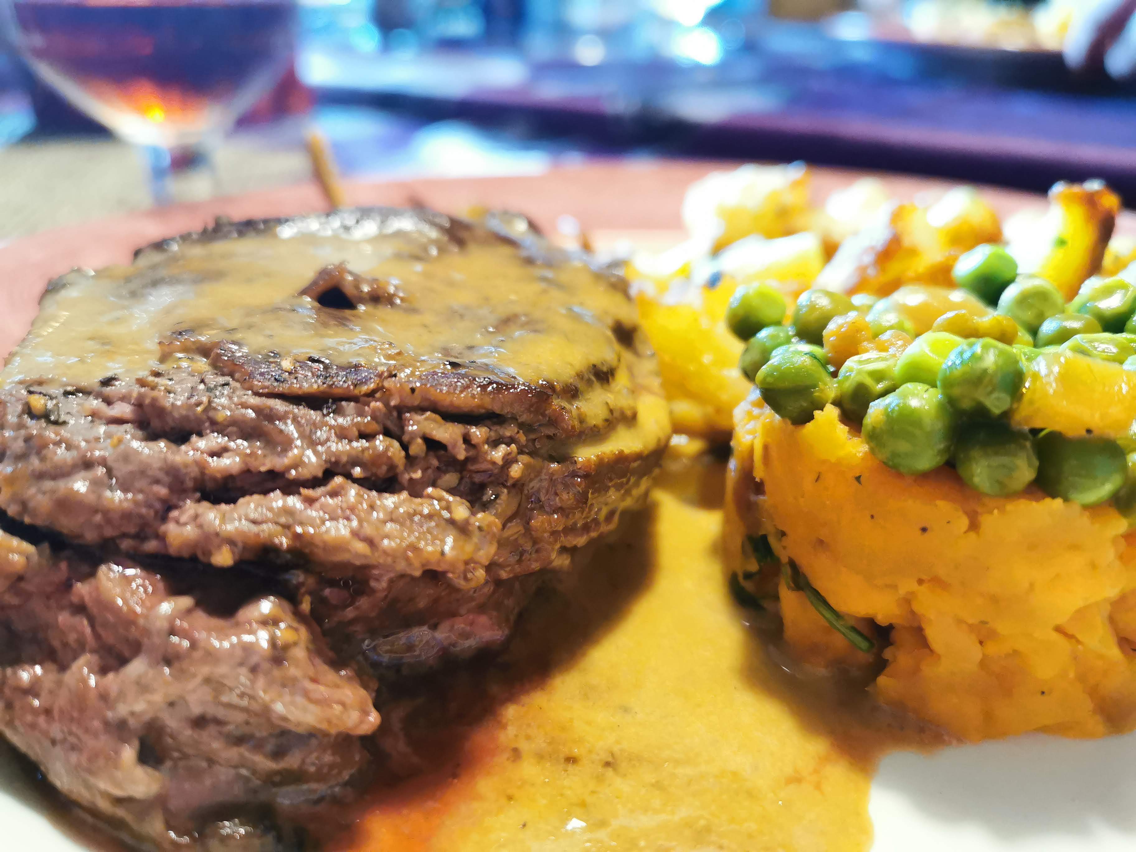 D'abord une déception à l'arrivée, mais une bonne explication des possibilités. Bonne cuisine : veau bien cuit mais pas sec. Pommes de terre bien cuites, jambon de canard savoureux et spécial. Fromage ok, dessert à la pêche très savoureux. Bon vin, sans gluten sans problème. L'enfant a reçu d'abord de la nourriture, une portion ajustée. Madame, d'abord raide, puis amicale.