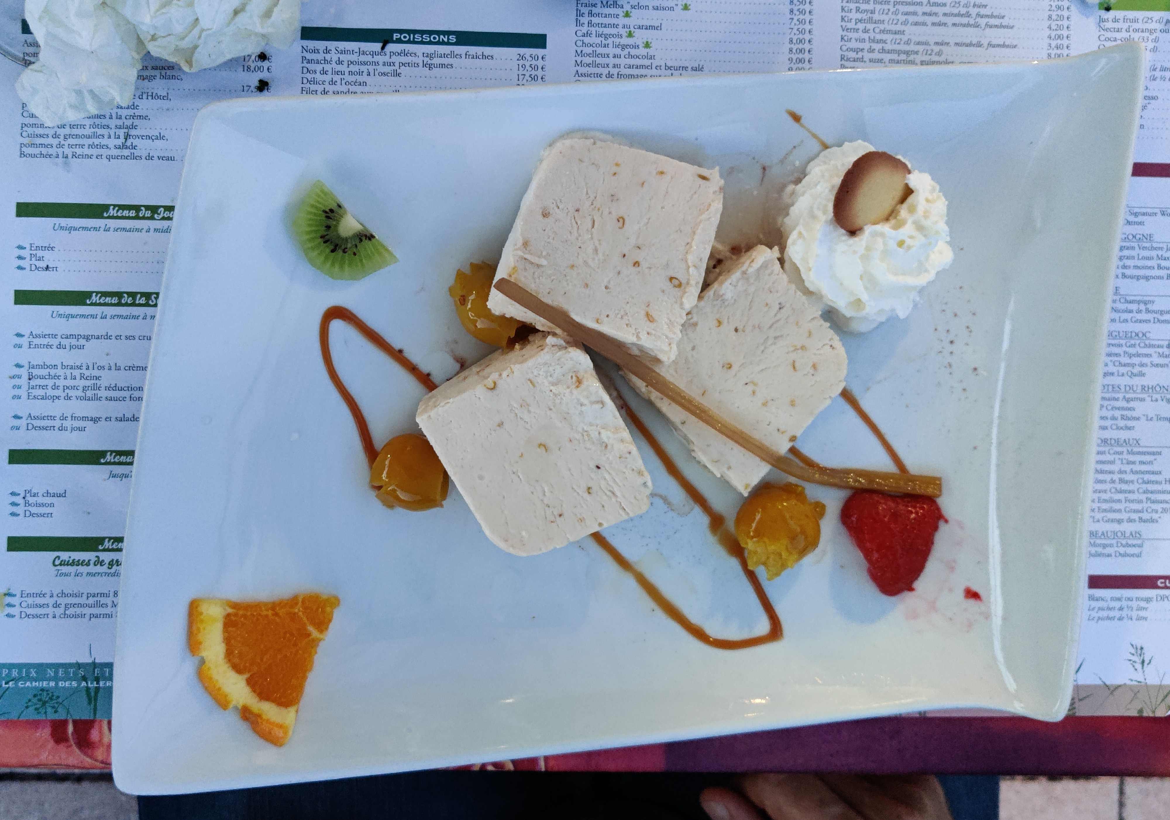 Grenouilles bien cuisinés. Bien en quantité et qualité Excellent nougat glacé. Le patron se détend au cours du repas...