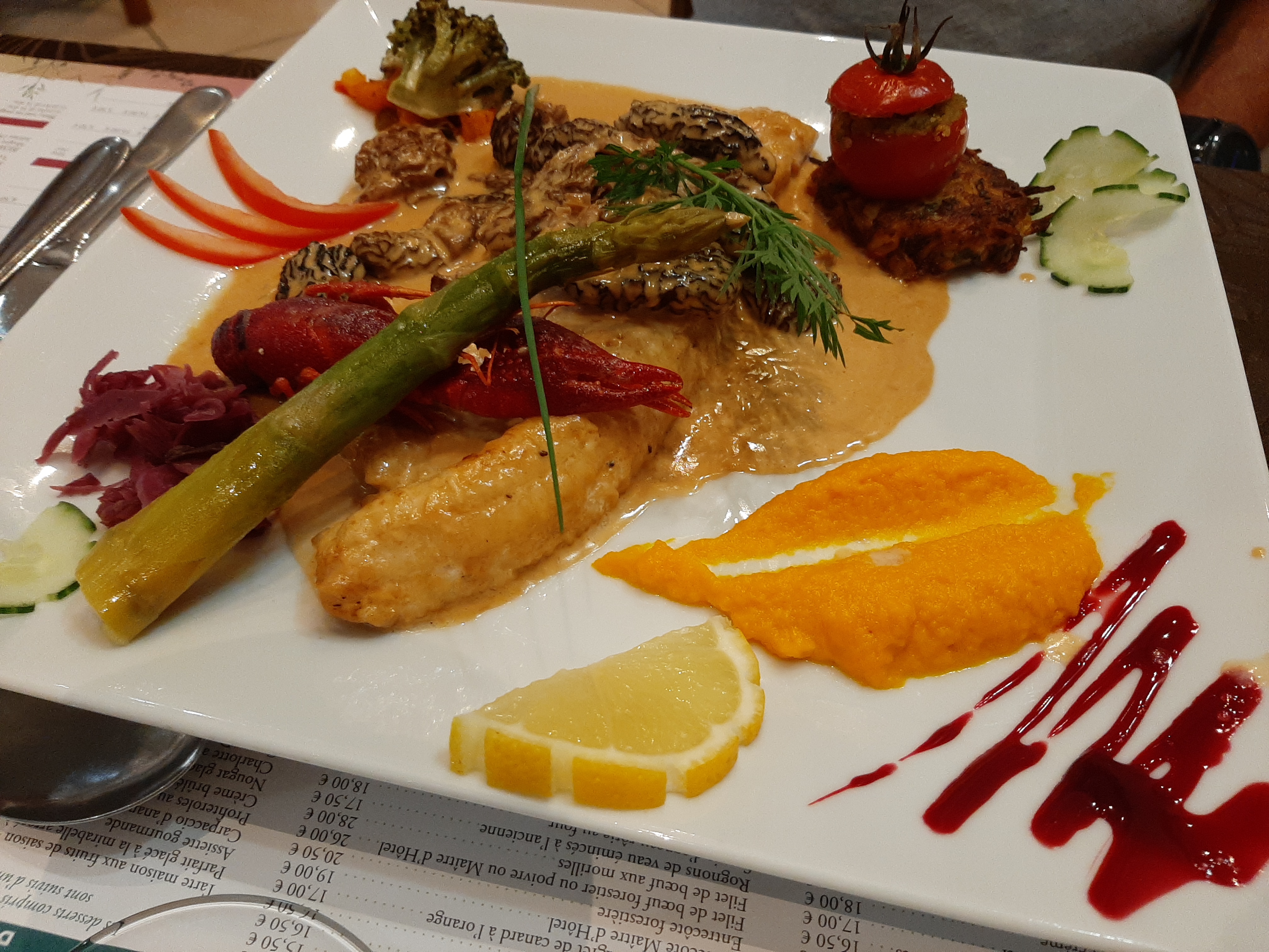 Excellentes cuisses de grenouille avec ses pdt rôties, jarret de taille hors norme. Le menu est copieux, le service gérables et pour cette gamme de prix (menus aux alentours de 30e) on est dans un bon rapport qualité prix. Le genre de restaurant de cuisine de terroir qu'on aimerait voir plus souvent dans nos campagnes.