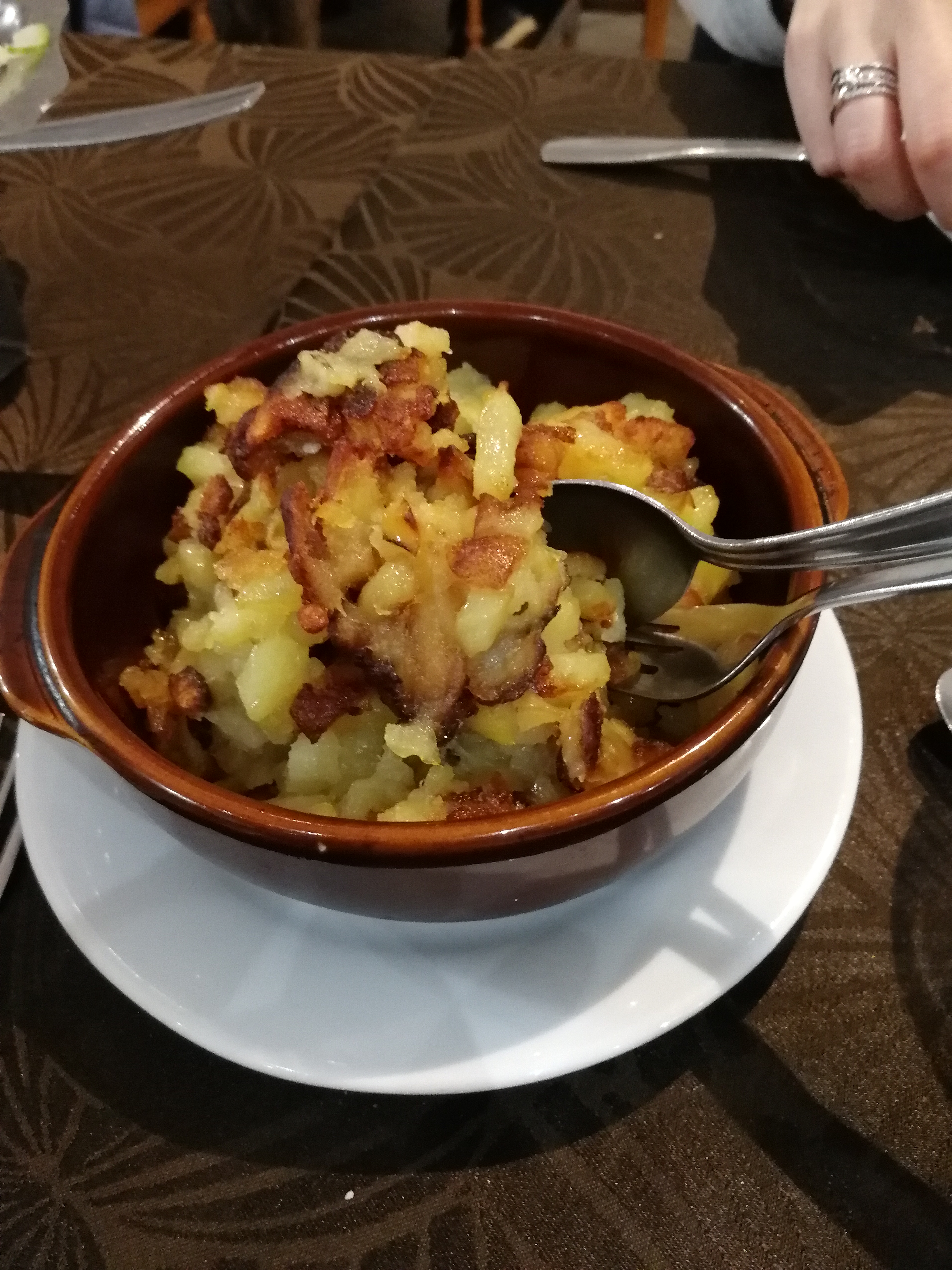 Service agréable et efficace. Cuisine traditionnelle et de qualité. Les plats sont bons et copieux (les portions sont plus que généreuses) avec en accompagnement les fameuses pommes de terre rôties (excellentes ! à elles seules elles méritent le détour !). Cette petite auberge n'a de petite que le nom. Elle vaut vraiment le coup !