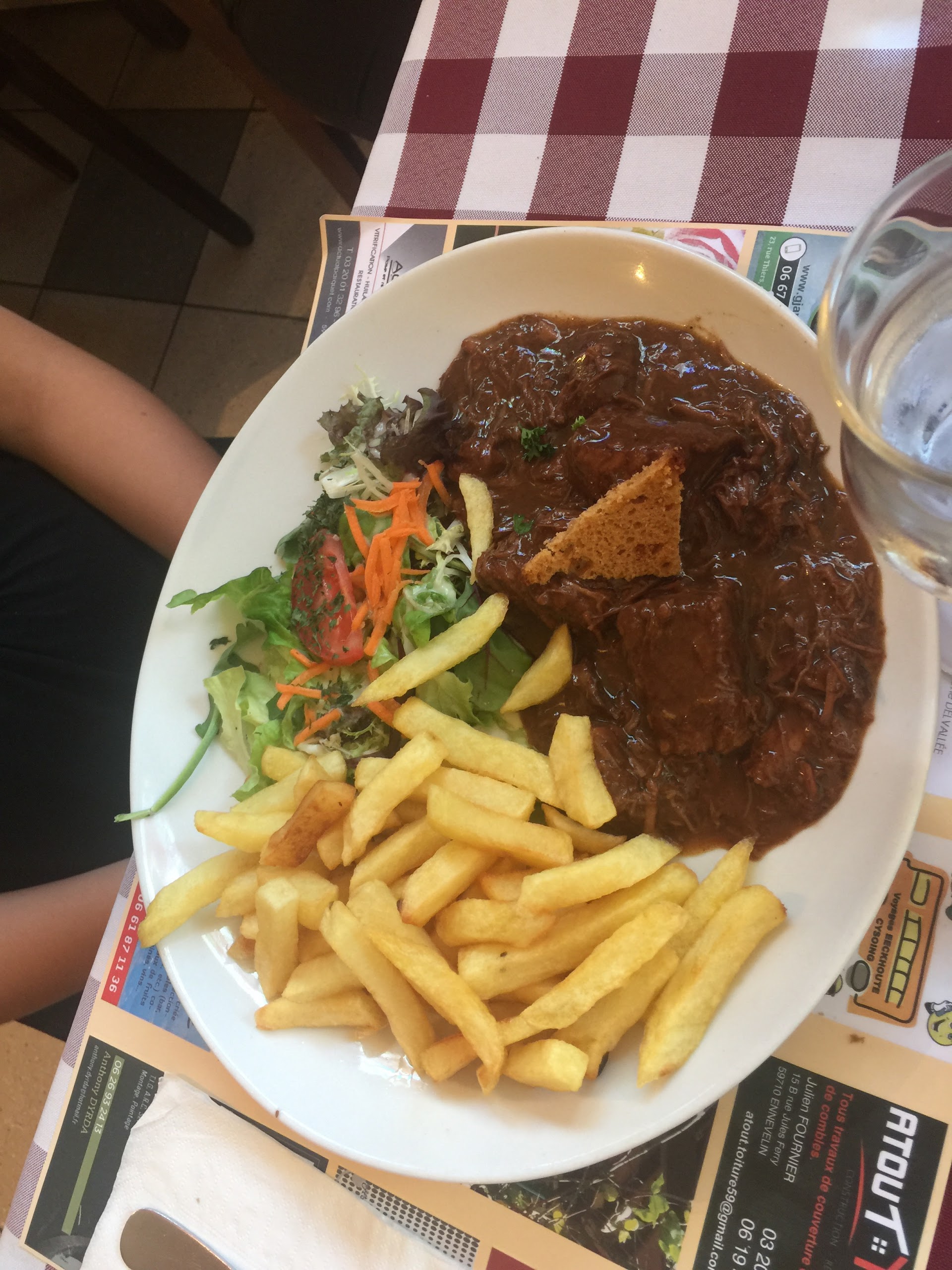 La carbonnade aux pain d’épices est bonne mais le mariage des saveurs est encore trop maigre, un pain d’épices moins industriel donnerait une touche beaucoup plus qualitative au plat. J’ai commandé des pomme de terre au four mais j’ai eu des frites surgelées. Le pain d’accompagnement n’est pas frais et était caoutchouteux, les tâches blanchâtres de la mie suggère du surgelé. Lorsqu’un client commande une boisson dans une bouteille en verre, celle ci doit être ouverte devant le client. Je ne reviendrai pas tout de suite...