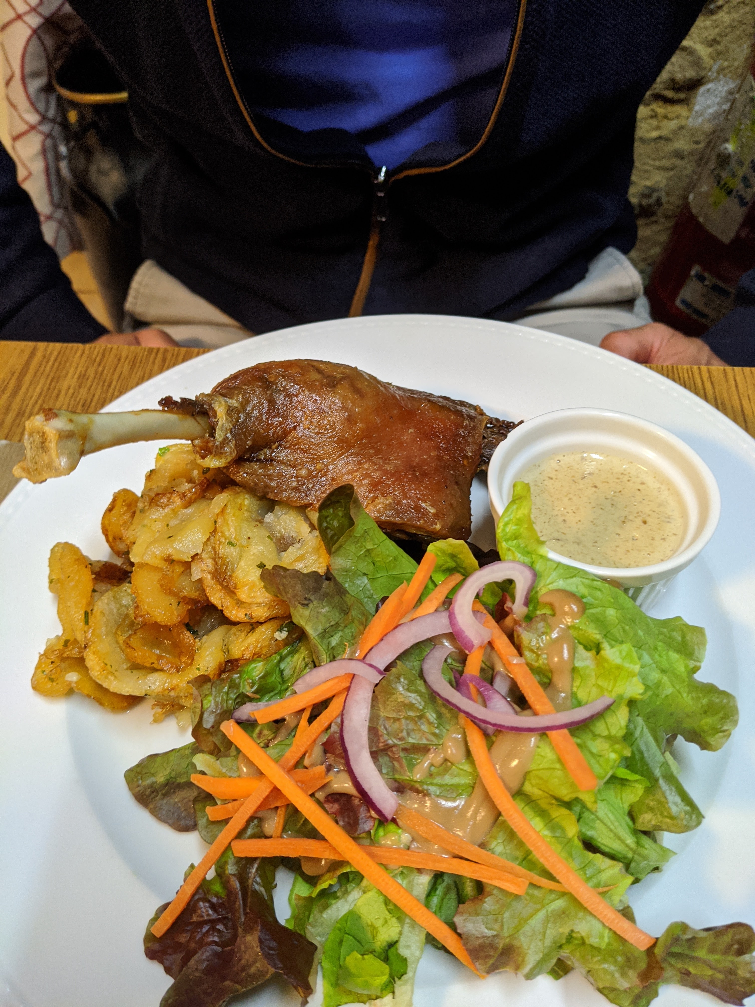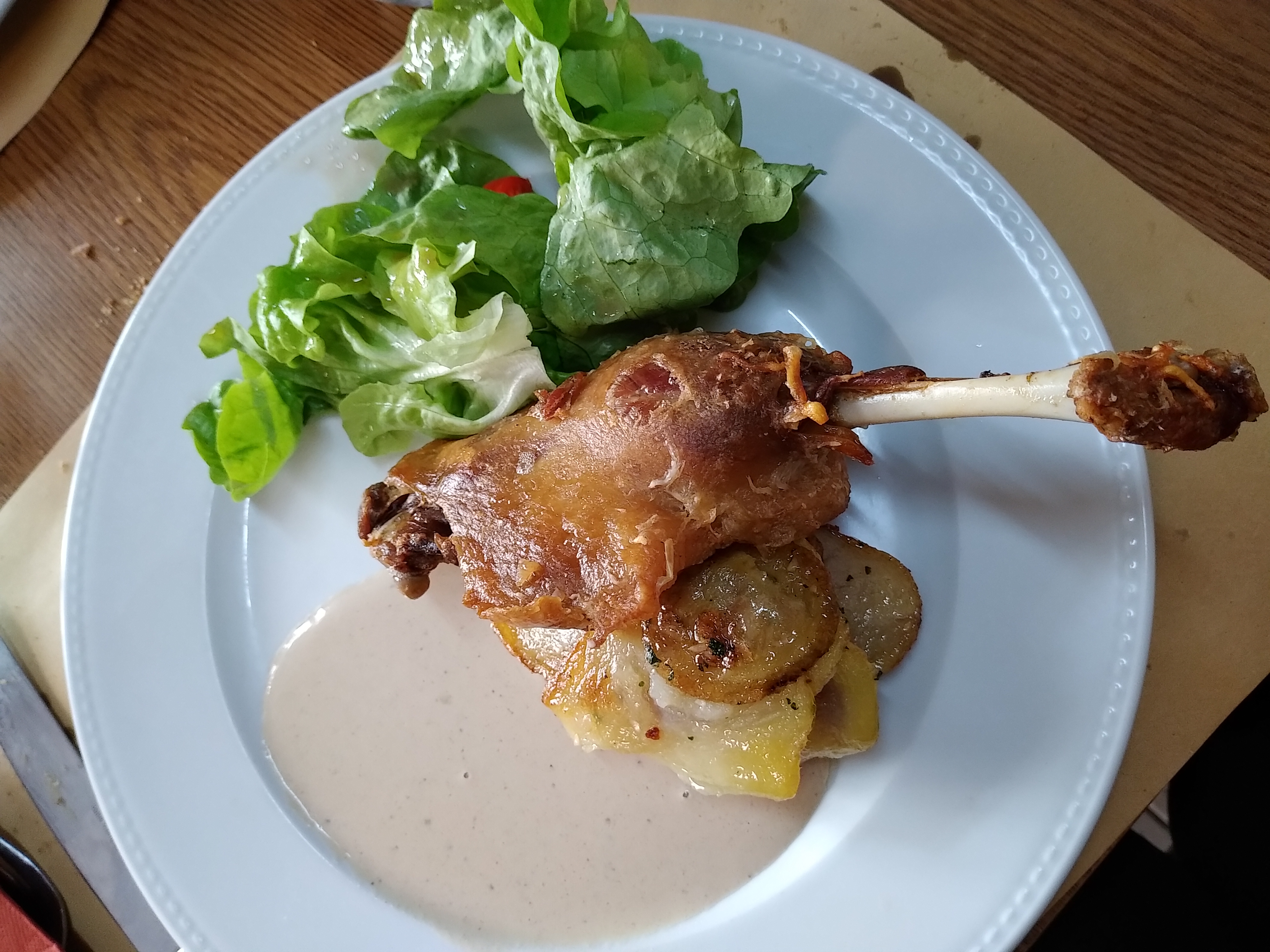 Bon et simple. Confit de canard à 14,5€. Pavé de canard à 15 €. Accompagnés d'un peu de salade et un de pommes de terre sautées à la graisse d'oie. Le service : ça peut aller. La vague de chaleur a du fatiguer la serveuse. Mon verre de vin a été oublié. Dommage.