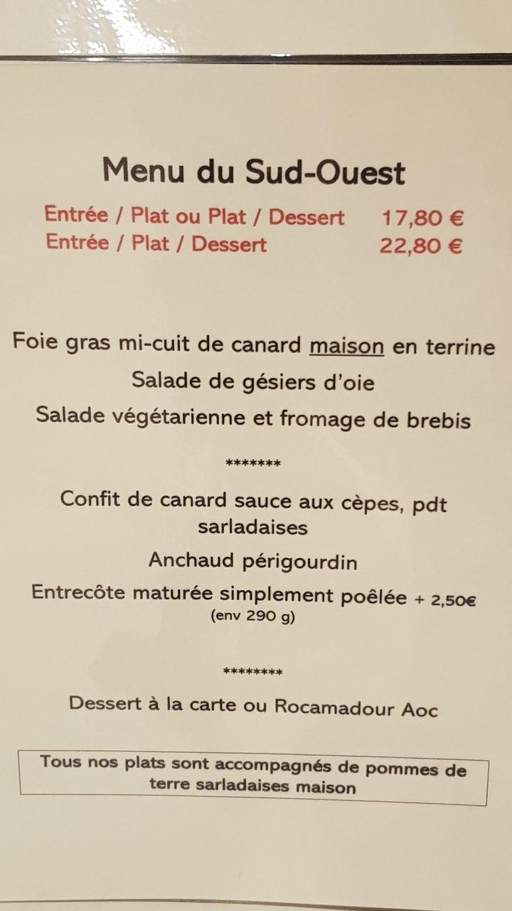 Les plats sont bons (mention pour le Parmentier), le service est rapide (un peu pressant mais bon, c’est la haute saison donc on peut comprendre), c’est propre. On en demande pas plus dans une ville touristique comme Sarlat
