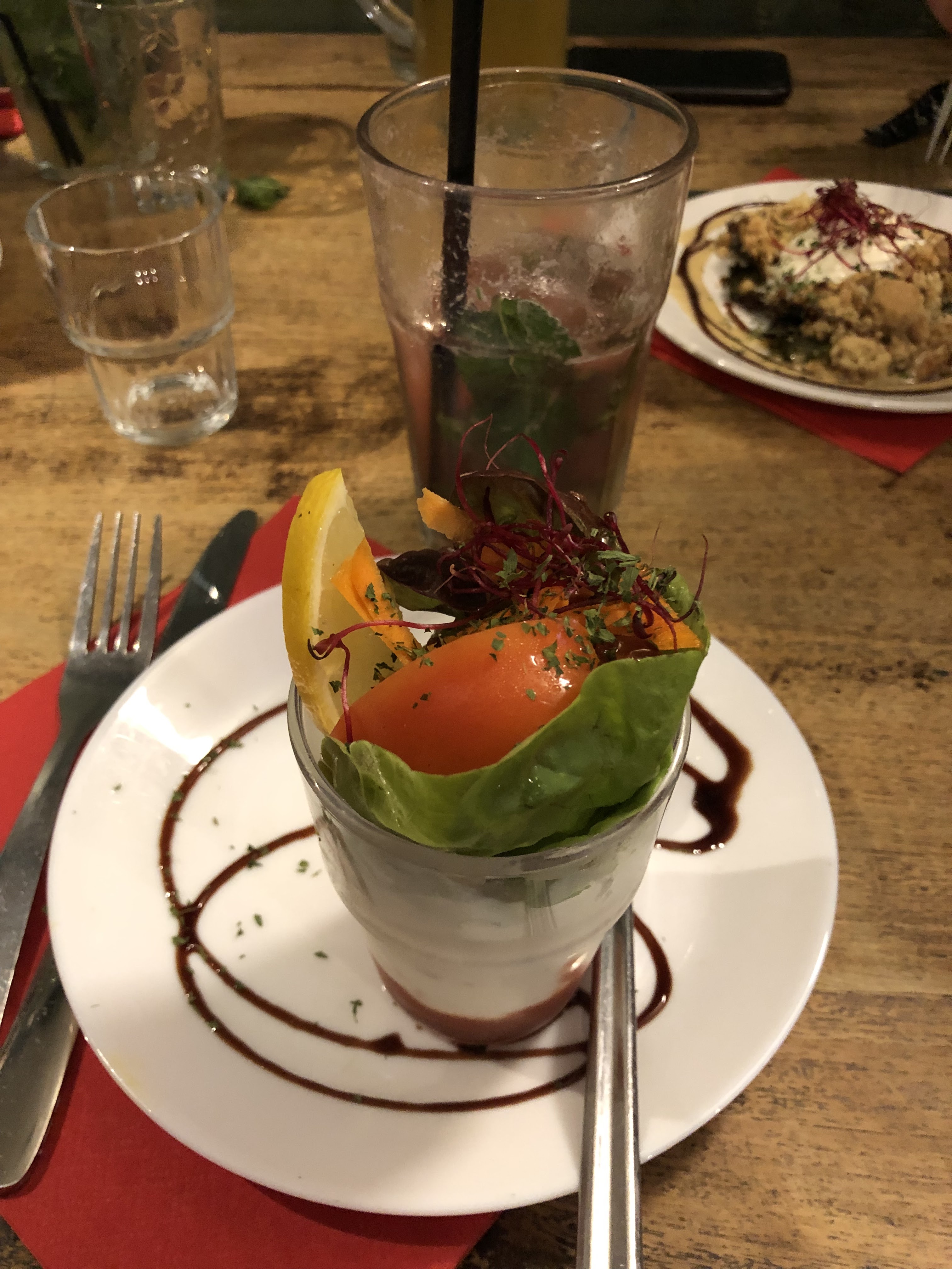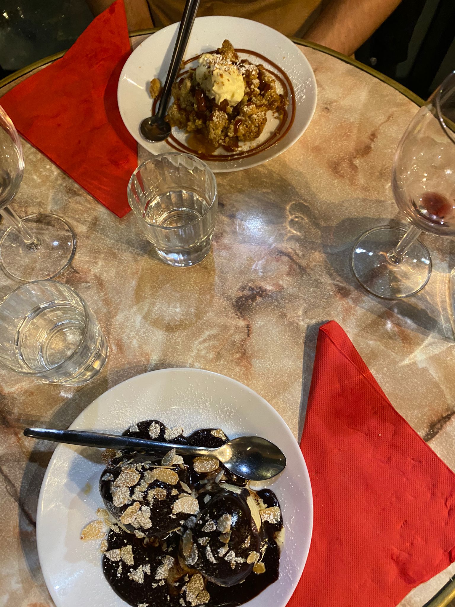Malheureusement, le restaurant n'est pas à la hauteur de sa réputation. Ils semblent tout simplement en sous-effectif. Le personnel était très sympathique et a même pris le temps de vous donner une bonne recommandation. Plus tard, ils semblent disparaître. Les prix étaient raisonnables. Nous avons reçu du pain complémentaire, mais un morceau portait des marques de morsure. Nous supposons donc qu’il s’agissait d’un reste d’une autre table qui a atterri par accident dans notre panier. Les entrées sont arrivées rapidement et étaient bonnes. Le plat principal est arrivé très tard. Pour aggraver les choses, il faisait froid et la viande était trop cuite et moelleuse. Après le plat principal, le personnel a nettoyé les autres tables à l'extérieur et, bien qu'ils nous aient vu attendre plus d'une demi-heure, personne n'est venu nous voir pour nous servir davantage. Ils nous ont simplement oubliés ou ignorés, ainsi que deux autres clients, jusqu'à ce que nous allions à l'intérieur pour demander si le service était toujours disponible. Au moins, ils ont terminé en force avec des desserts tout à fait délicieux.