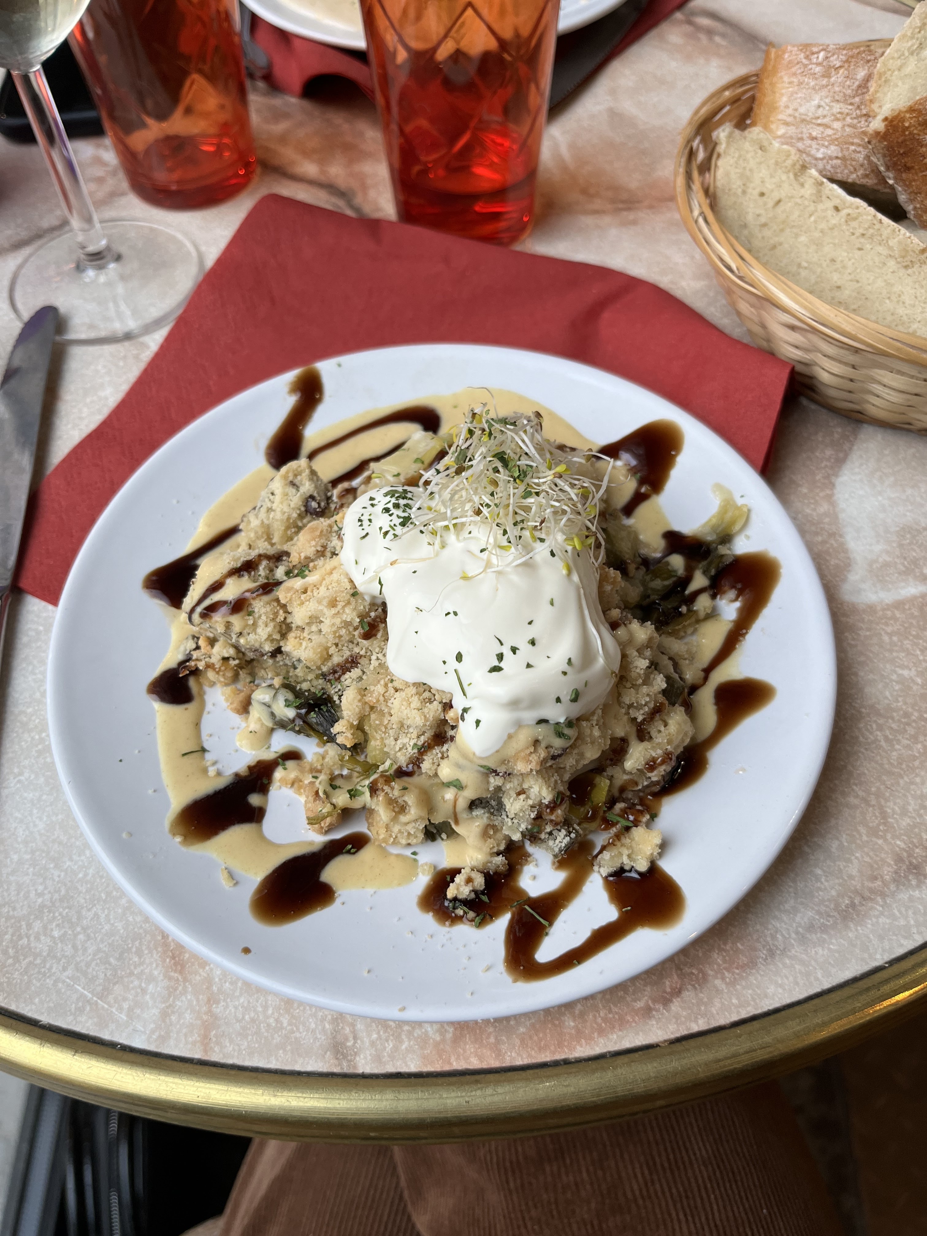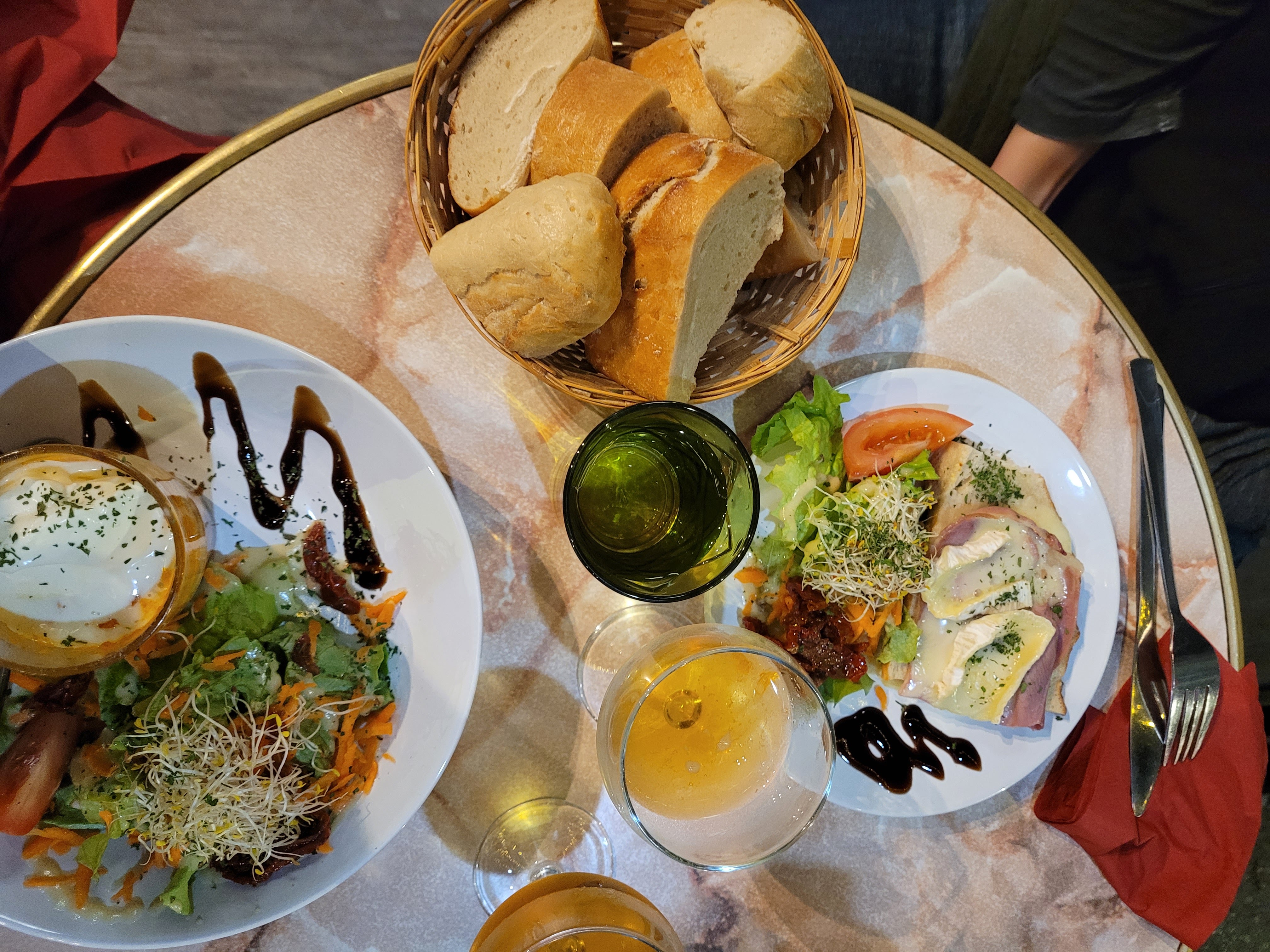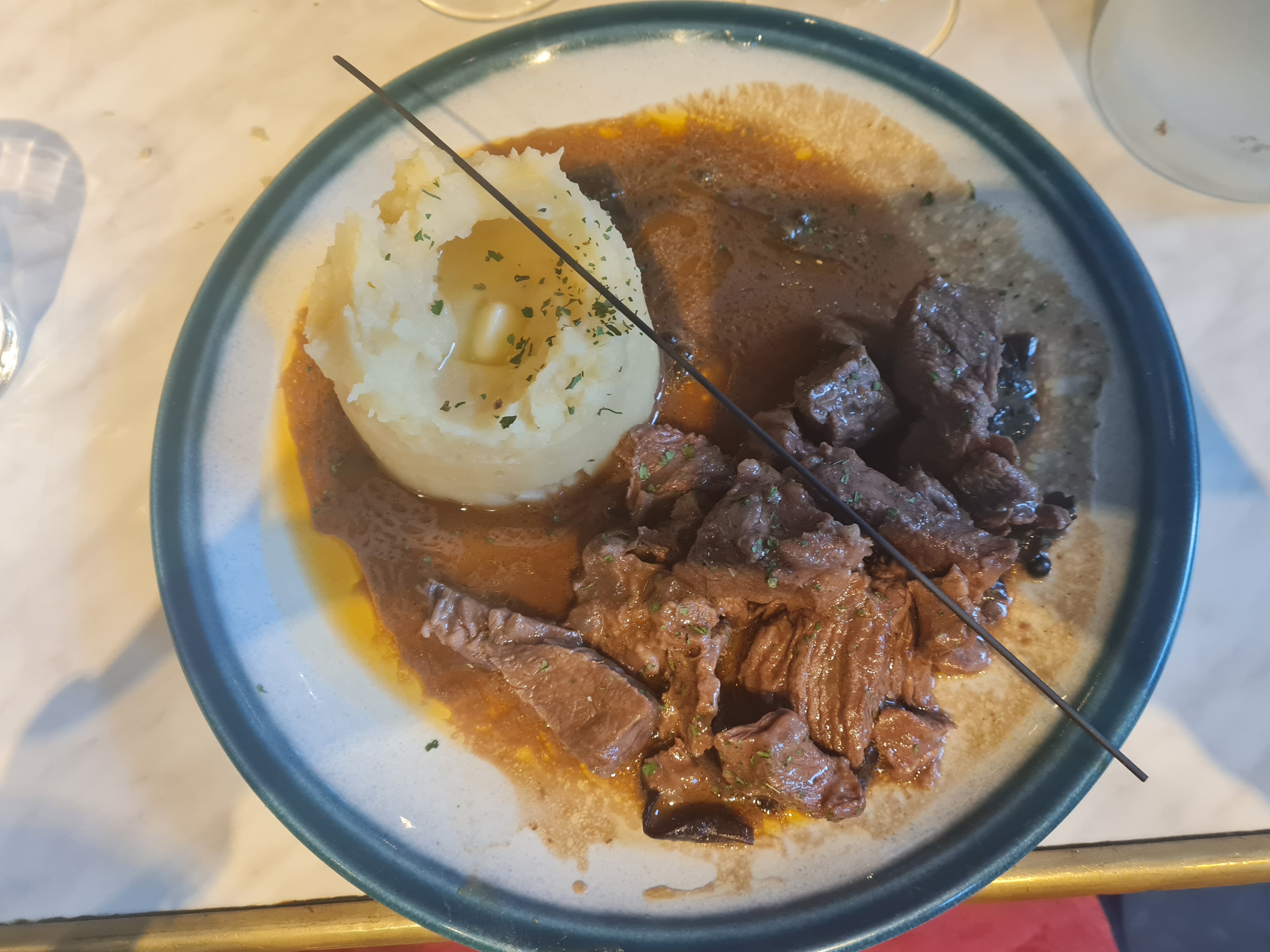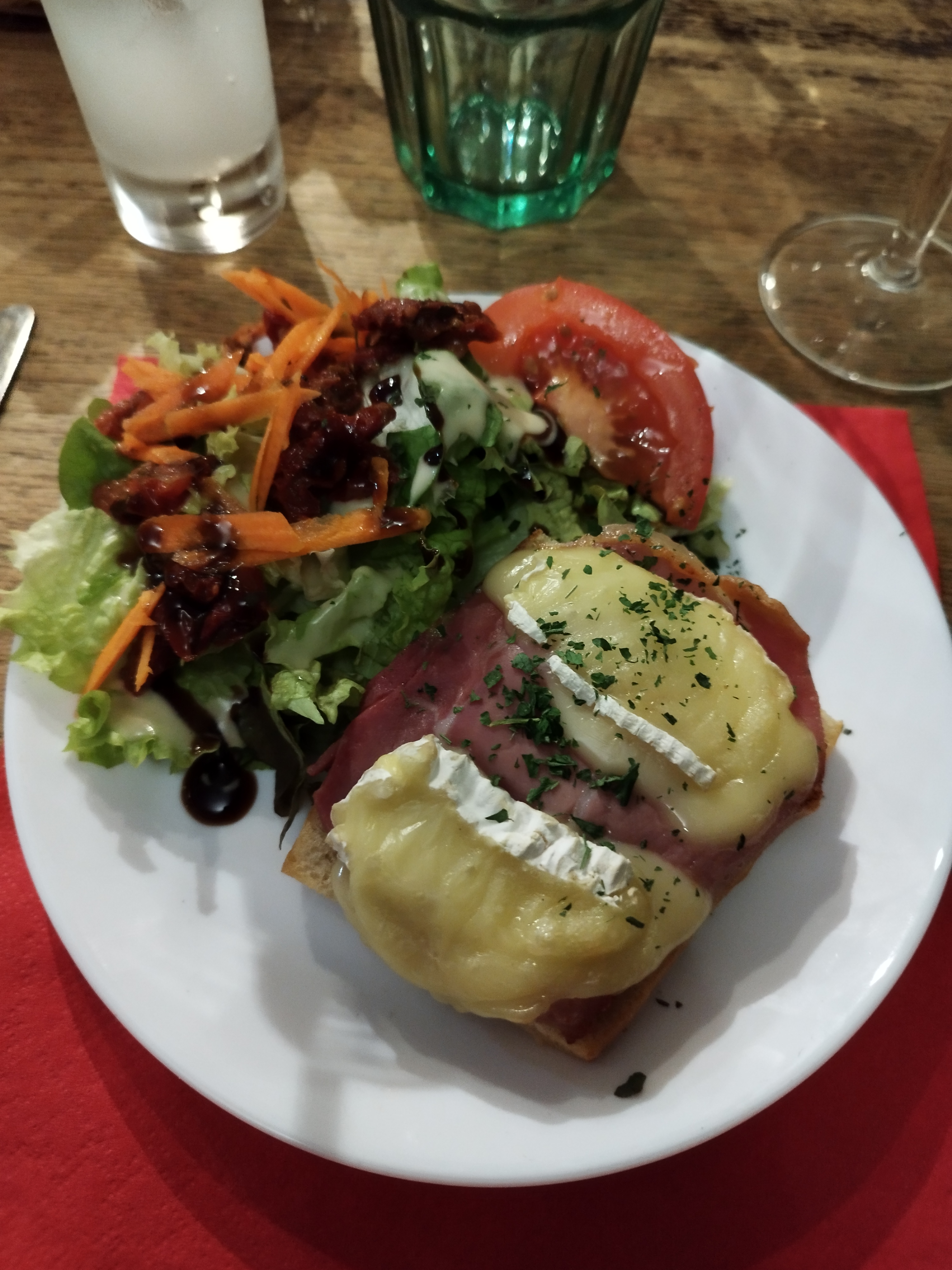 Nous ne sommes pas des mangeurs tardifs, alors après être restés assis à nous tourner les pouces pendant 2 heures après notre heure habituelle de dîner, en attendant que tous les restaurants ouvrent ici à 19 heures, nous étions absolument affamés et prêts à manger quelque chose de bon. J'ai choisi cet endroit principalement à cause des autres bonnes notes, du fait que j'ai vu du crumble aux pommes au menu et qu'il se trouvait en face de notre appartement. Même s'ils n'avaient pas de réservation, ils ont trouvé de la place pour nous à l'intérieur lorsqu'il a commencé à pleuvoir. Nous avons chacun pris 3 plats et boissons. Chaque plat était servi rapidement et la nourriture était délicieuse. La taille des portions était parfaite pour un repas de 3 plats. Nous avons dû attendre un peu que les assiettes soient débarrassées entre les plats, mais pour être honnête, elles étaient pleines à craquer. Heureux d'avoir mangé ici et d'avoir vécu une bonne expérience de cuisine française authentique, et le prix était également extrêmement raisonnable - 22 € pour 3 plats et café, et après un verre, le total pour 2 n'était toujours que de 58 €. Venez ici, vous ne serez pas déçu.