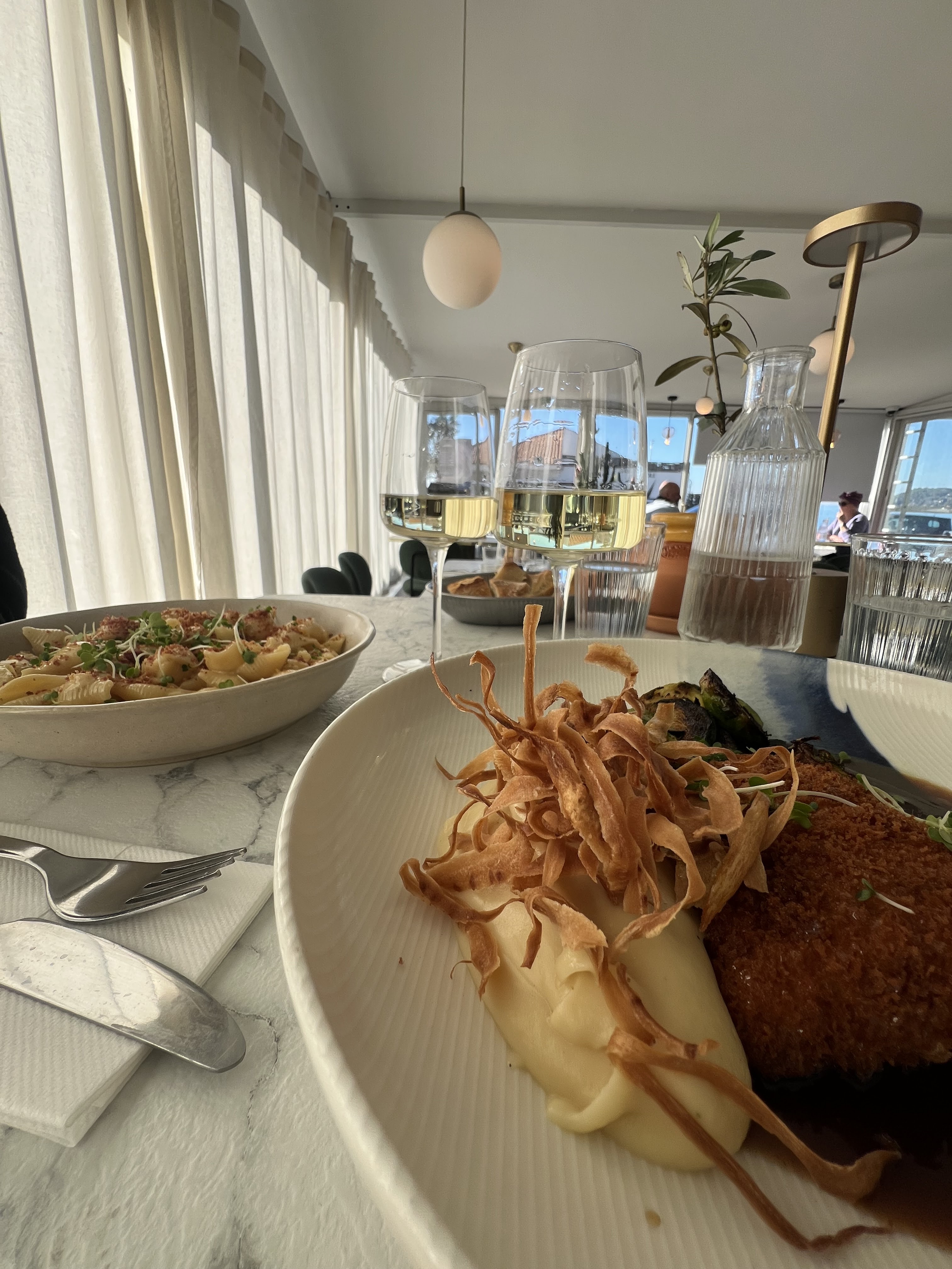 Bien qu’arrivé à la limite de la fermeture de la cuisine, nous avons eu la chance de pouvoir déjeuner sur place et de profiter d’un lieu cosy à la décoration sobre et tendance. Bien que situé au droit de l’axe routier, le calme sur place permet d’apprécier la vue mer qui donne une nouvelle touche au repas. Commande passée, nous avons testé les ravioles de bœuf et le maigre, les deux plats ont ravi nos papilles avec une verre de Bandol blanc. Pour le dessert je me suis laissé tenter par un biscuit aux notes de fruit de la passion dont la couleur évoquée à elle seule le soleil flamboyant du jour. Une adresse exceptionnelle à ne pas rater.