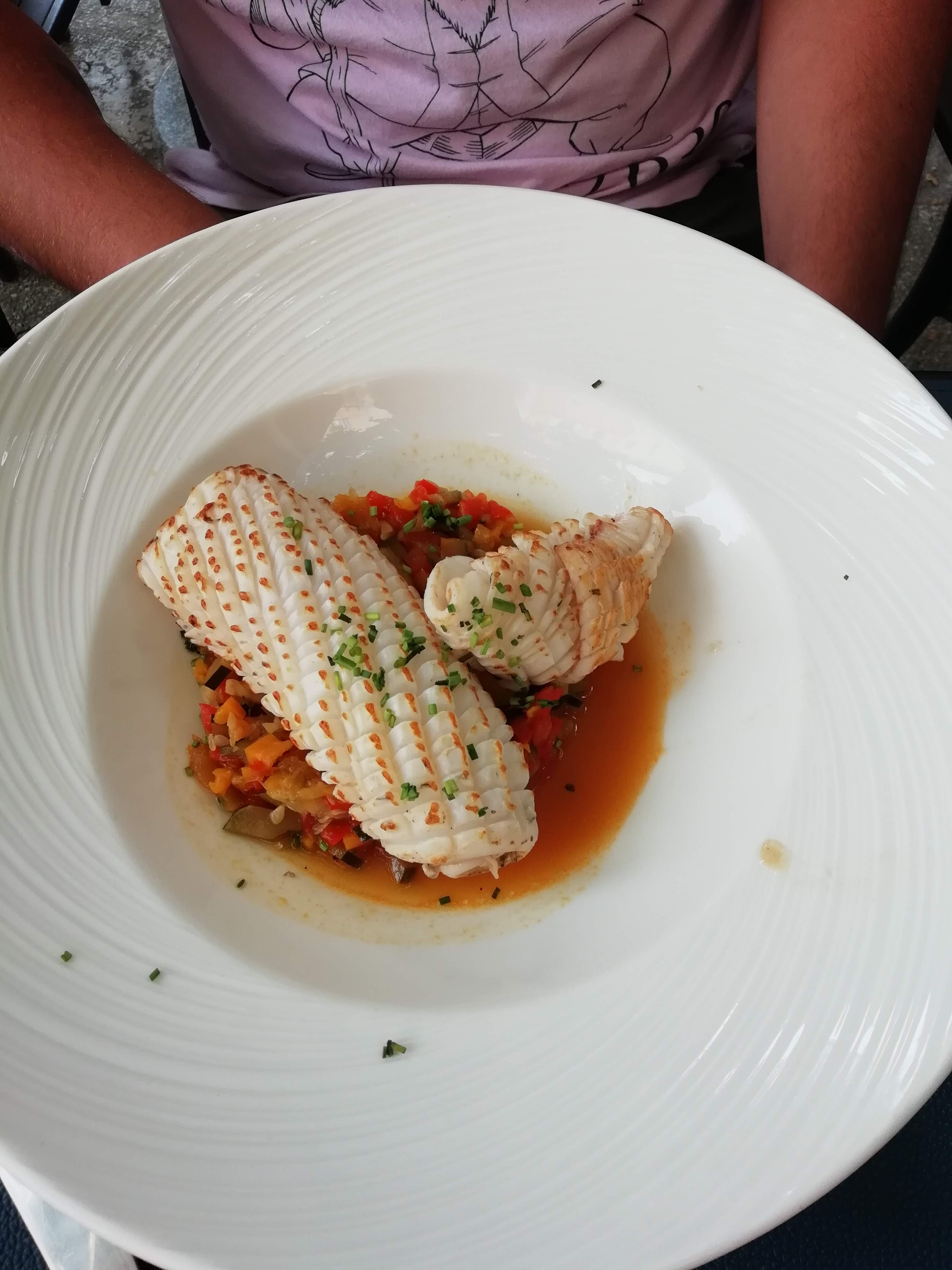 Cuisine simple et délicate. Très bons produits, frais, bien préparés. Salmorejo comme à Séville, encornets persillés, filet de loup sur un tian de légumes, fondant au chocolat, panacotta cacahuète caramel... tout était bon