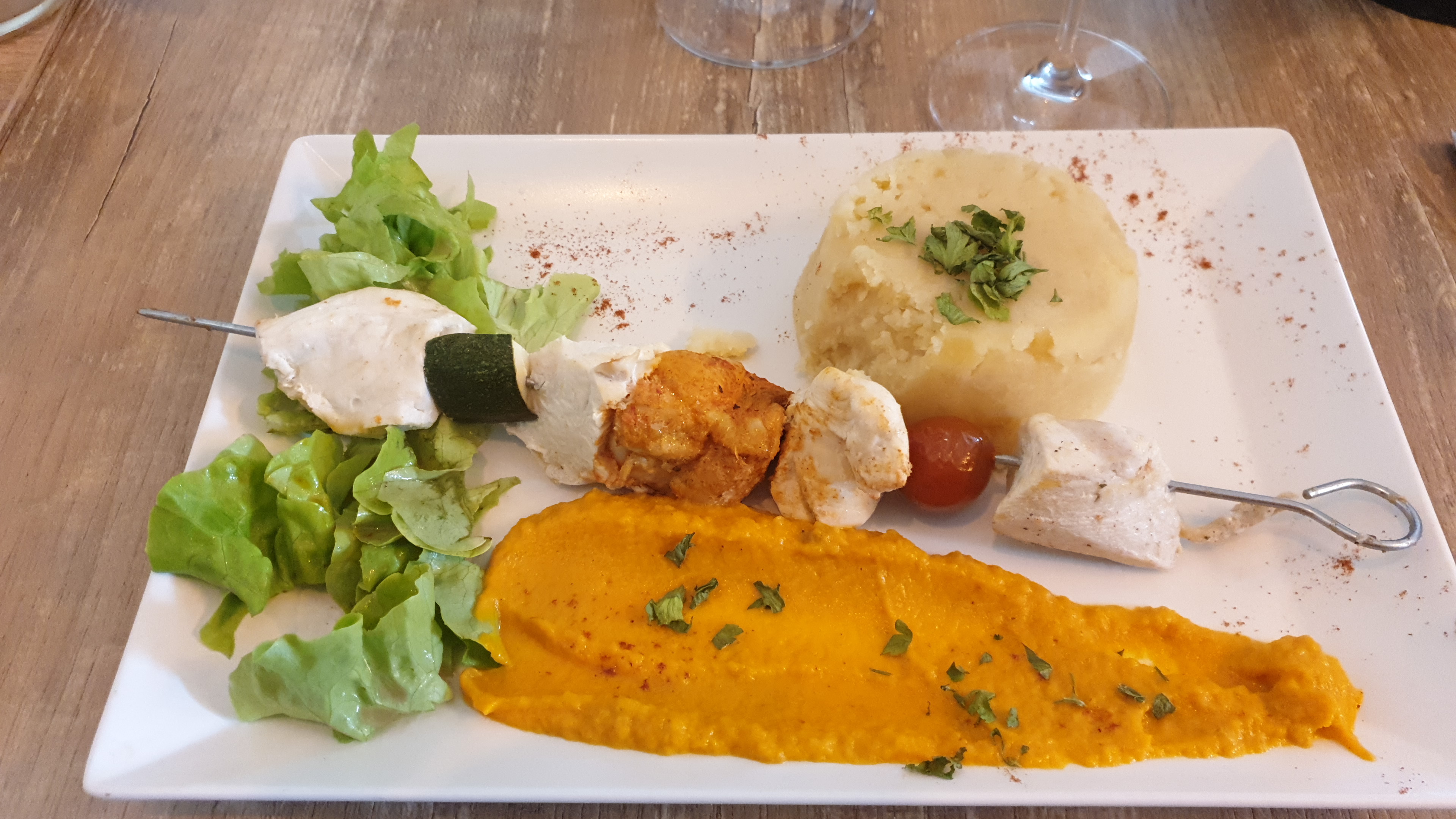 Nous avons beaucoup aimé ce restaurant au bord de la route où c'est très facile de stationner La patronne est très sympathique les brochettes de bœuf très bien, belles présentation Camembert au four un peu trop salé Dessert excellent Je recommande
