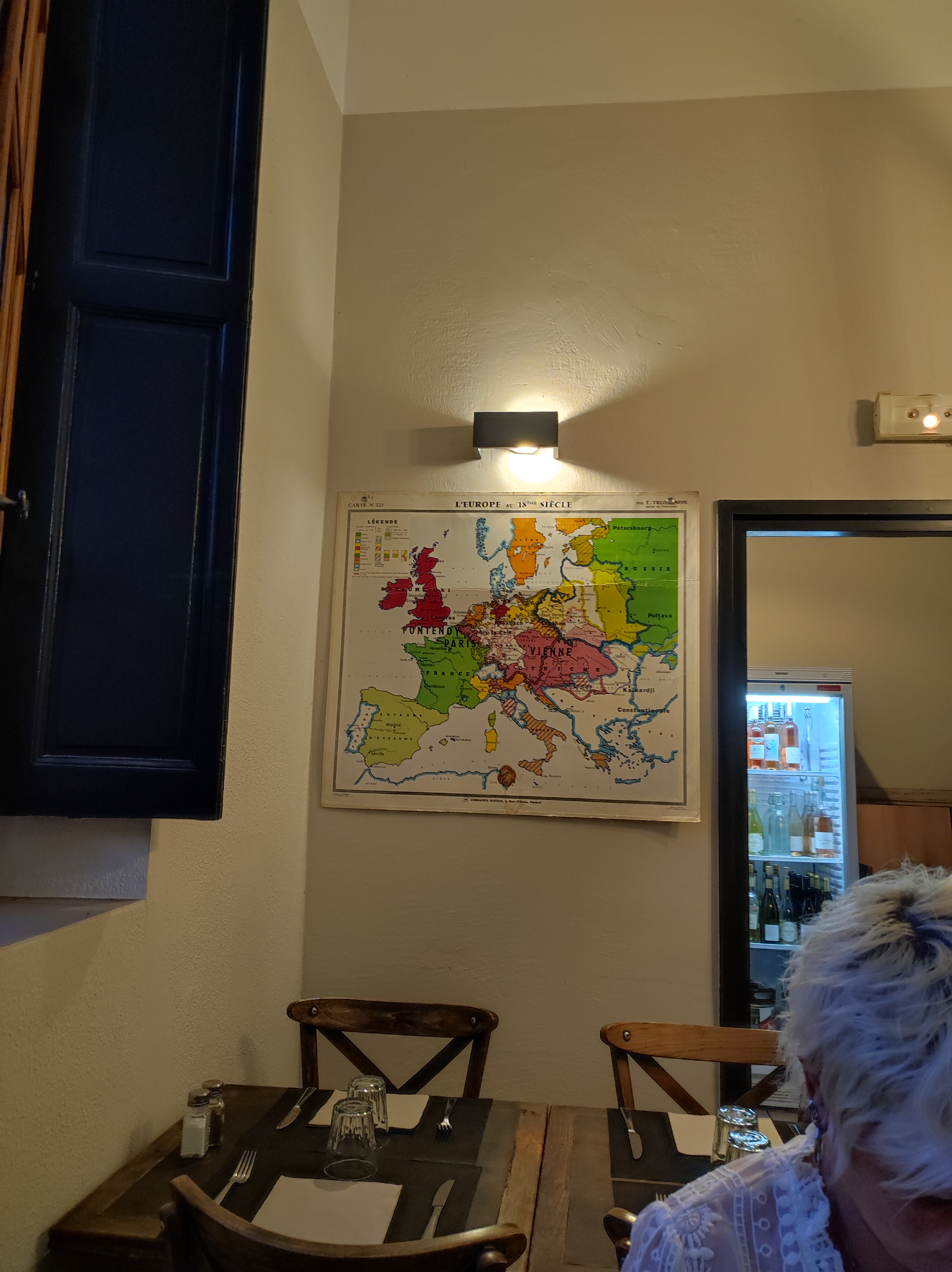 Un lieu amusant, une école d'une autre époque... des cartes au mur... Et une nourriture provençale très bonne. Le Gardian de Taureau était parfait.