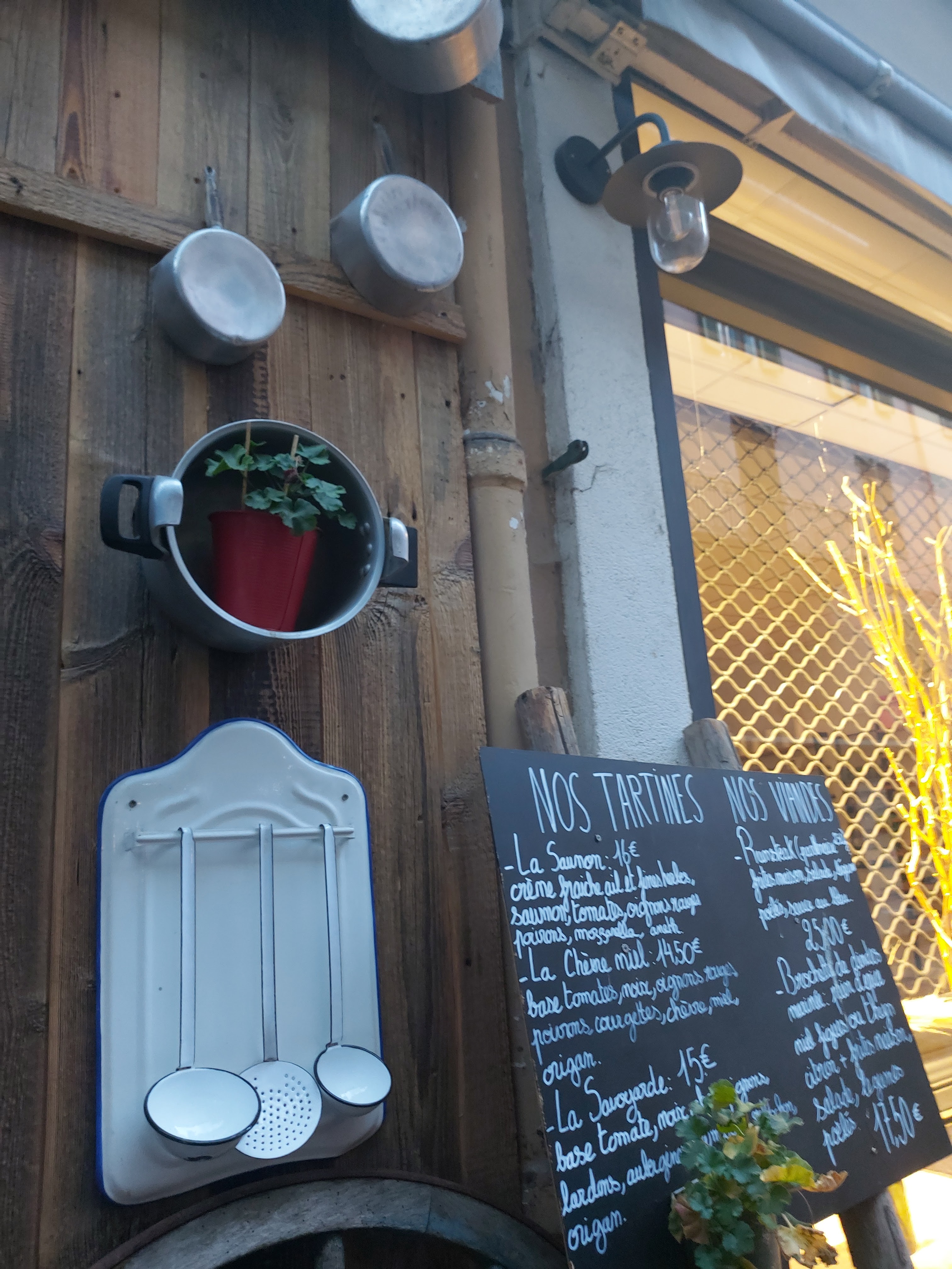 Partage, convivialité, bonne humeur et repas de roi. En effet, on pourrait croire en sortant de cette adresse que l on a visité un restaurant gastronomique. Les plats sont justement dosés, voir copieux. Nous avons goûtés le plat du jour, coq au vin ainsi que la suggestion un morceau de hampe de 300gr et 2 tartines saumon et chèvre miel. Nous sommes sans équivoques aucunes. Morceau de viande de qualité Supérieur, plat en sauce esqui, et les 2 tartines servies par assiettes !! sont excellentes. Les produits sont frais et maîtrisés. Nous avons consommés un côtes du Rhône tres bien sélectionnés par le couple de patron pour a peine 19€90. Et nous avons bien évidemment pris les apéritifs. Nous nous sommes acquittés d une note de 89€30 pour 4 avec les consommations!! Ce qui rapporte à 22€50 par personne, et ce sera le seul bémol (c est une boutade) de cette adresse, qui pour ma part a choisit de faire plaisir, de donner, de partager, que de choisir la richesse. Nous leur souhaitons une longue continuation et nous vous conseillons cette adresse incontournable de Moutiers. Les gendarmes de Grenoble 😉😉