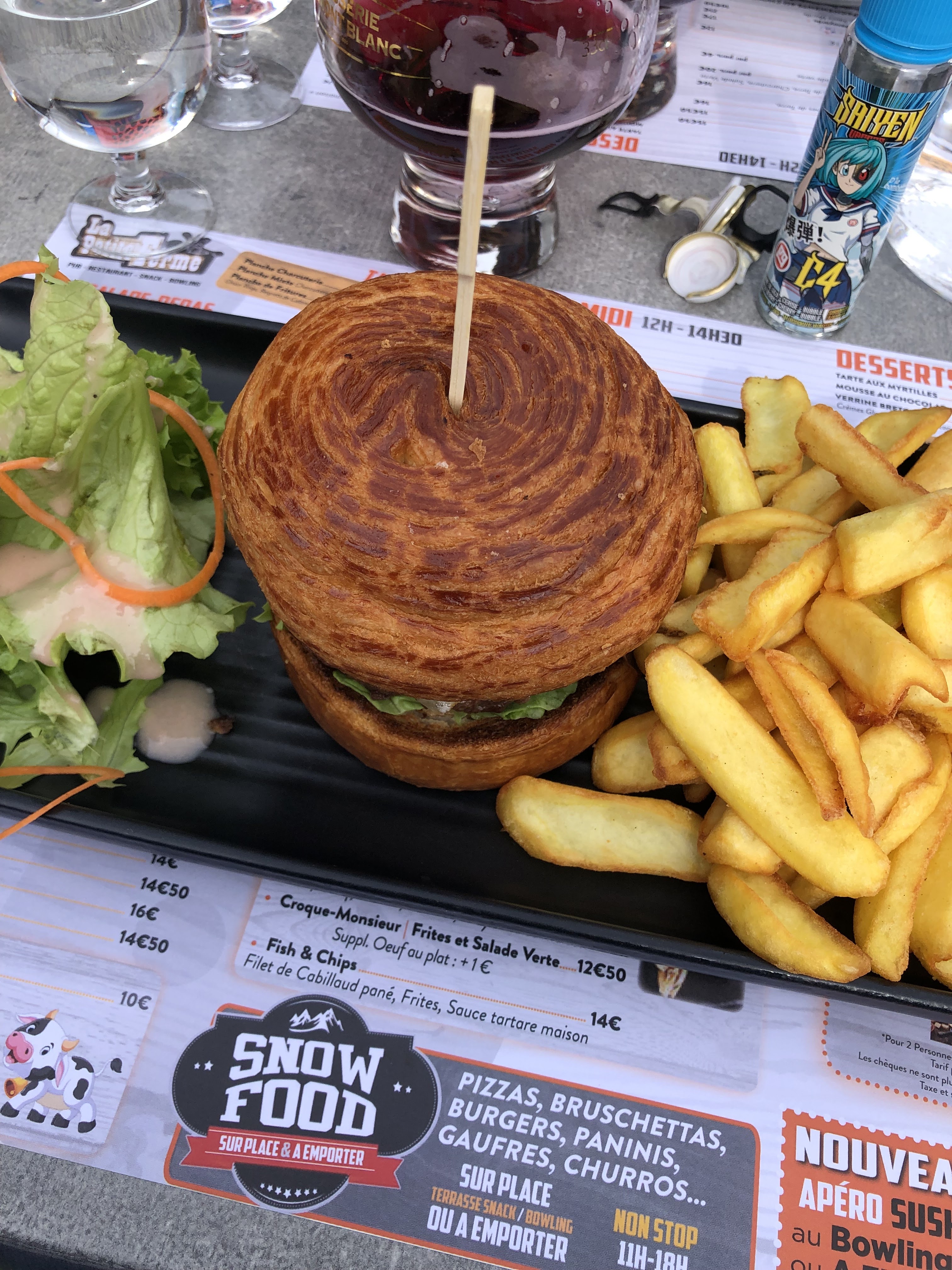 Nous avons été très surpris comme il s agit du restaurant collé au bowling on s attendait à un snack et pas du tout. C est un très bon restaurant. Ça nous a bcp plu. Le personnel est très sympa. Les burgers sont top de chez top et les frites doivent être faites maison car c était un délice. Monsieur Mc Do peut changer de métier car il a trouvé son maître. Les glaces trop bonnes et la présentation sympa. Je recommande. Question prix burgers frites 19 euros+ glace énorme 8. C est très correct vu la qualité et la quantité.