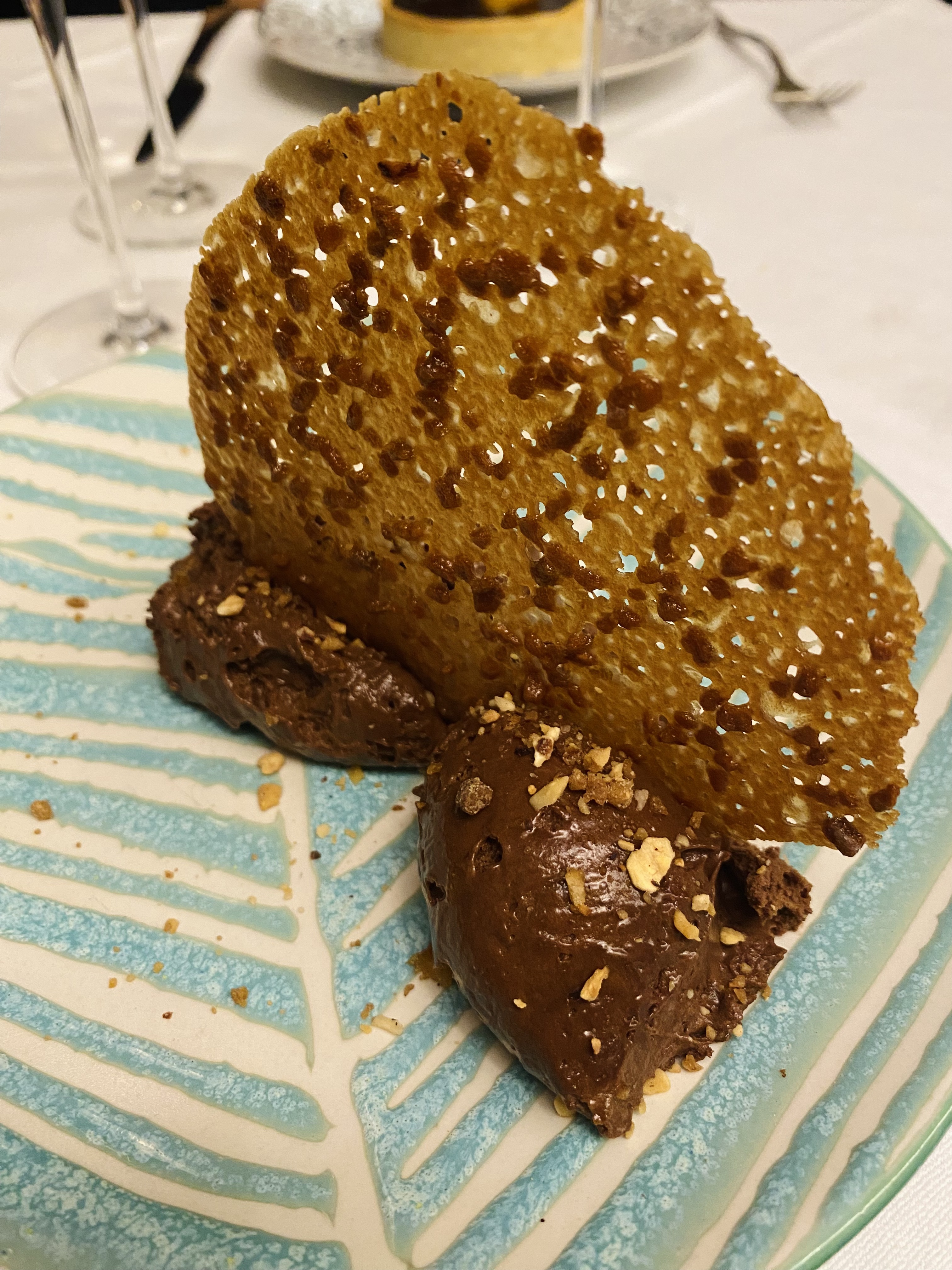 Cher si cela doit être pris en compte pour vous. Avec une bouteille de vin, cela coûtait 160€ pour deux avec deux plats chacun. Mon plat principal était de la sole, ce qui était génial. Des saveurs très subtiles éclataient avant même que le serveur n'atteigne la table. La Mousse Chocolat était tout aussi bonne et était accompagnée d'un morceau de gaufre joliment caramélisée. Les noix étaient bien réparties. Globalement, aucune déception sur la qualité mais aussi sur la présentation (que bien sûr on n'en attend pas moins de ces restaurants). J'ai senti que l'espace était un peu étroit avec des tables rapprochées. Jusqu'à ce que vous vous y habituiez, vous aurez peut-être le sentiment de renoncer à votre vie privée et aurez tendance à garder consciemment la voix basse.