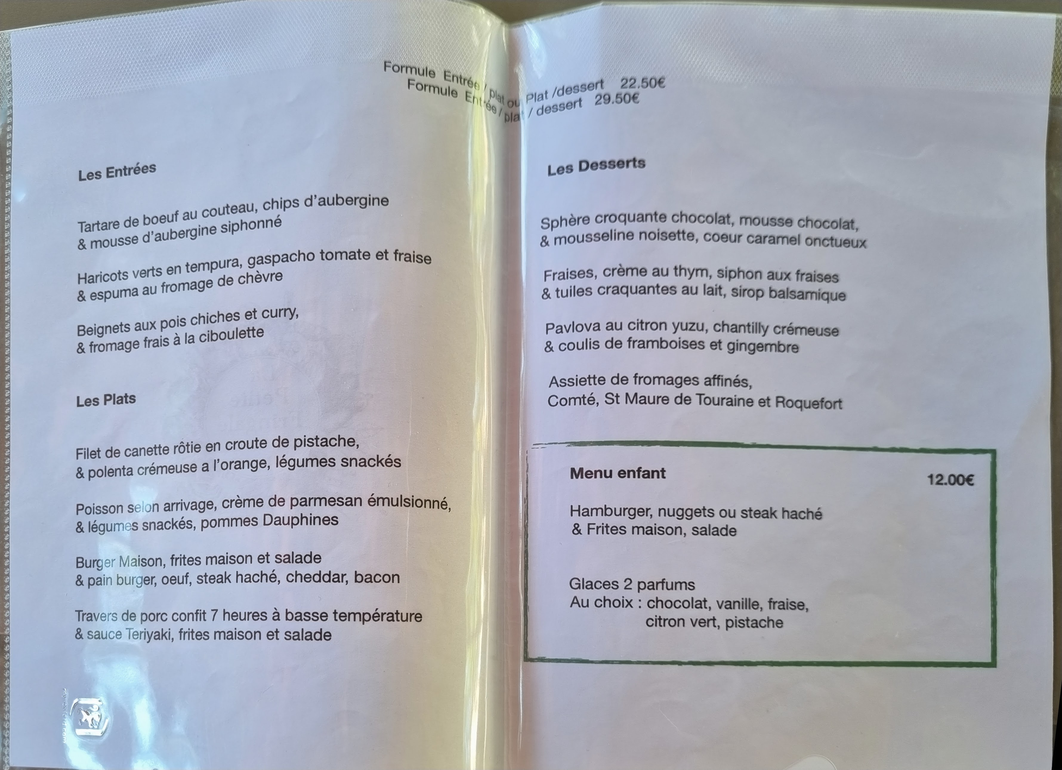 Menu de saison renouvelé tous les trimestres, excellent de l’entrée au dessert, service rapide et agréable je le recommande