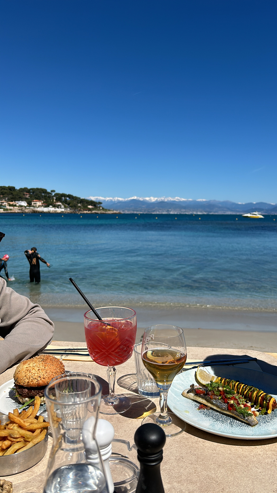 Un endroit enchanteur que je conseille vraiment...déjà sur la plage de la garoupe, la mer, les bateaux, la rade de Nice et les montagnes en face...ensuite, service parfait, rapide et souriant ! Plats excellents ainsi que le vin...Le tout pour un prix vraiment plus que correct...environ 40€/personne. Reservation conseillée. Je recommande vivement!
