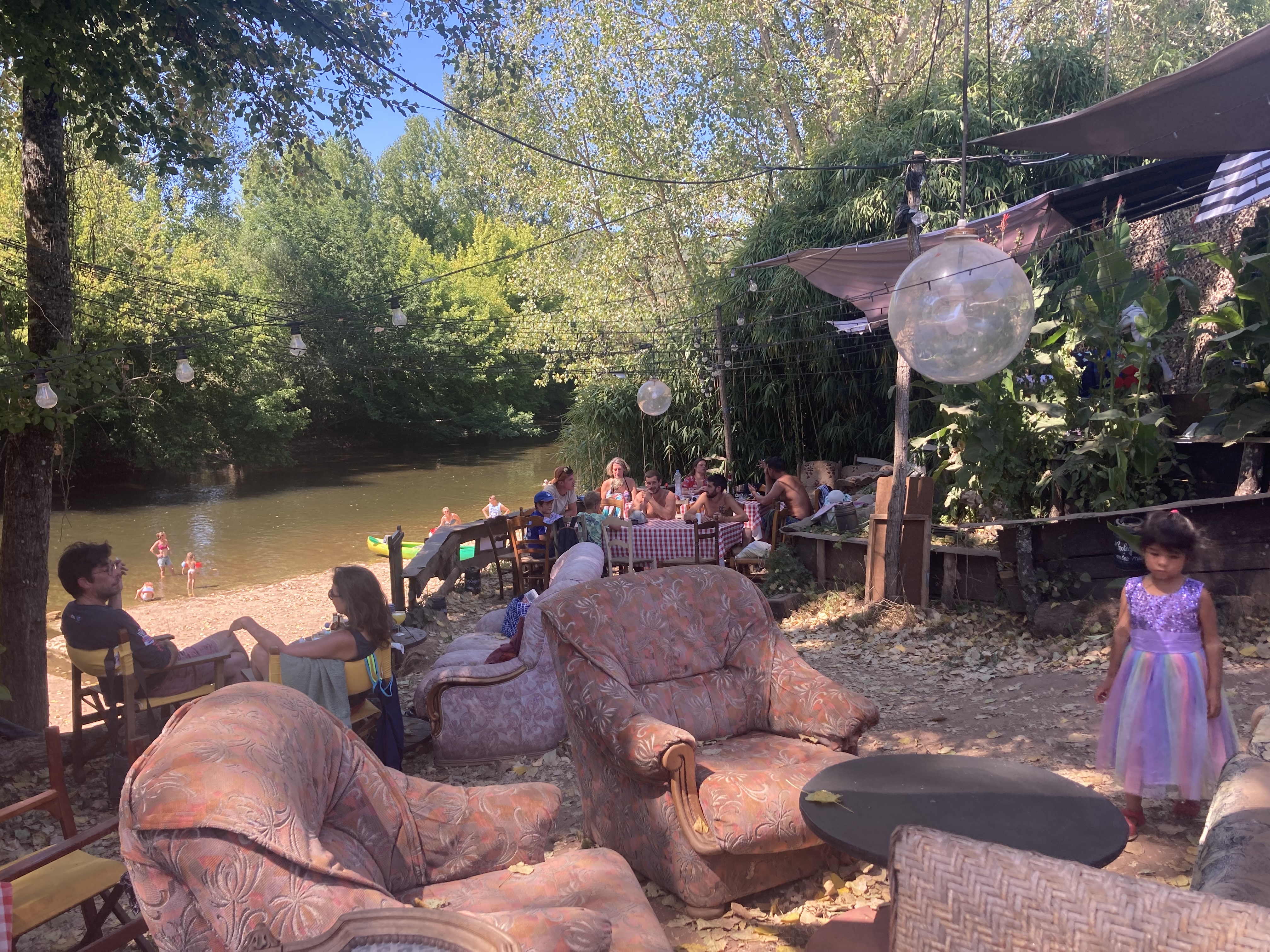lieu original et vrai ...au bord de la riviere pour faire un plouf dedans...simple et populaire avec une déco et des canapés qui ont vécus...ambiance bar de plage Robinson.. du bout du monde...le village est très bobo mais il reste un lieu avec une âme !! pourvu que ça dure !!