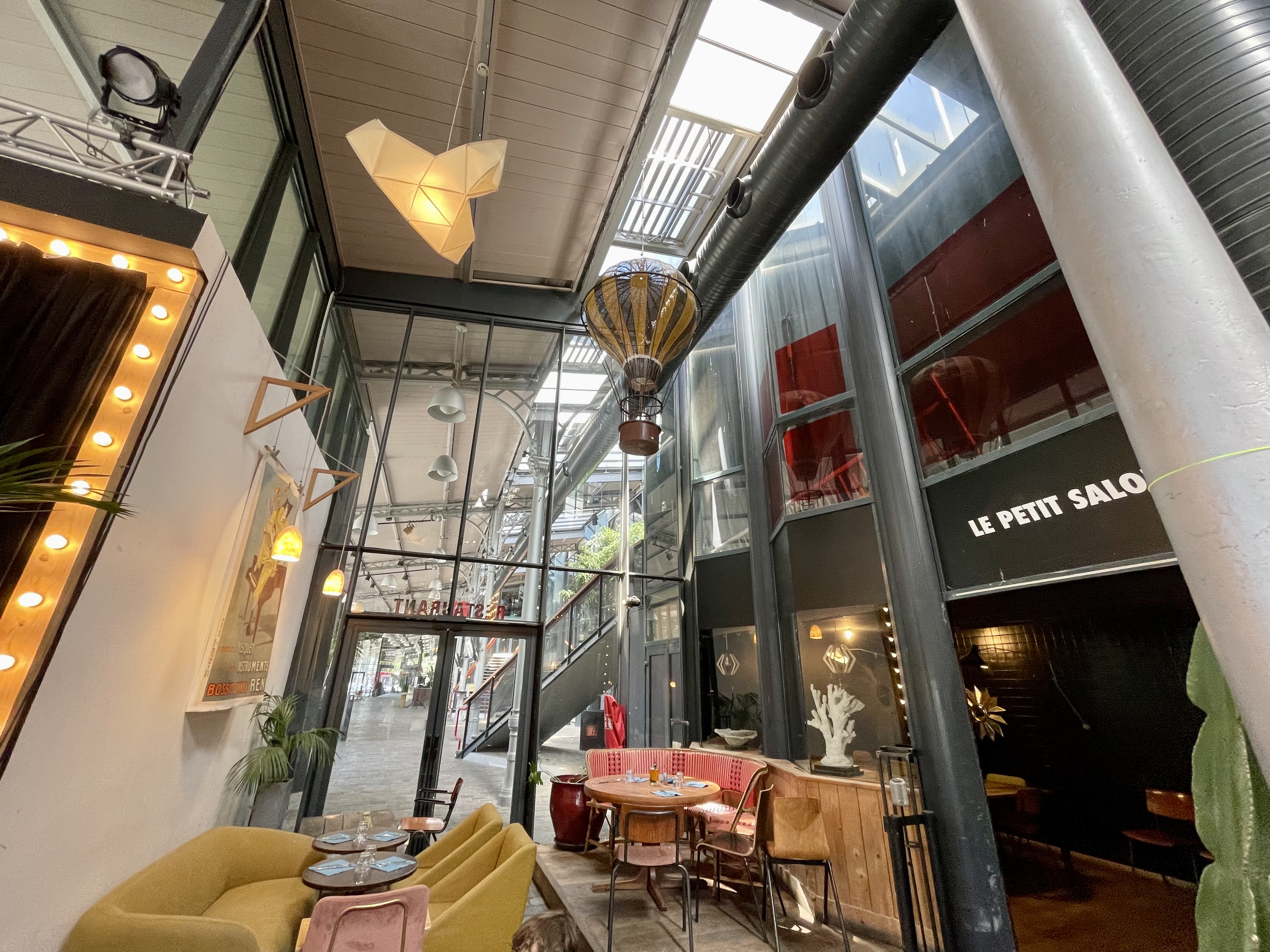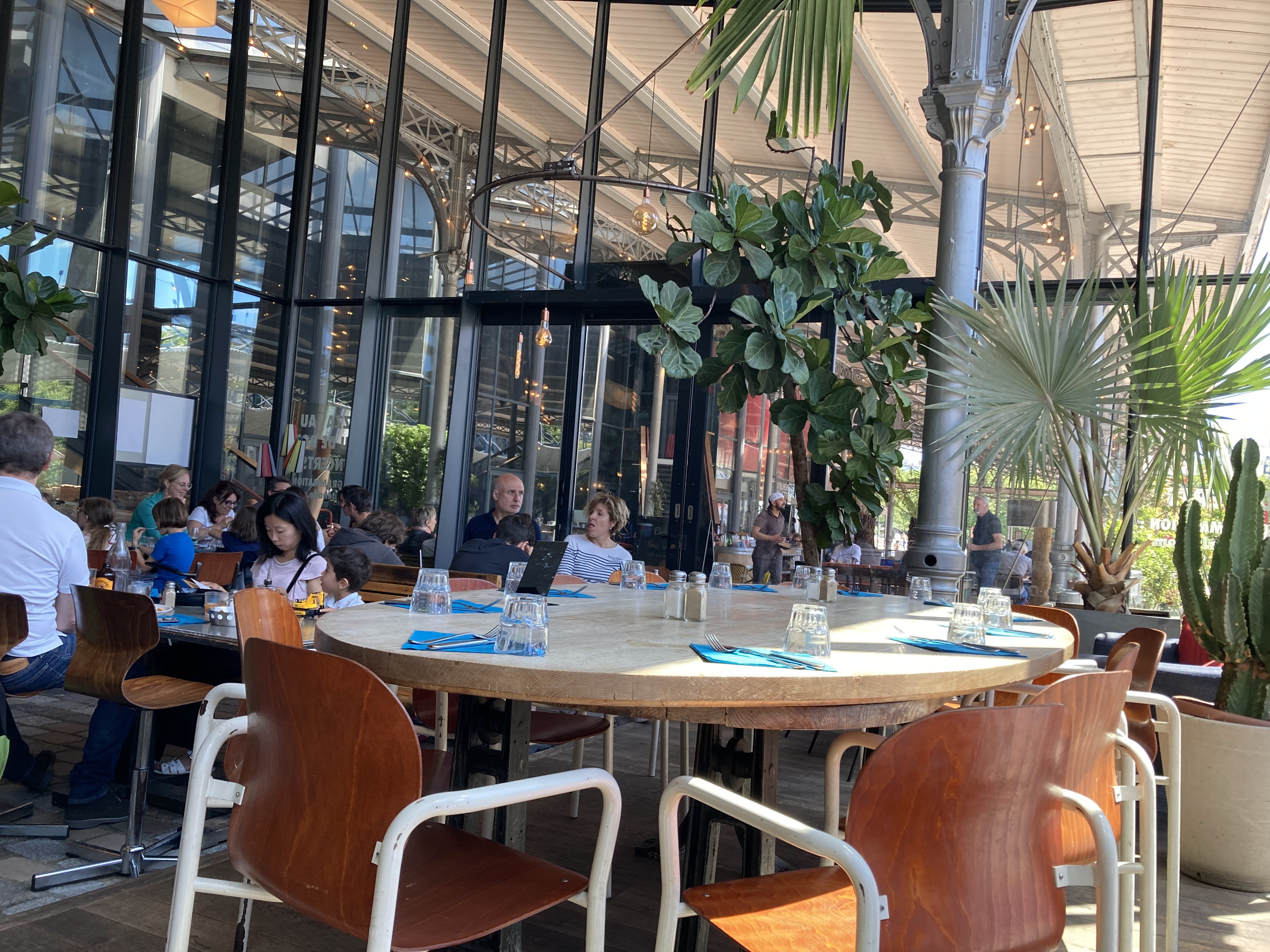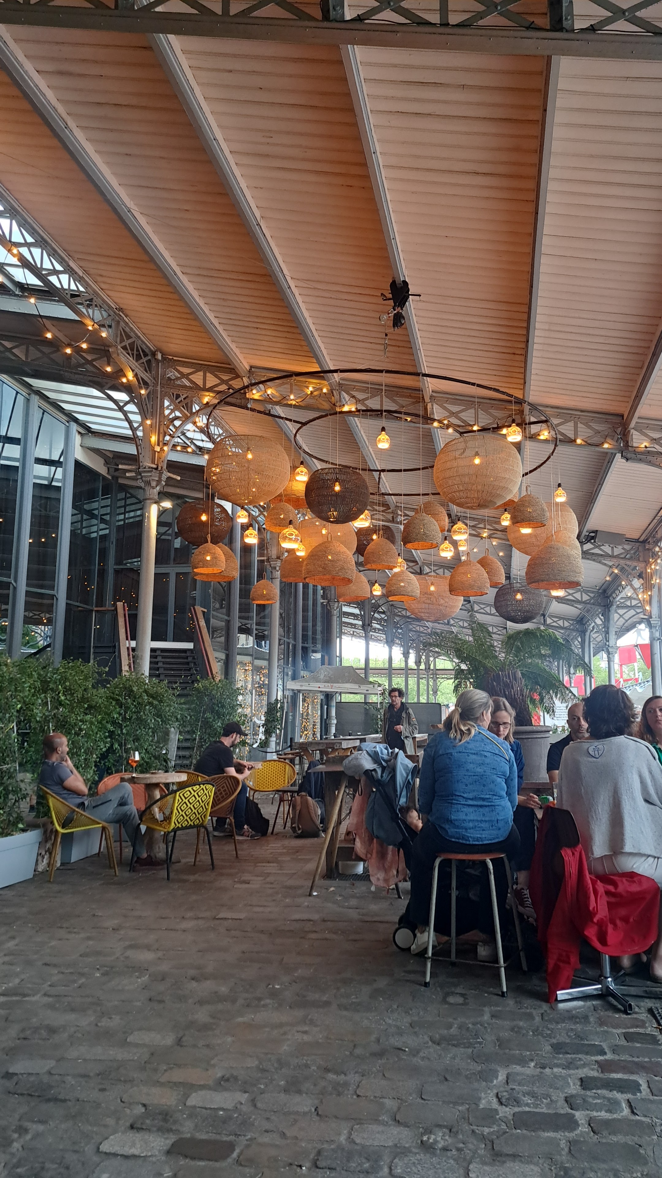 Belle salle, hauteur sous plafond, sol pavé. Joliment décoré. Possibilité de privatiser un petit salon. Nous y sommes allés en famille à l'heure de l'apéro et avons pu commander des pizzas faites du four, assez bonnes (un peu chère quand même - Parisienne jambon/fromage/champignons 16,50€) Une répétition d'un artiste se déroulait et cela nous a permis d'écouter de la musique. Attention : commande au bar Endroit très kids frindly car les enfants peuvent jouer et courir sans trop déranger. Personnel très accueillant et gentils. Pour être tranquille, une belle terrasse sous le toit de la grand halle est disponible. Propose un brunch avec des pizzas (et autre buffet) à volonté le dimanche pour <35€. Sous réservation ---> hâte de le tester et vous en dire davantage !