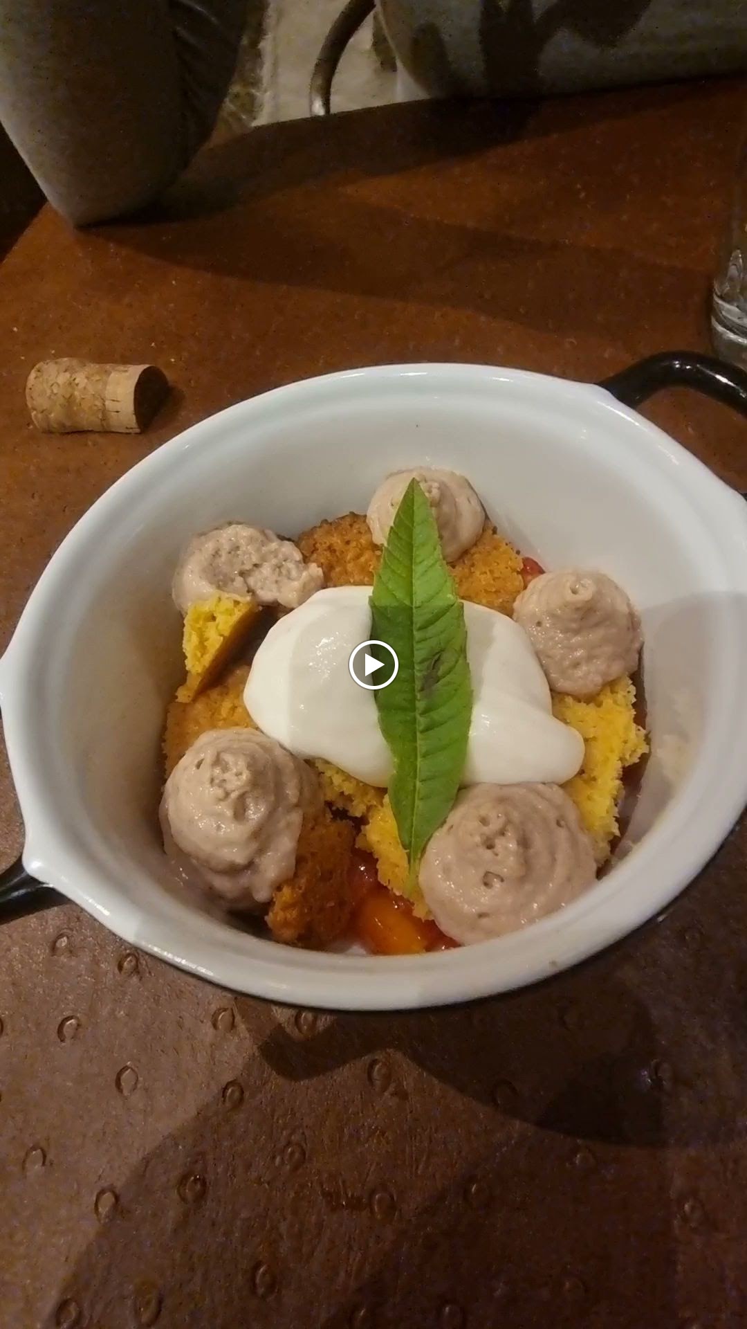 Déjeuner en terrasse. Mise en bouche puis magret de canard délicieux . Les rissoles pommes myrtilles originales et bonnes. Lulu est très sympathique . A refaire . Anne Marie