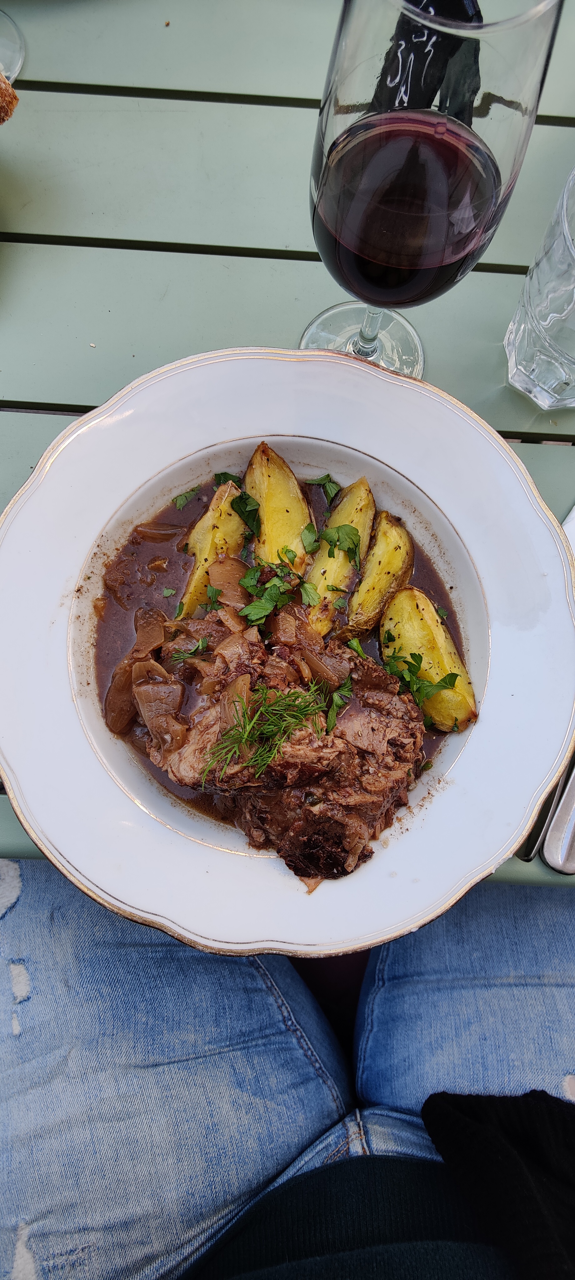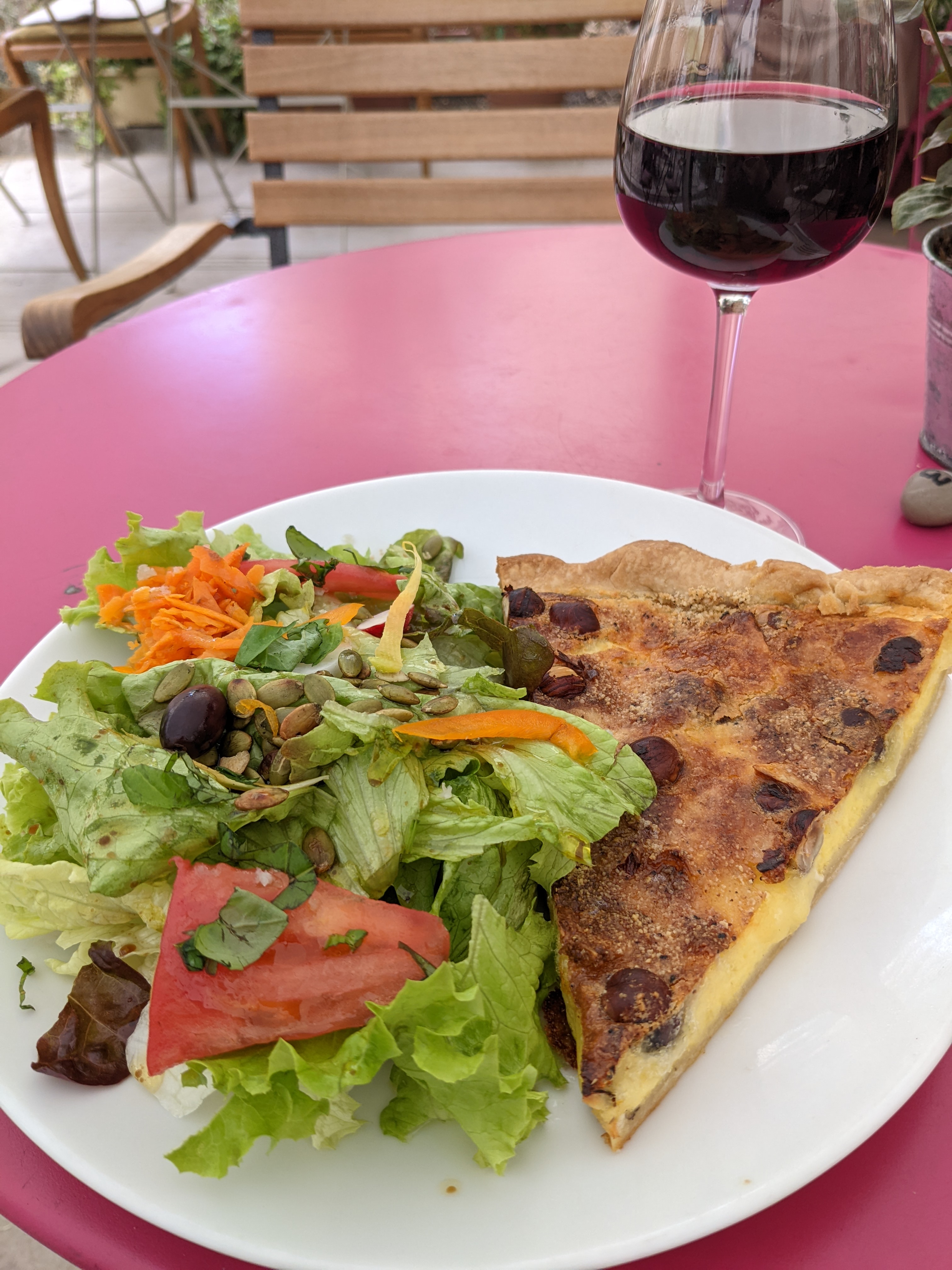 Un parfait petit café dans la cour. Ambiance merveilleuse, excellent service, vin délicieux. Des coulées généreuses.