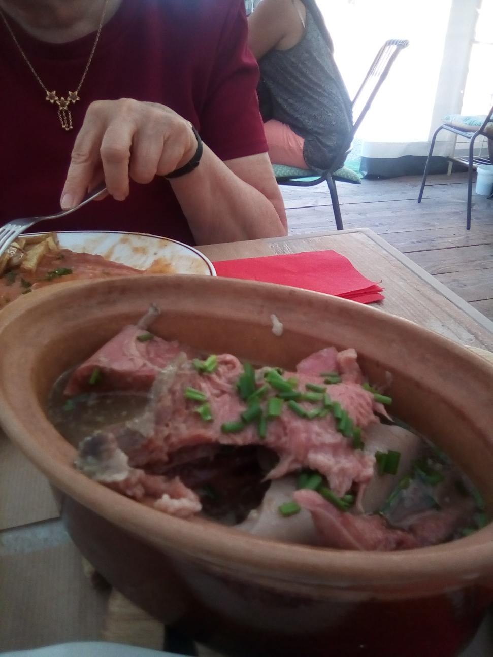 Nous avons été accueillis très chaleureusement par les propriétaires du restaurant, même si nous y sommes arrivés très tôt selon les standards français. Le maître de maison devait même arriver avec les courses pour ce soir-là. 😀 Les enfants se sont bien amusés en jouant sur la terrasse, il y avait un grand coffre de jouets pour eux. La nourriture était correcte compte tenu du prix. Le steak (20 euros) cher mais bon. Le gâteau aux fraises excellent. Pas de légumes, juste des frites très assaisonnées. Bref, un endroit où l'on peut s'arrêter pour manger un morceau. Mais ne vous attendez pas à des délices culinaires. À mon avis, le rapport qualité/prix est un peu disproportionné.