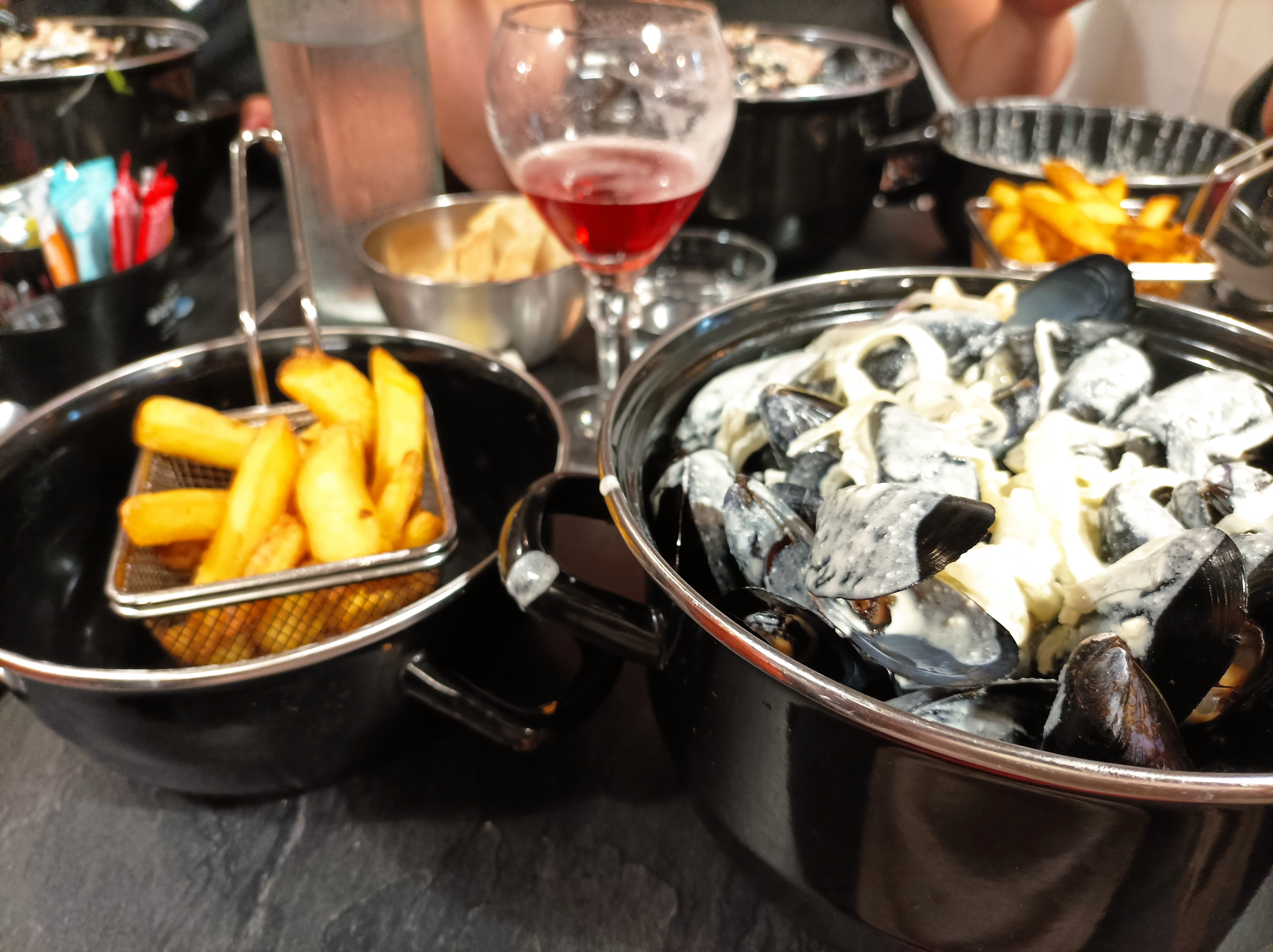 Nous avons mangé des moules marinières et la salade au camembert. Les moules avaient très peu de goût. Les frites sont servies en petite quantité. Quant à l'assiette camembert, c'était correct. Nous avons trouvé dommage de boire des boissons cannettes et d'avoir des sauces en sachet individuel. Le service était cependant très bien. Heureusement, le prix correspond à la qualité.