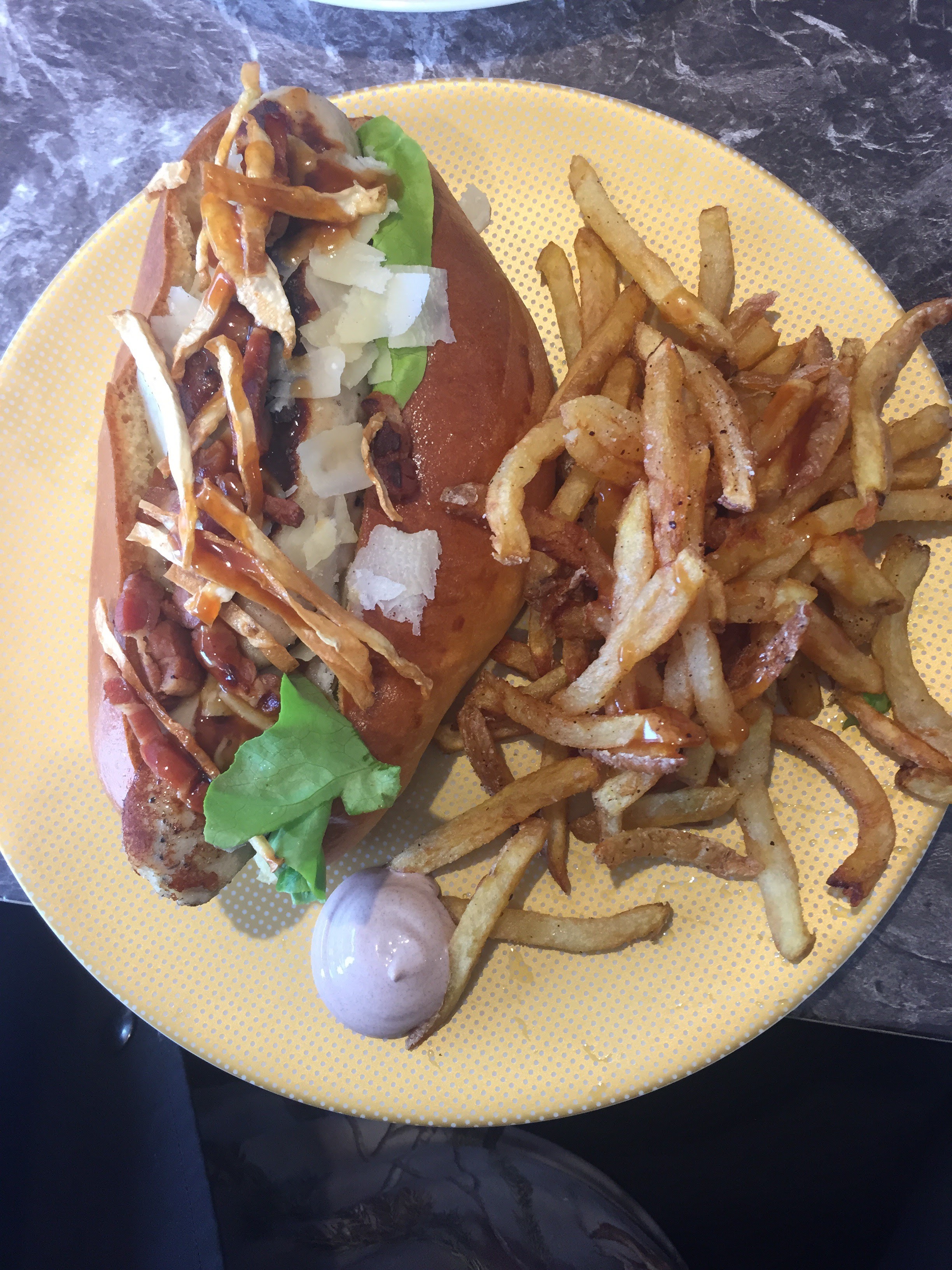 Plus que déçus. Des frites aussi dur que de la pierre. Un hot dog d'une valeur de 10x son prix en produits, sans goût et gros pour trop peu de prduits à l'interieur. Une saucisse, 3frites mal cuites et du pain brioché le tout pour 10€ et certains osent dire qur la fourchette de prix est correct ? La nourriture se mange avec envie, pas pour être différent des autres oùà la mode.